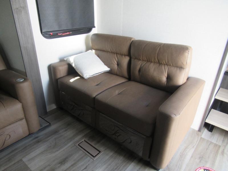 An elegant design and new features come with every one of these Venture RV SportTrek Touring Edition fifth wheels! The NXG Huck bolt frame holds these units together and Tufflex PVC roofing covers them. Heads will turn down the highway and at the campsite with the frameless tinted windows and high gloss fiberglass front cap with automotive paint. The exterior pass-through storage area has slam latch baggage doors with magnetic catches so you don't have to worry about them closing on you and LED lighting on the electric awning so you can see clearly even at night. Luxury abounds throughout these units, especially with the two fireplaces, solid surface kitchen countertops, blackout roller shades, and maximum storage designs. Come find your favorite model today!