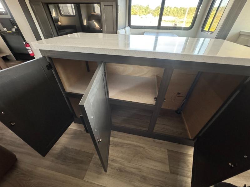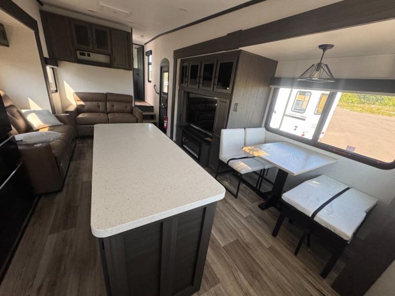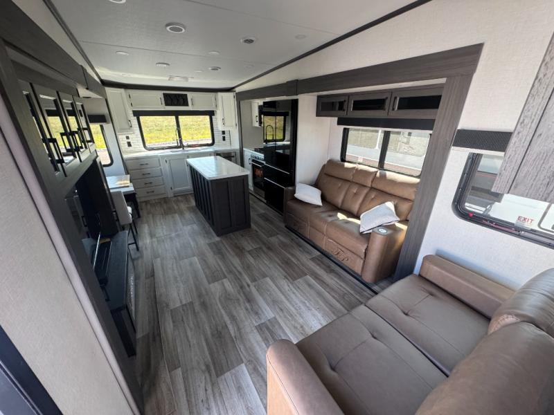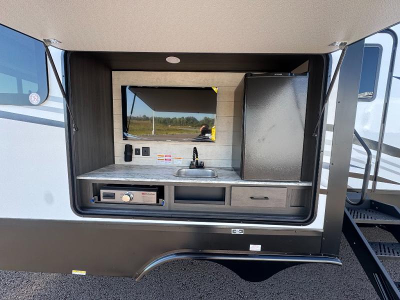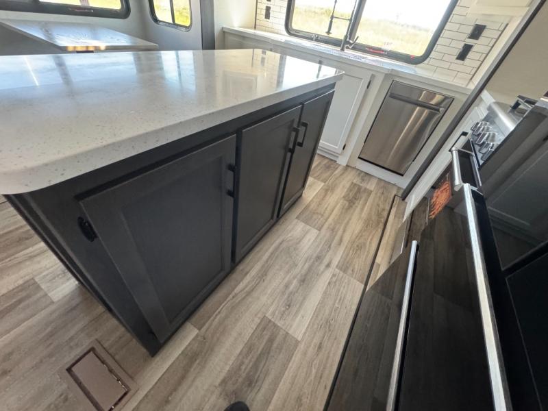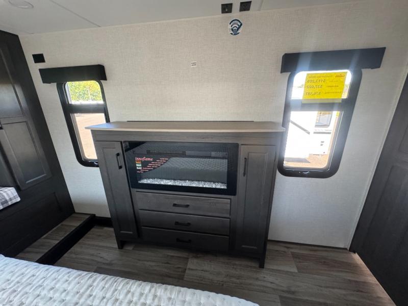 The chef will love cooking in the rear kitchen of this fifth wheel! The front private bedroom has a Serta king mattress to lay your head on at night, a window seat to comfortably read a book while enjoying the 5,000 BTU fireplace, a shelf storage closet, and a prepped area for a washer and dryer. Freshen up each morning with the 48" fiberglass shower with a seat in the full bathroom then head down the floating steps with shoe storage to whip up a delicious breakfast. The fully equipped kitchen even comes with a 18" GE stainless steel dishwasher at the rear sink with countertops on either side for easy clean up. Enjoy your meals at the table with two chairs and two Versa benches. You could even cook at the outside campfire cafe with the griddle. Inside the middle living area, you will find a tri-fold sofa with overhead cabinets and theater seating with USB charging across from the entertainment center with a 5,000 BTU fireplace!