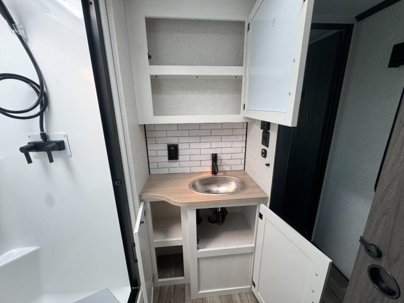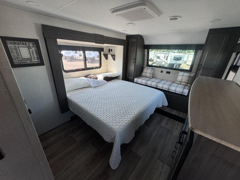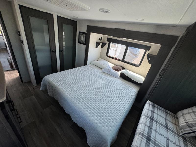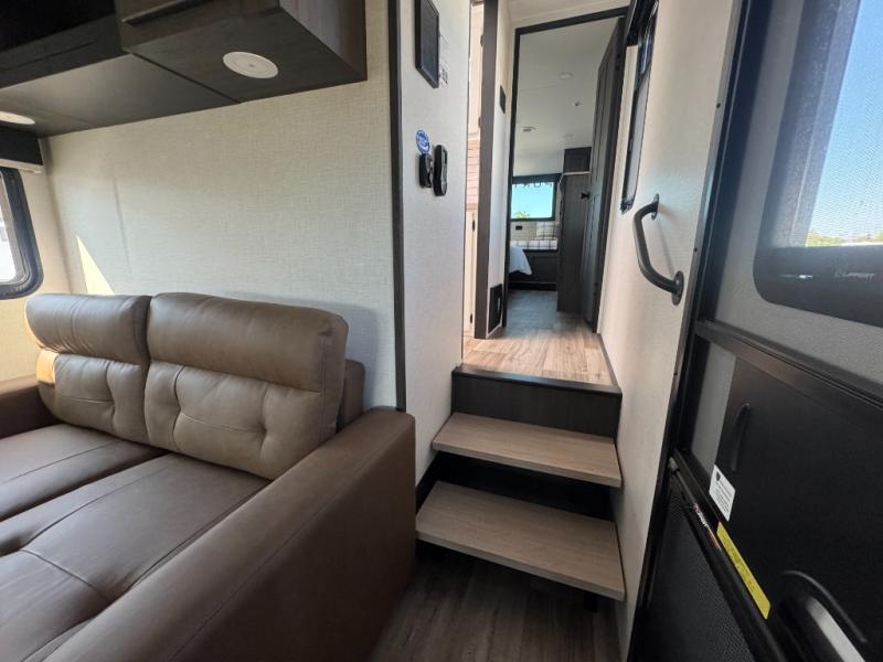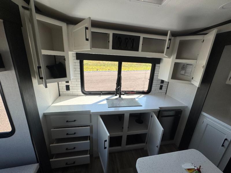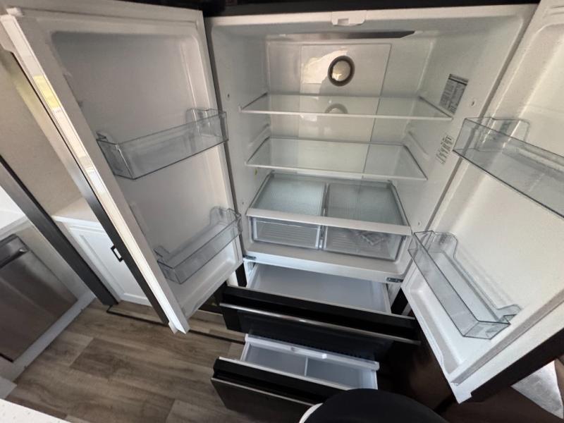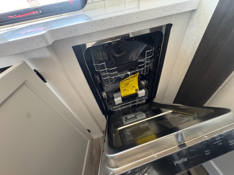 The chef will love cooking in the rear kitchen of this fifth wheel! The front private bedroom has a Serta king mattress to lay your head on at night, a window seat to comfortably read a book while enjoying the 5,000 BTU fireplace, a shelf storage closet, and a prepped area for a washer and dryer. Freshen up each morning with the 48" fiberglass shower with a seat in the full bathroom then head down the floating steps with shoe storage to whip up a delicious breakfast. The fully equipped kitchen even comes with a 18" GE stainless steel dishwasher at the rear sink with countertops on either side for easy clean up. Enjoy your meals at the table with two chairs and two Versa benches. You could even cook at the outside campfire cafe with the griddle. Inside the middle living area, you will find a tri-fold sofa with overhead cabinets and theater seating with USB charging across from the entertainment center with a 5,000 BTU fireplace!