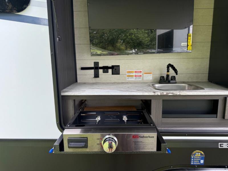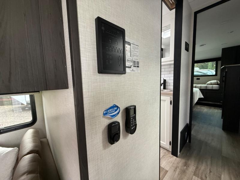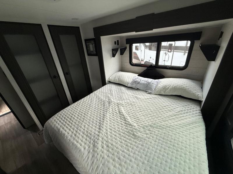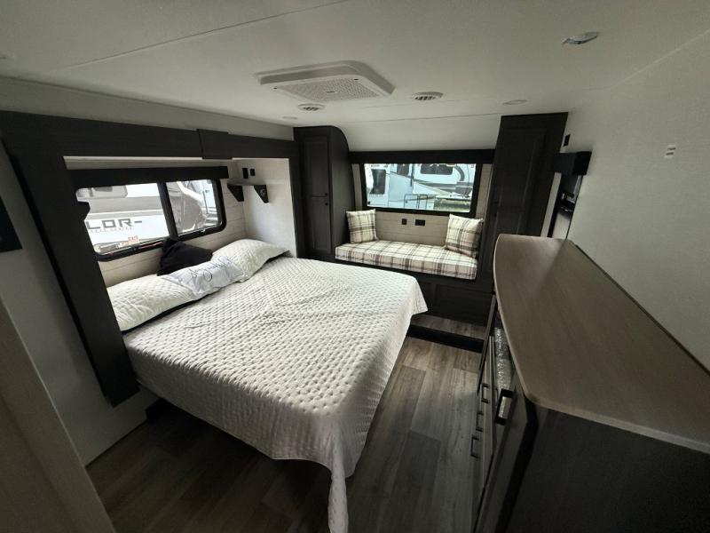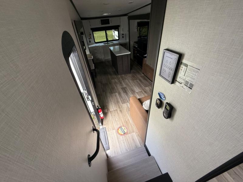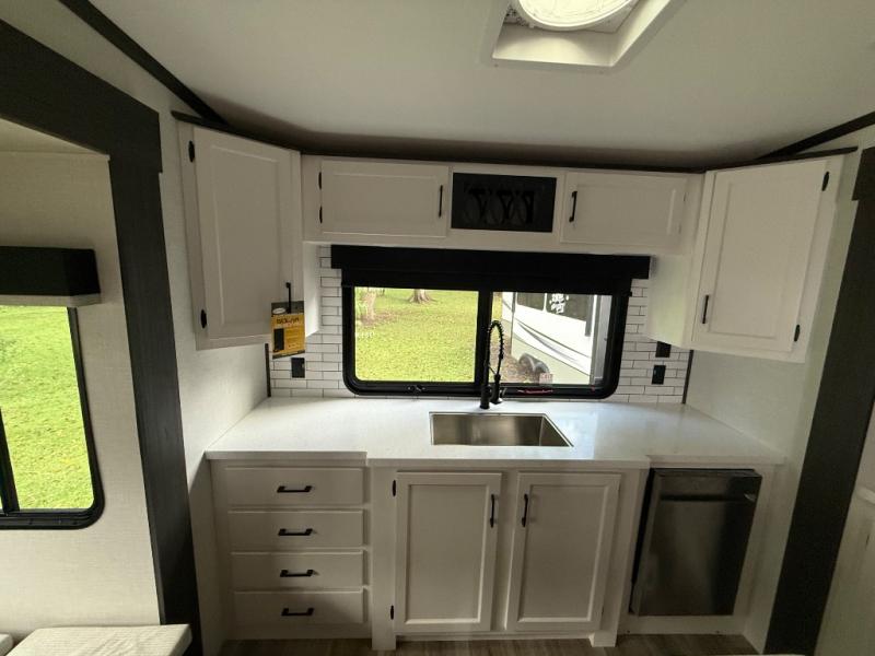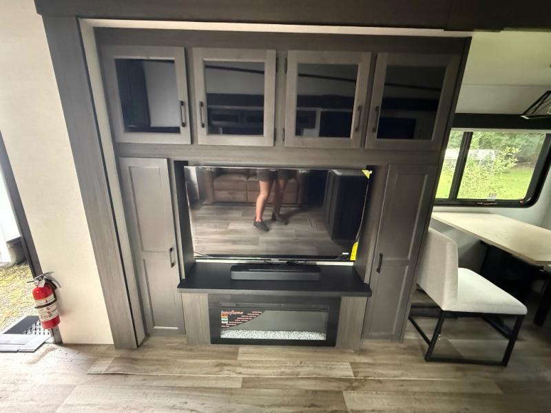 The chef will love cooking in the rear kitchen of this fifth wheel! The front private bedroom has a Serta king mattress to lay your head on at night, a window seat to comfortably read a book while enjoying the 5,000 BTU fireplace, a shelf storage closet, and a prepped area for a washer and dryer. Freshen up each morning with the 48" fiberglass shower with a seat in the full bathroom then head down the floating steps with shoe storage to whip up a delicious breakfast. The fully equipped kitchen even comes with a 18" GE stainless steel dishwasher at the rear sink with countertops on either side for easy clean up. Enjoy your meals at the table with two chairs and two Versa benches. You could even cook at the outside campfire cafe with the griddle. Inside the middle living area, you will find a tri-fold sofa with overhead cabinets and theater seating with USB charging across from the entertainment center with a 5,000 BTU fireplace!