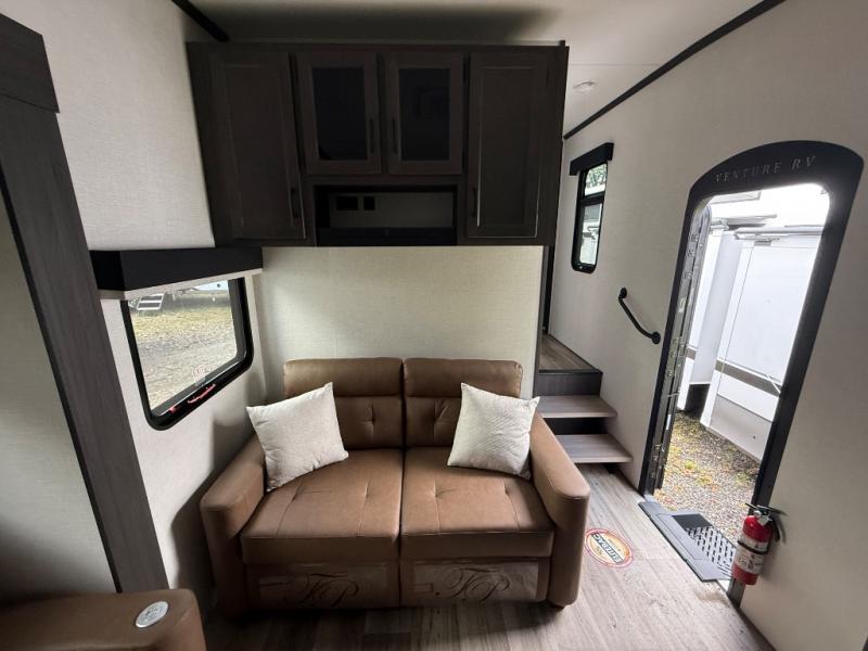 An elegant design and new features come with every one of these Venture RV SportTrek Touring Edition fifth wheels! The NXG Huck bolt frame holds these units together and Tufflex PVC roofing covers them. Heads will turn down the highway and at the campsite with the frameless tinted windows and high gloss fiberglass front cap with automotive paint. The exterior pass-through storage area has slam latch baggage doors with magnetic catches so you don't have to worry about them closing on you and LED lighting on the electric awning so you can see clearly even at night. Luxury abounds throughout these units, especially with the two fireplaces, solid surface kitchen countertops, blackout roller shades, and maximum storage designs. Come find your favorite model today!