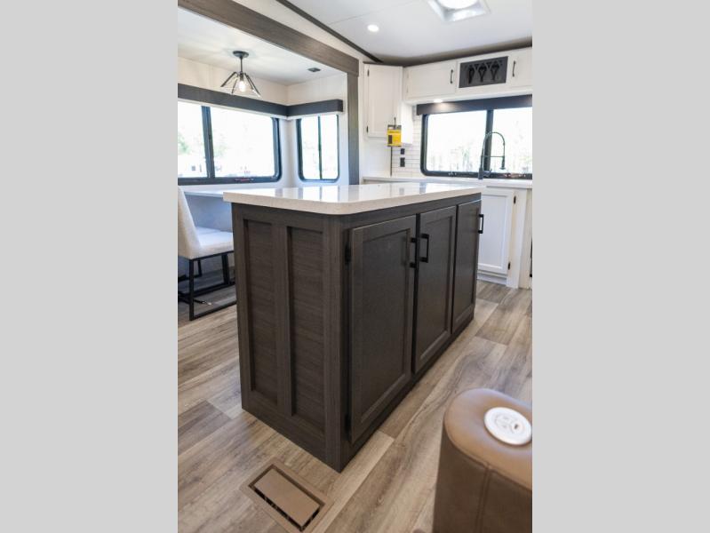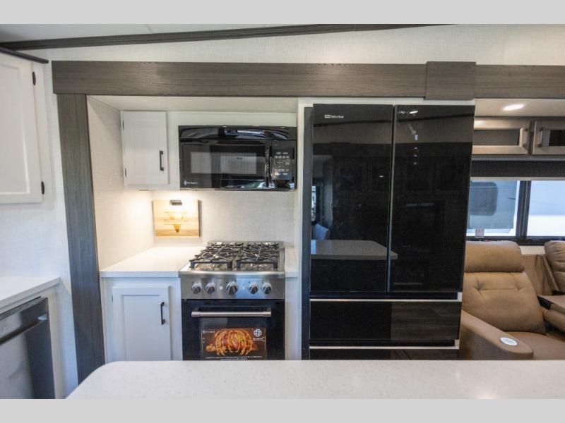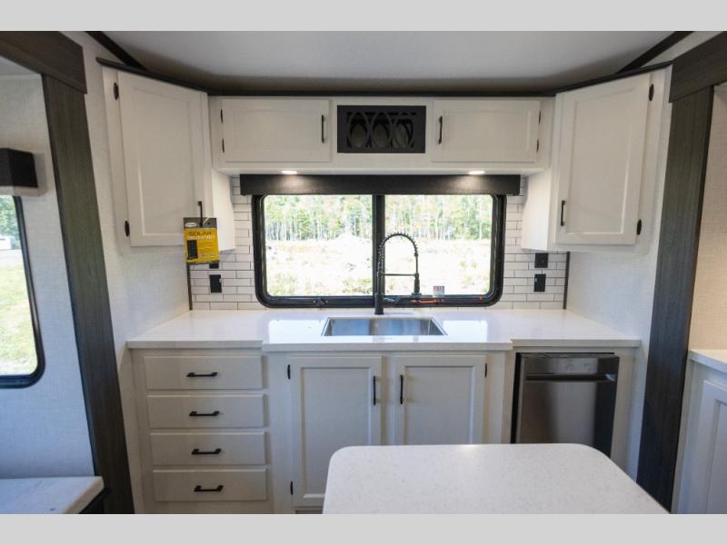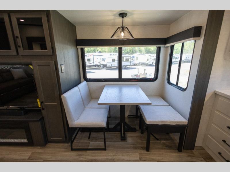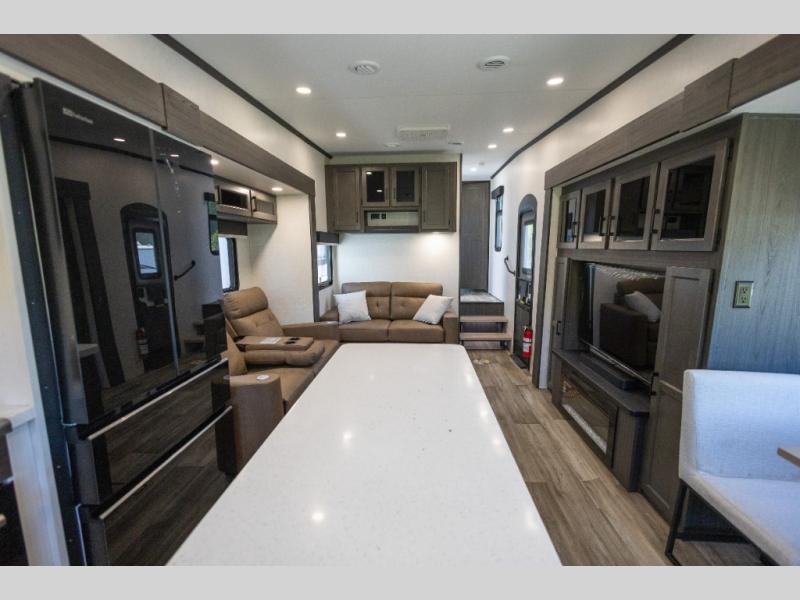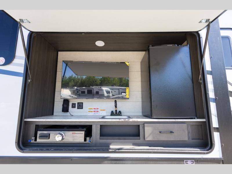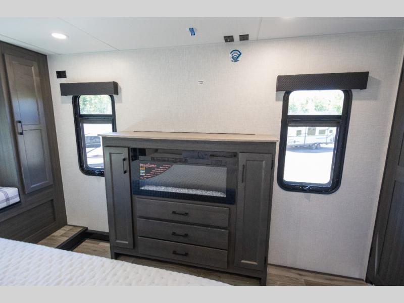 The chef will love cooking in the rear kitchen of this fifth wheel! The front private bedroom has a Serta king mattress to lay your head on at night, a window seat to comfortably read a book while enjoying the 5,000 BTU fireplace, a shelf storage closet, and a prepped area for a washer and dryer. Freshen up each morning with the 48" fiberglass shower with a seat in the full bathroom then head down the floating steps with shoe storage to whip up a delicious breakfast. The fully equipped kitchen even comes with a 18" GE stainless steel dishwasher at the rear sink with countertops on either side for easy clean up. Enjoy your meals at the table with two chairs and two Versa benches. You could even cook at the outside campfire cafe with the griddle. Inside the middle living area, you will find a tri-fold sofa with overhead cabinets and theater seating with USB charging across from the entertainment center with a 5,000 BTU fireplace!