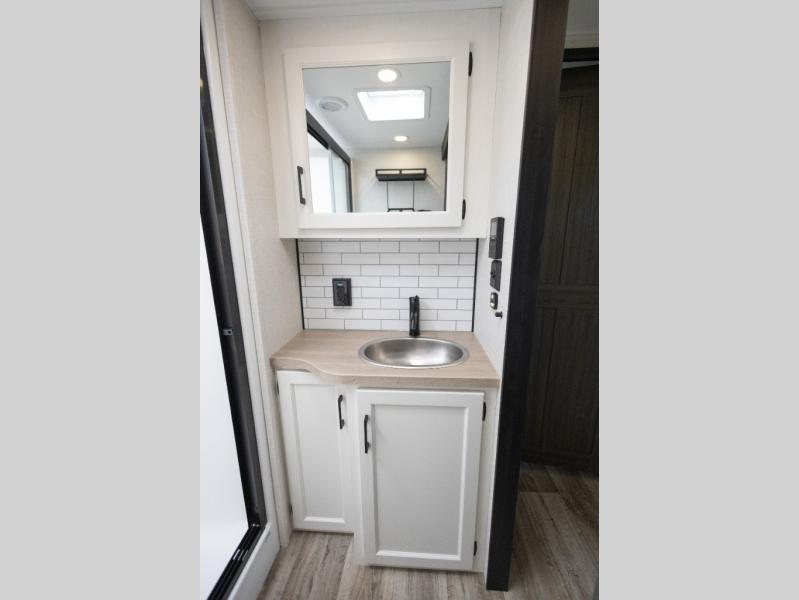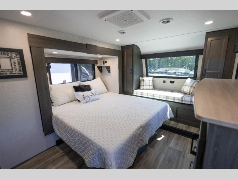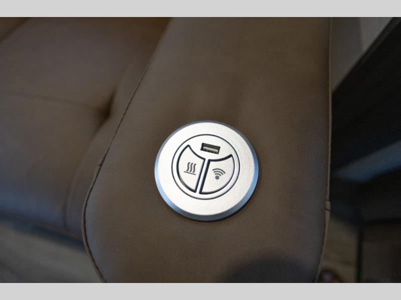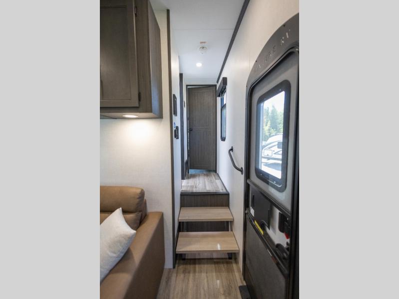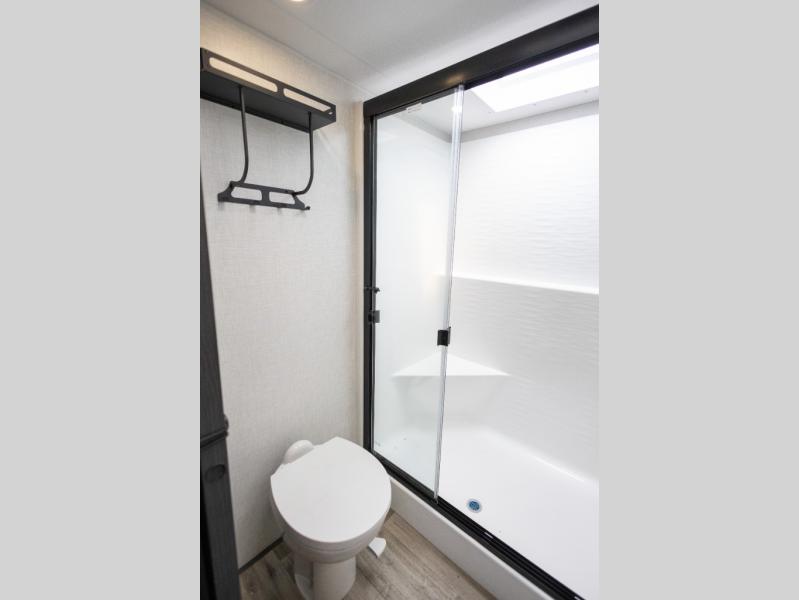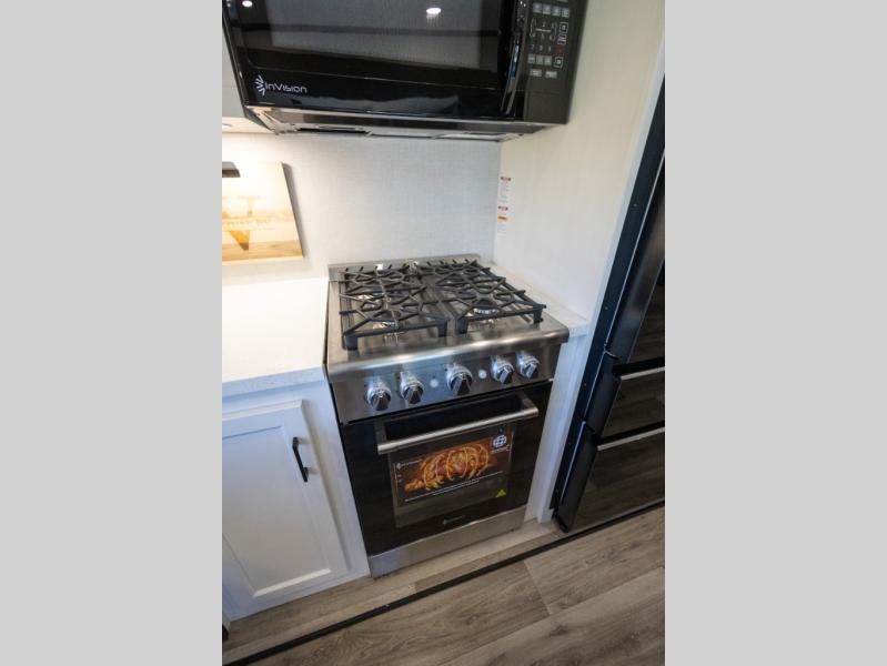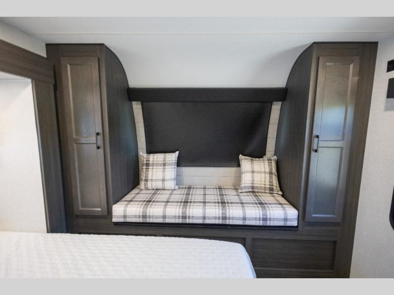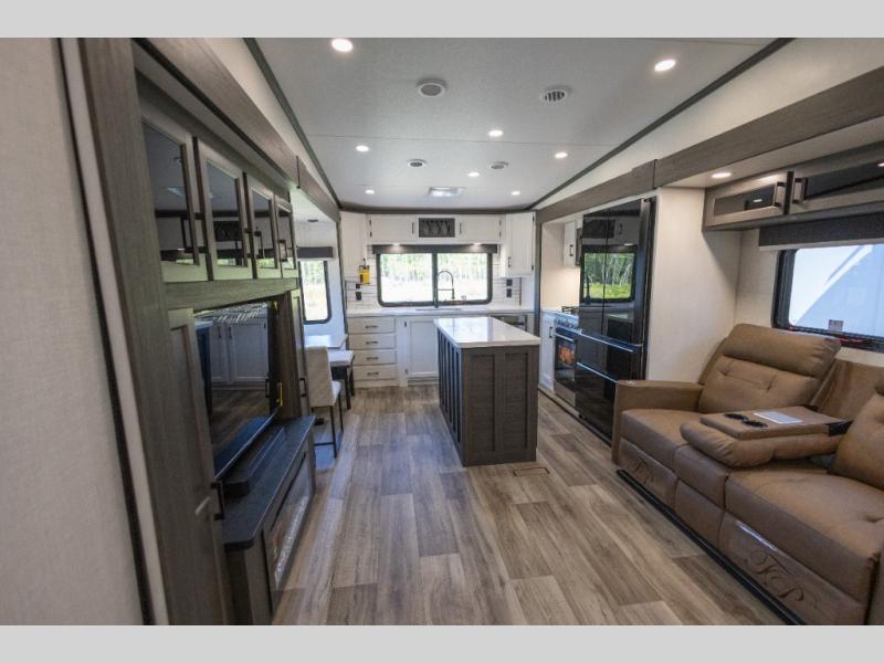 The chef will love cooking in the rear kitchen of this fifth wheel! The front private bedroom has a Serta king mattress to lay your head on at night, a window seat to comfortably read a book while enjoying the 5,000 BTU fireplace, a shelf storage closet, and a prepped area for a washer and dryer. Freshen up each morning with the 48" fiberglass shower with a seat in the full bathroom then head down the floating steps with shoe storage to whip up a delicious breakfast. The fully equipped kitchen even comes with a 18" GE stainless steel dishwasher at the rear sink with countertops on either side for easy clean up. Enjoy your meals at the table with two chairs and two Versa benches. You could even cook at the outside campfire cafe with the griddle. Inside the middle living area, you will find a tri-fold sofa with overhead cabinets and theater seating with USB charging across from the entertainment center with a 5,000 BTU fireplace!