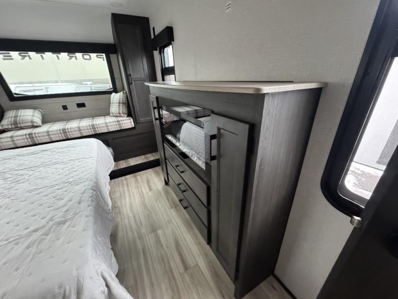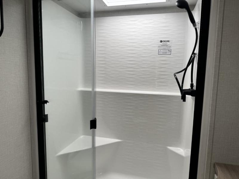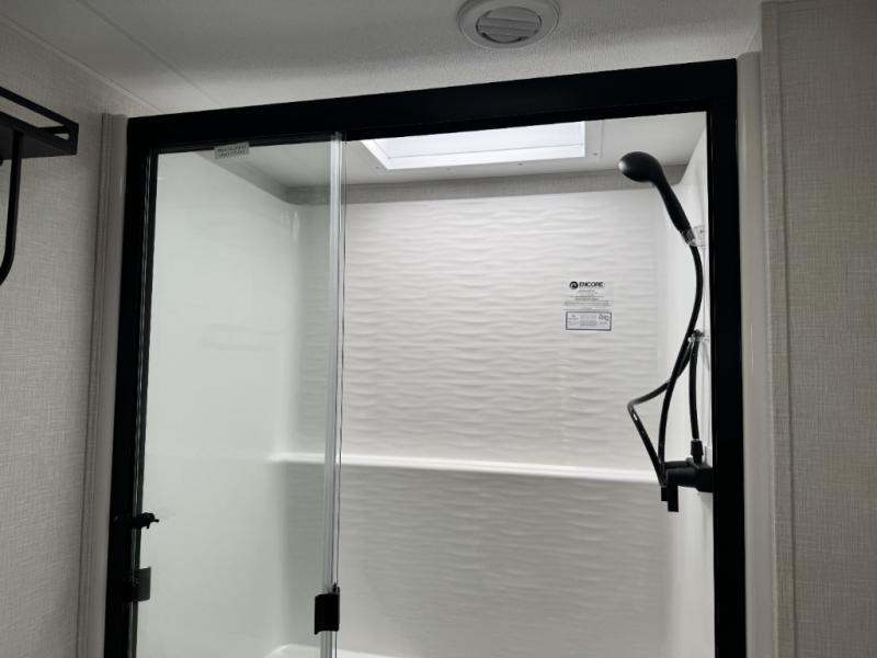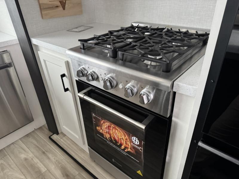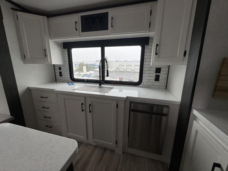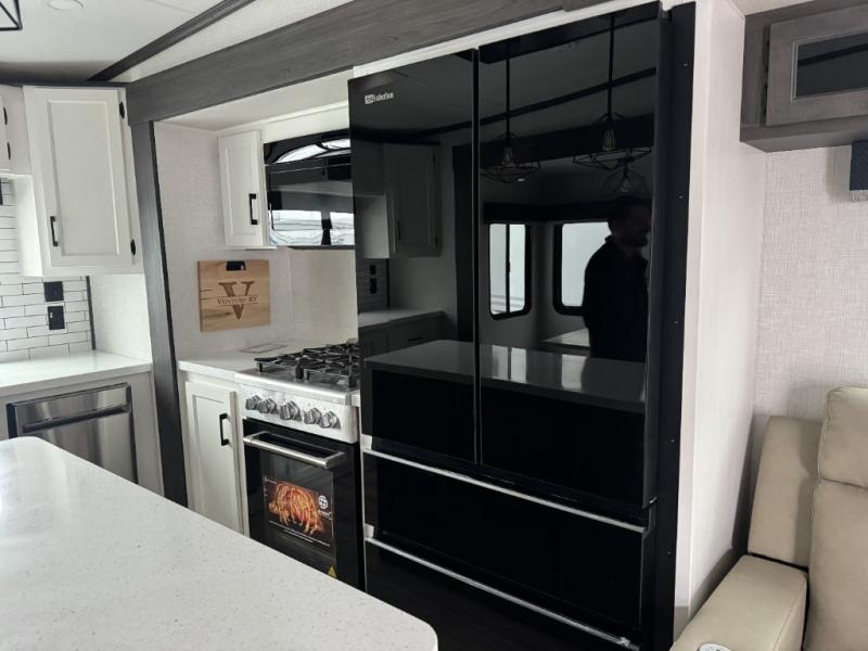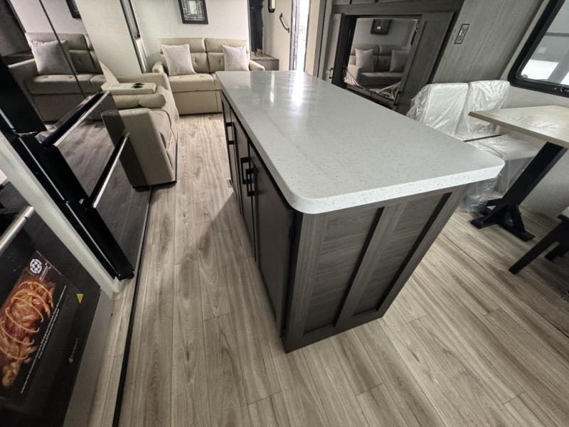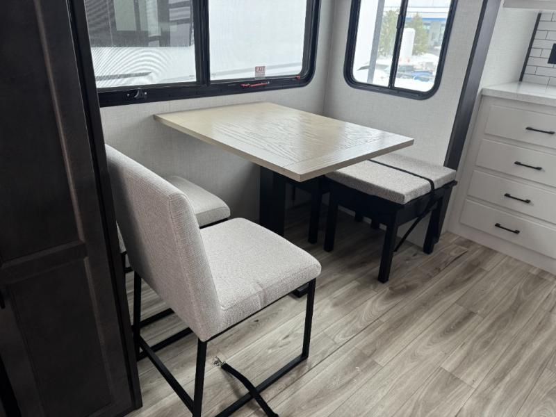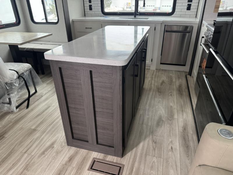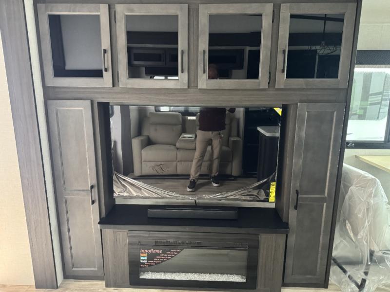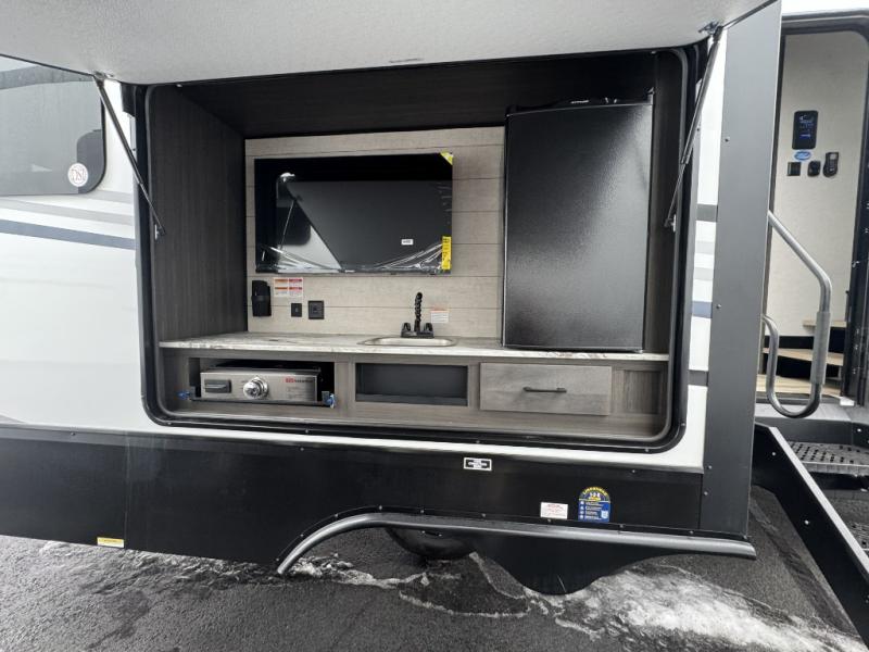 The chef will love cooking in the rear kitchen of this fifth wheel! The front private bedroom has a Serta king mattress to lay your head on at night, a window seat to comfortably read a book while enjoying the 5,000 BTU fireplace, a shelf storage closet, and a prepped area for a washer and dryer. Freshen up each morning with the 48" fiberglass shower with a seat in the full bathroom then head down the floating steps with shoe storage to whip up a delicious breakfast. The fully equipped kitchen even comes with a 18" GE stainless steel dishwasher at the rear sink with countertops on either side for easy clean up. Enjoy your meals at the table with two chairs and two Versa benches. You could even cook at the outside campfire cafe with the griddle. Inside the middle living area, you will find a tri-fold sofa with overhead cabinets and theater seating with USB charging across from the entertainment center with a 5,000 BTU fireplace!