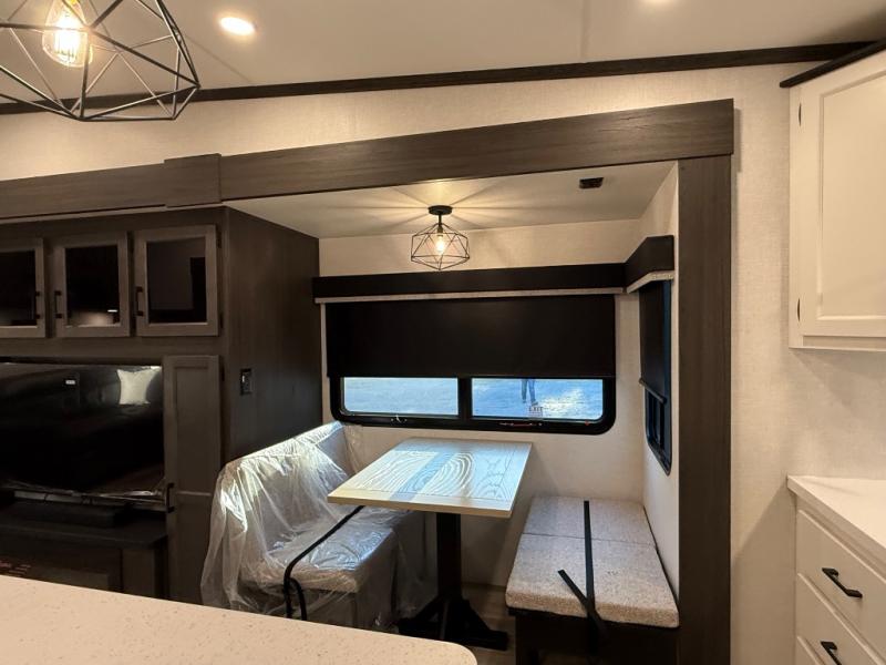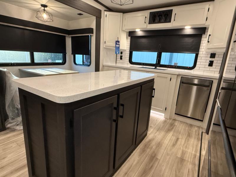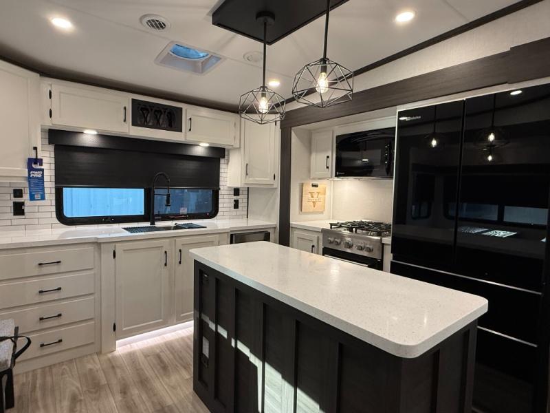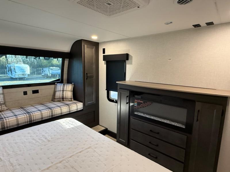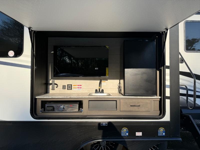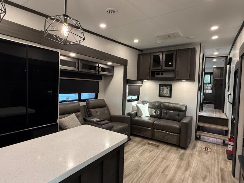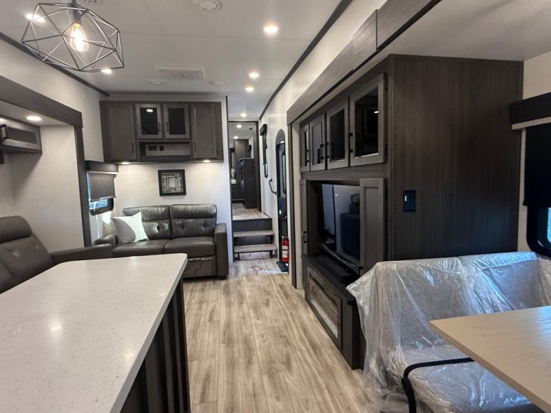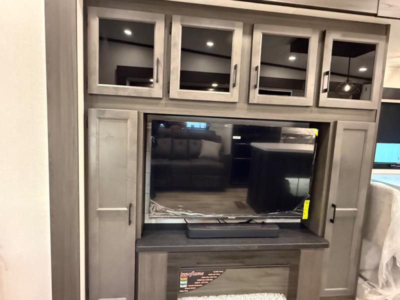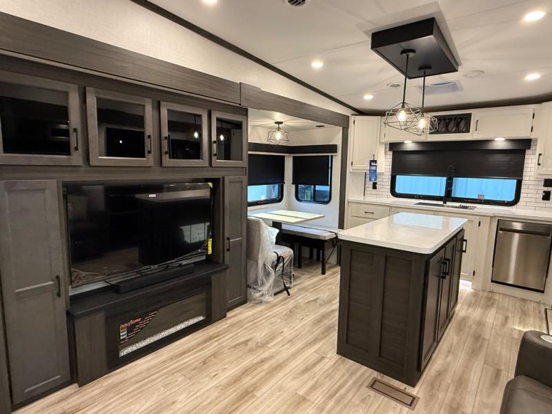 The chef will love cooking in the rear kitchen of this fifth wheel! The front private bedroom has a Serta king mattress to lay your head on at night, a window seat to comfortably read a book while enjoying the 5,000 BTU fireplace, a shelf storage closet, and a prepped area for a washer and dryer. Freshen up each morning with the 48" fiberglass shower with a seat in the full bathroom then head down the floating steps with shoe storage to whip up a delicious breakfast. The fully equipped kitchen even comes with a 18" GE stainless steel dishwasher at the rear sink with countertops on either side for easy clean up. Enjoy your meals at the table with two chairs and two Versa benches. You could even cook at the outside campfire cafe with the griddle. Inside the middle living area, you will find a tri-fold sofa with overhead cabinets and theater seating with USB charging across from the entertainment center with a 5,000 BTU fireplace!