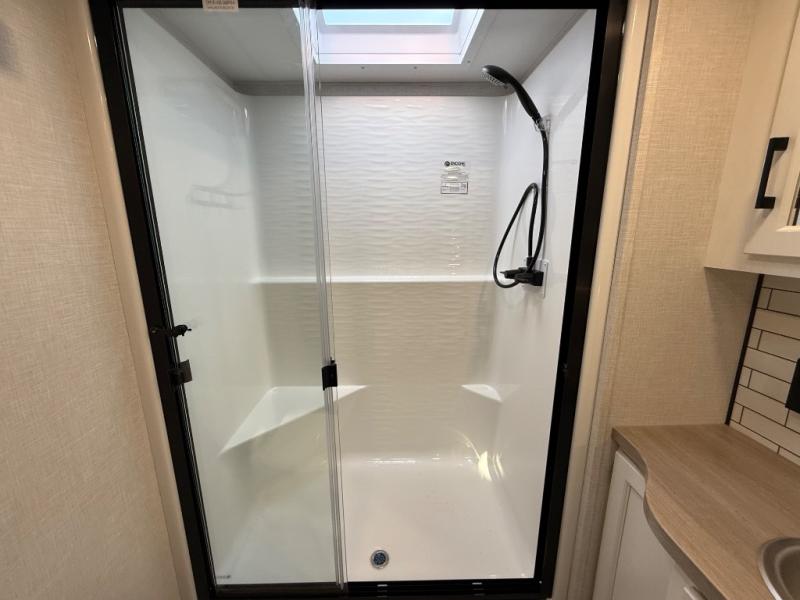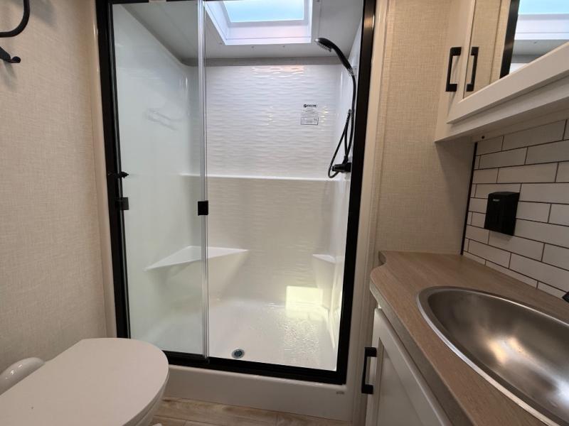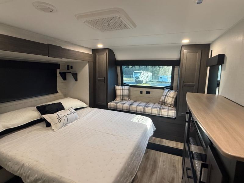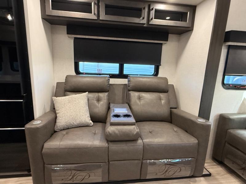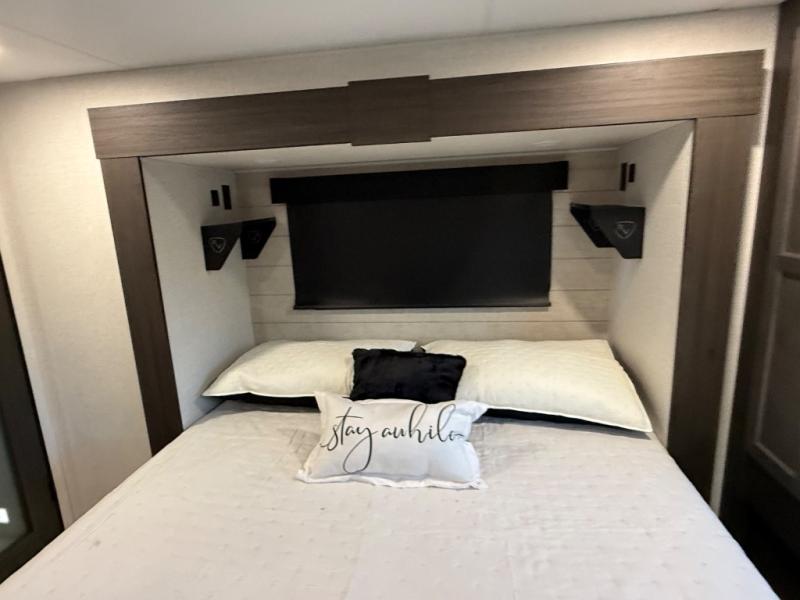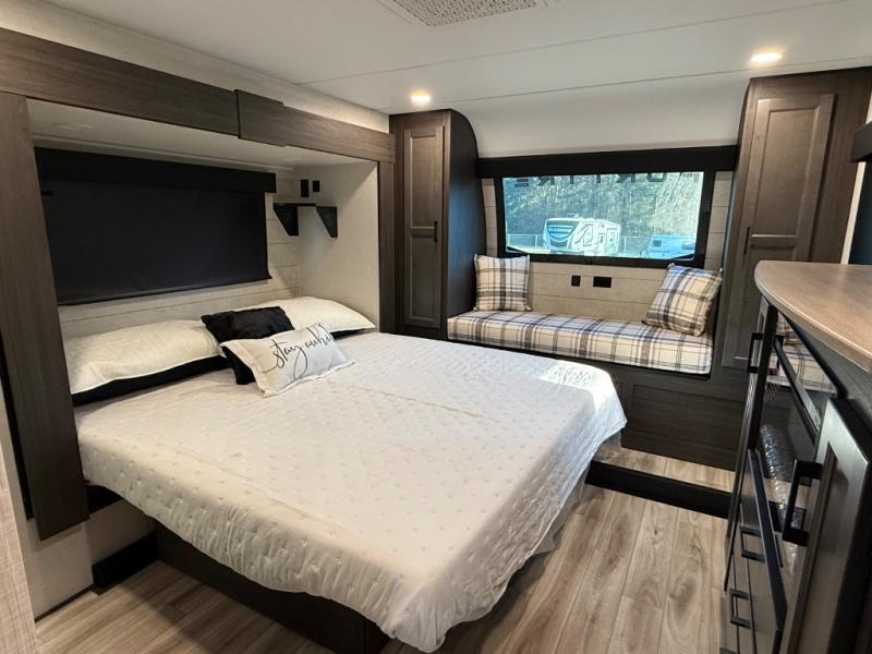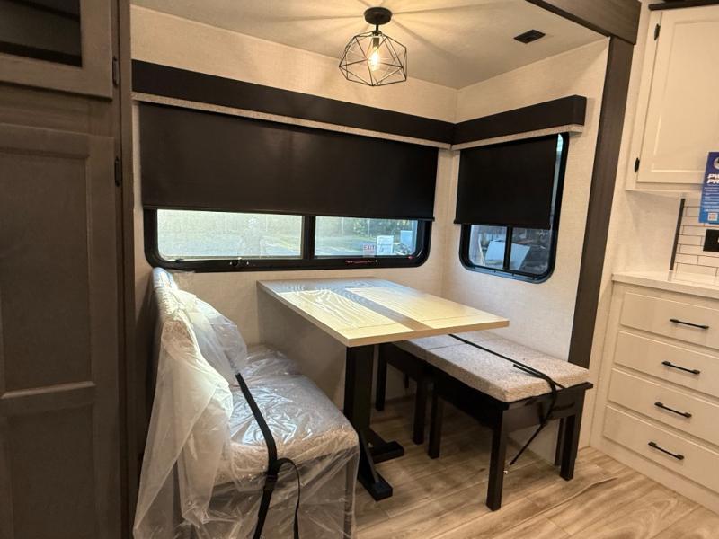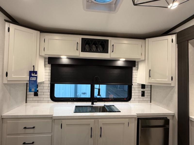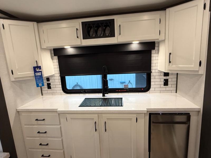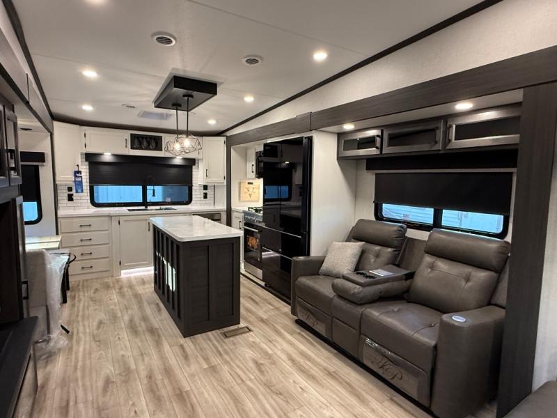 The chef will love cooking in the rear kitchen of this fifth wheel! The front private bedroom has a Serta king mattress to lay your head on at night, a window seat to comfortably read a book while enjoying the 5,000 BTU fireplace, a shelf storage closet, and a prepped area for a washer and dryer. Freshen up each morning with the 48" fiberglass shower with a seat in the full bathroom then head down the floating steps with shoe storage to whip up a delicious breakfast. The fully equipped kitchen even comes with a 18" GE stainless steel dishwasher at the rear sink with countertops on either side for easy clean up. Enjoy your meals at the table with two chairs and two Versa benches. You could even cook at the outside campfire cafe with the griddle. Inside the middle living area, you will find a tri-fold sofa with overhead cabinets and theater seating with USB charging across from the entertainment center with a 5,000 BTU fireplace!