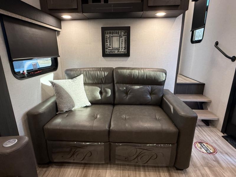 An elegant design and new features come with every one of these Venture RV SportTrek Touring Edition fifth wheels! The NXG Huck bolt frame holds these units together and Tufflex PVC roofing covers them. Heads will turn down the highway and at the campsite with the frameless tinted windows and high gloss fiberglass front cap with automotive paint. The exterior pass-through storage area has slam latch baggage doors with magnetic catches so you don't have to worry about them closing on you and LED lighting on the electric awning so you can see clearly even at night. Luxury abounds throughout these units, especially with the two fireplaces, solid surface kitchen countertops, blackout roller shades, and maximum storage designs. Come find your favorite model today!