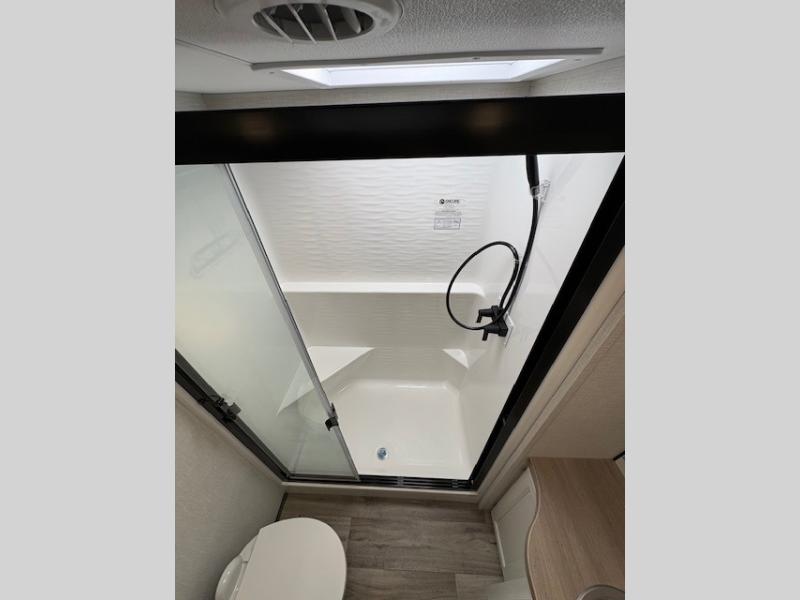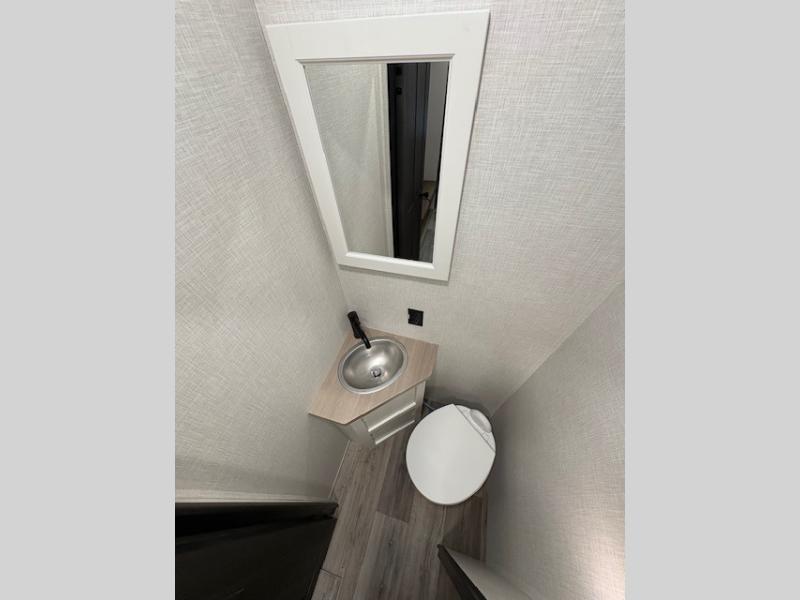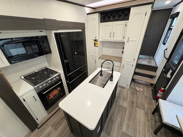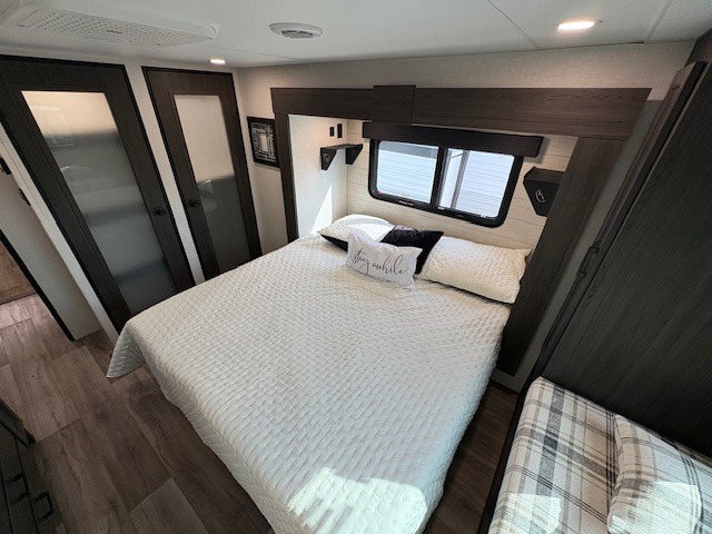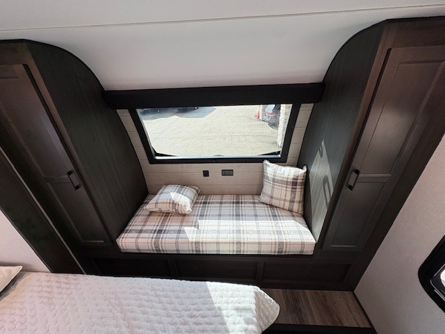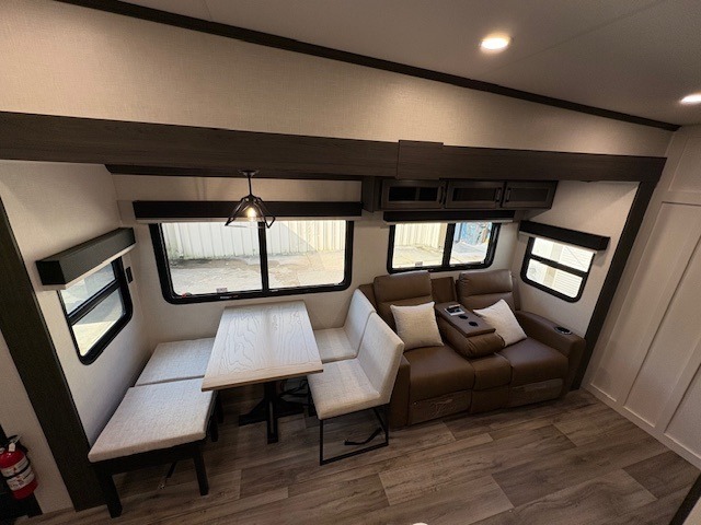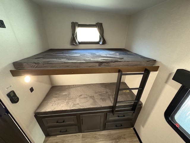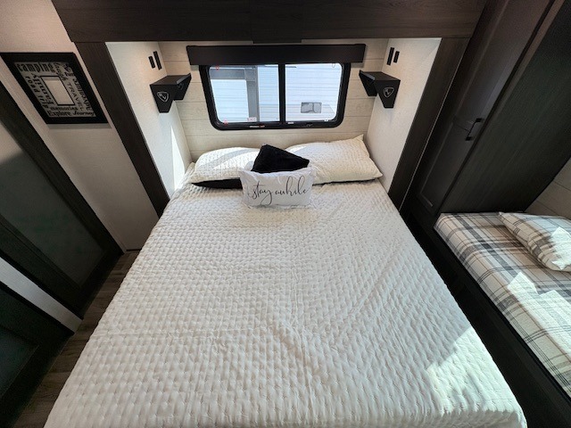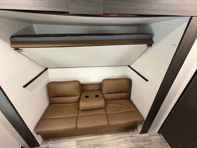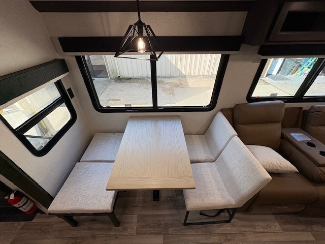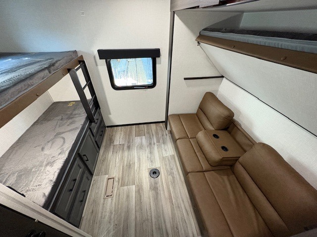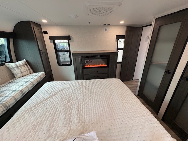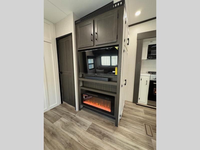 The whole family will have a great time camping in this fifth wheel! The kiddos will enjoy their own privacy with the rear private bunkhouse which has a bunk over bunk, a top bunk above a 70" sofa with table slide, and even its very own half bathroom. With a front private bedroom as well, you will have your own privacy with a Serta king mattress to lay your head on at night, a comfortable window seat to read a book by the 5,000 BTU fireplace, and a shelf storage closet to keep things organized. Everyone can clean up in the 48" fiberglass shower with a seat in the full bathroom, and keep their bellies full with the fully equipped kitchen which even has a 18" GE stainless steel dishwasher at the kitchen island. Relax on the 70" tri-fold sofa in front of the 5,000 BTU fireplace or play a few card games at the table with two chairs and two Versa benches!