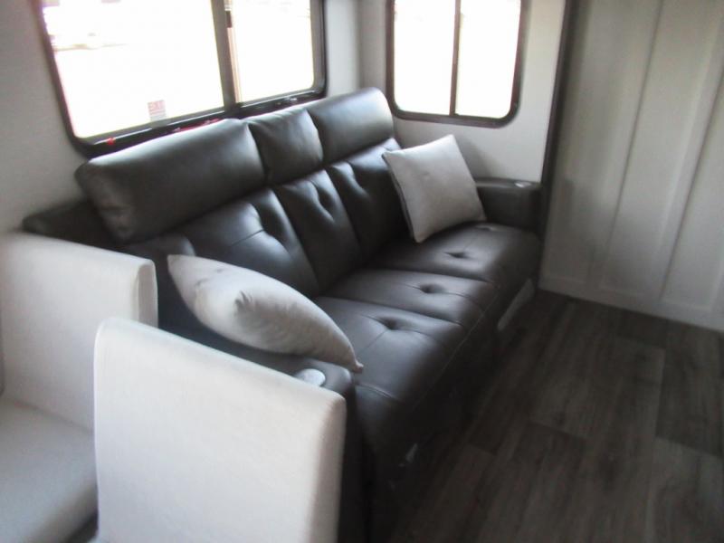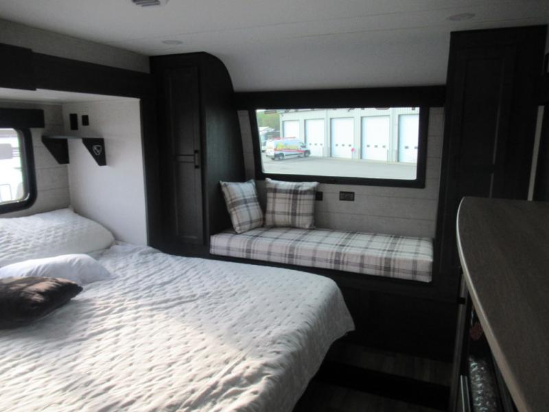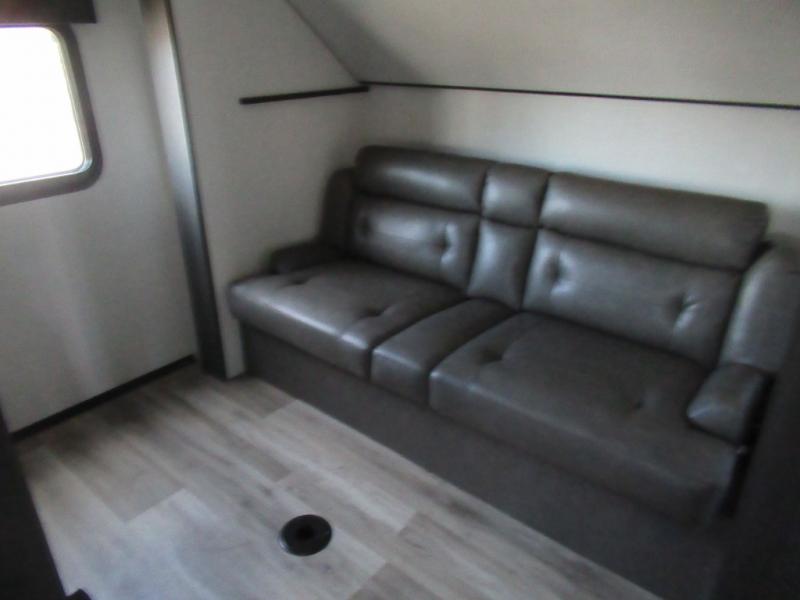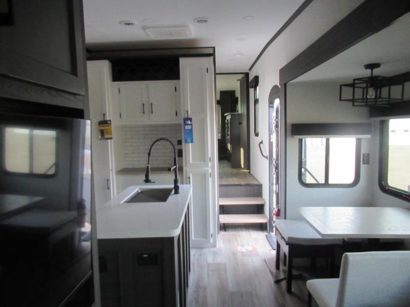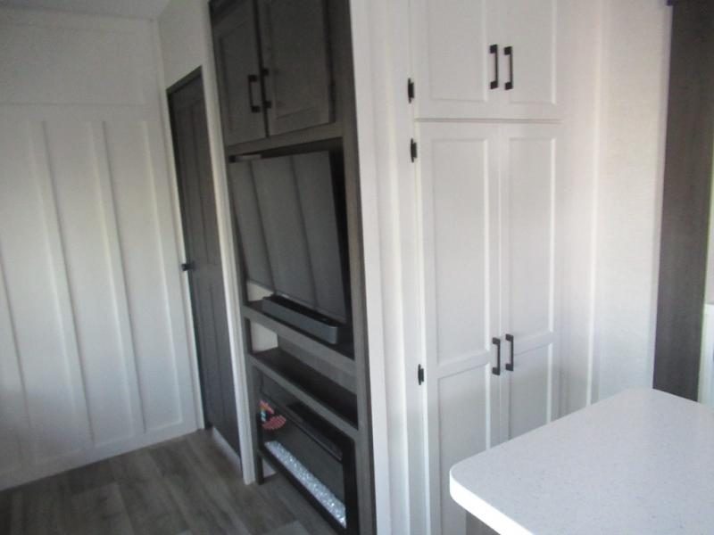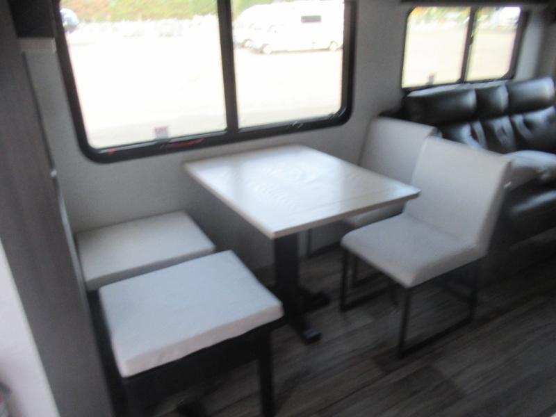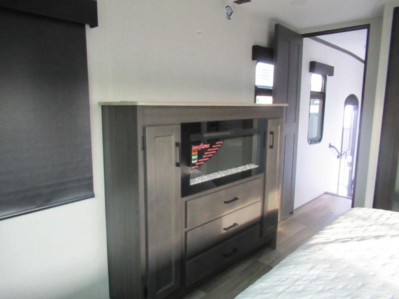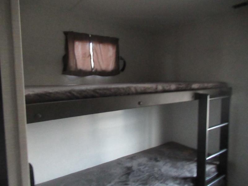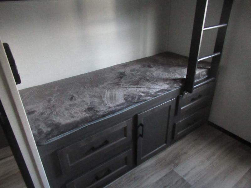 The whole family will have a great time camping in this fifth wheel! The kiddos will enjoy their own privacy with the rear private bunkhouse which has a bunk over bunk, a top bunk above a 70" sofa with table slide, and even its very own half bathroom. With a front private bedroom as well, you will have your own privacy with a Serta king mattress to lay your head on at night, a comfortable window seat to read a book by the 5,000 BTU fireplace, and a shelf storage closet to keep things organized. Everyone can clean up in the 48" fiberglass shower with a seat in the full bathroom, and keep their bellies full with the fully equipped kitchen which even has a 18" GE stainless steel dishwasher at the kitchen island. Relax on the 70" tri-fold sofa in front of the 5,000 BTU fireplace or play a few card games at the table with two chairs and two Versa benches!
