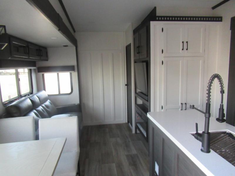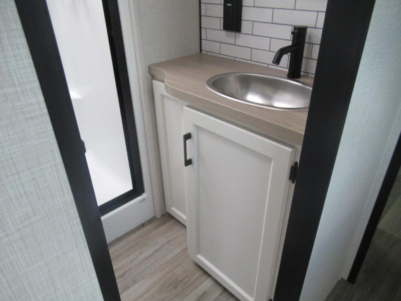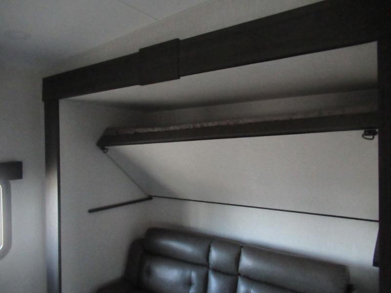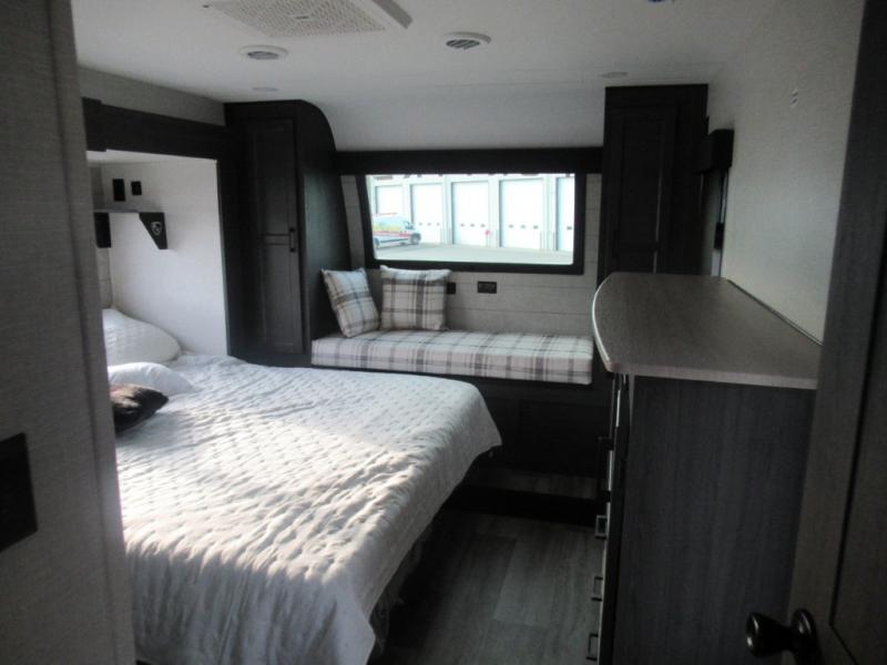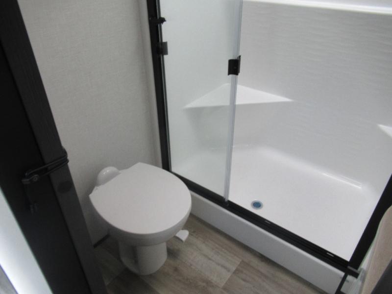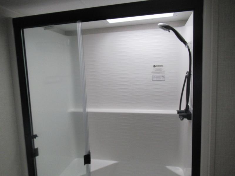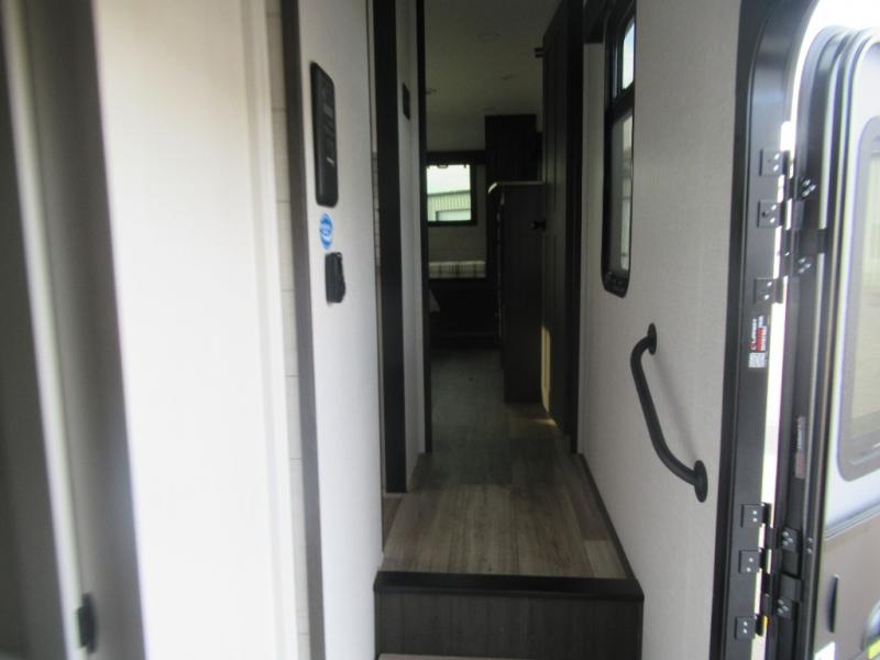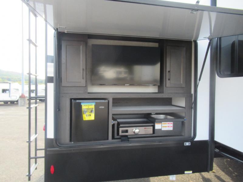 The whole family will have a great time camping in this fifth wheel! The kiddos will enjoy their own privacy with the rear private bunkhouse which has a bunk over bunk, a top bunk above a 70" sofa with table slide, and even its very own half bathroom. With a front private bedroom as well, you will have your own privacy with a Serta king mattress to lay your head on at night, a comfortable window seat to read a book by the 5,000 BTU fireplace, and a shelf storage closet to keep things organized. Everyone can clean up in the 48" fiberglass shower with a seat in the full bathroom, and keep their bellies full with the fully equipped kitchen which even has a 18" GE stainless steel dishwasher at the kitchen island. Relax on the 70" tri-fold sofa in front of the 5,000 BTU fireplace or play a few card games at the table with two chairs and two Versa benches!