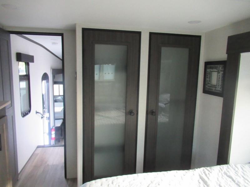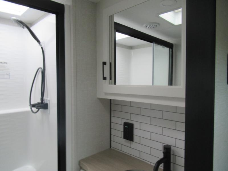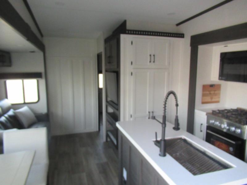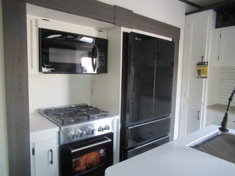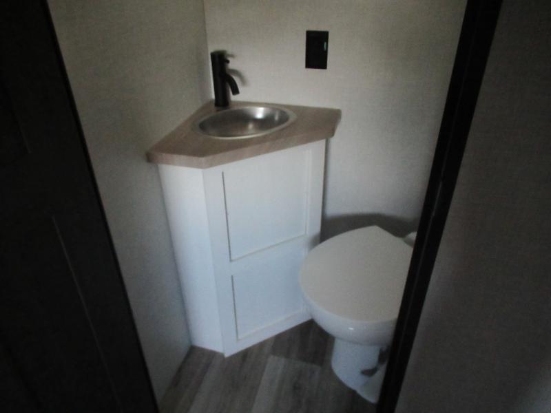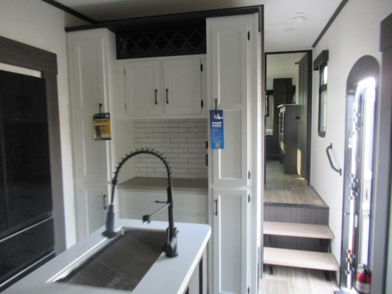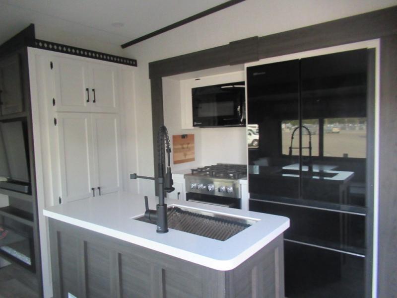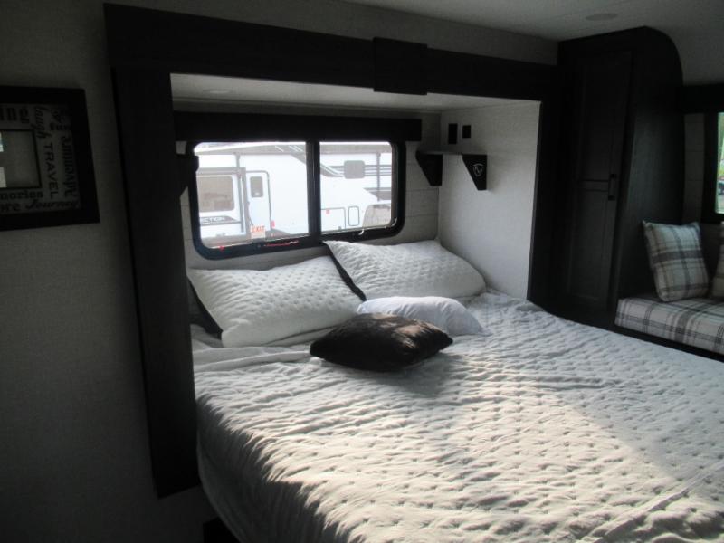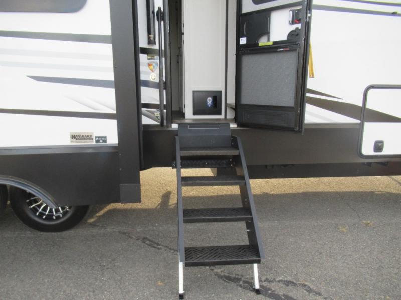 The whole family will have a great time camping in this fifth wheel! The kiddos will enjoy their own privacy with the rear private bunkhouse which has a bunk over bunk, a top bunk above a 70" sofa with table slide, and even its very own half bathroom. With a front private bedroom as well, you will have your own privacy with a Serta king mattress to lay your head on at night, a comfortable window seat to read a book by the 5,000 BTU fireplace, and a shelf storage closet to keep things organized. Everyone can clean up in the 48" fiberglass shower with a seat in the full bathroom, and keep their bellies full with the fully equipped kitchen which even has a 18" GE stainless steel dishwasher at the kitchen island. Relax on the 70" tri-fold sofa in front of the 5,000 BTU fireplace or play a few card games at the table with two chairs and two Versa benches!