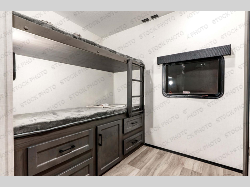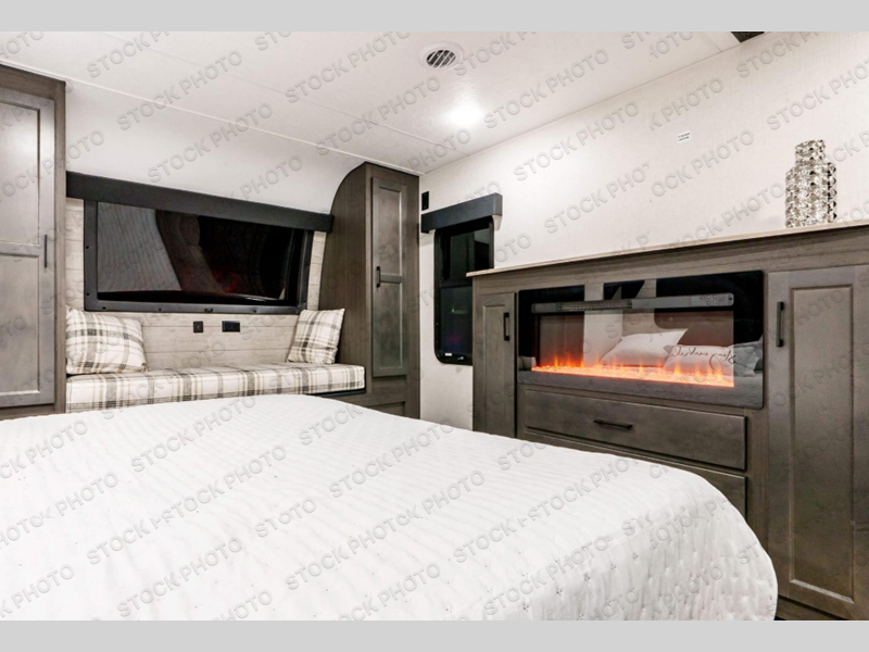 The whole family will have a great time camping in this fifth wheel! The kiddos will enjoy their own privacy with the rear private bunkhouse which has a bunk over bunk, a top bunk above a 70" sofa with table slide, and even its very own half bathroom. With a front private bedroom as well, you will have your own privacy with a Serta king mattress to lay your head on at night, a comfortable window seat to read a book by the 5,000 BTU fireplace, and a shelf storage closet to keep things organized. Everyone can clean up in the 48" fiberglass shower with a seat in the full bathroom, and keep their bellies full with the fully equipped kitchen which even has a 18" GE stainless steel dishwasher at the kitchen island. Relax on the 70" tri-fold sofa in front of the 5,000 BTU fireplace or play a few card games at the table with two chairs and two Versa benches!