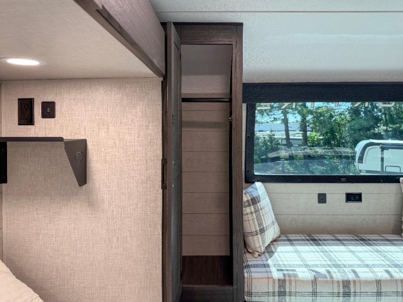Luxury is found throughout this fifth wheel, so come take a look! The combined living area and kitchen is made spacious by the dual opposing slides, and your crew will enjoy relaxing on the theater seating, rear tri-fold sofa, plus the table with chairs. The chef of your group will love having extra counter space provided by the kitchen island, and the dishwasher is icing on top! Head to the middle bunkhouse which could also be used as an office or den, making it the perfect flex room. There is also washer and dryer prep here for the option to add these appliances. And you're sure to enjoy your own space in the front bedroom. Here, you'll find a front window seat with closets on either side, a dresser, and even more storage space!