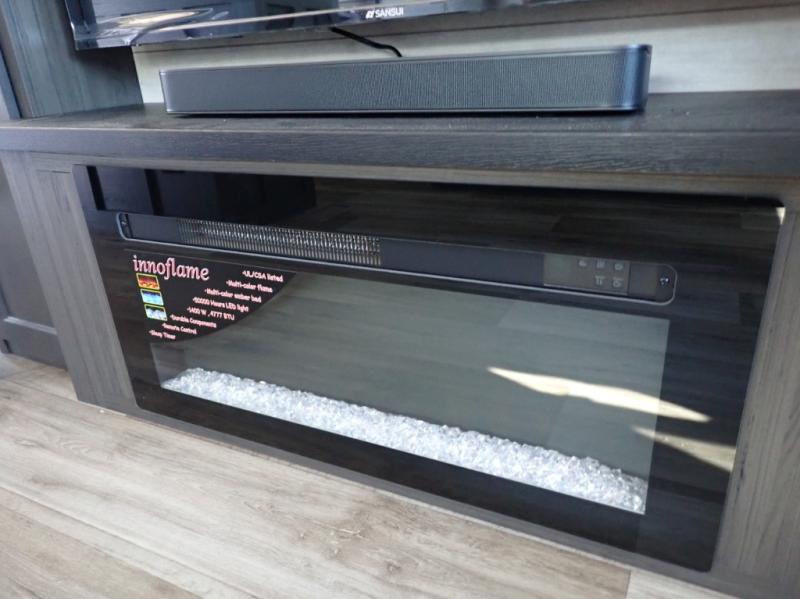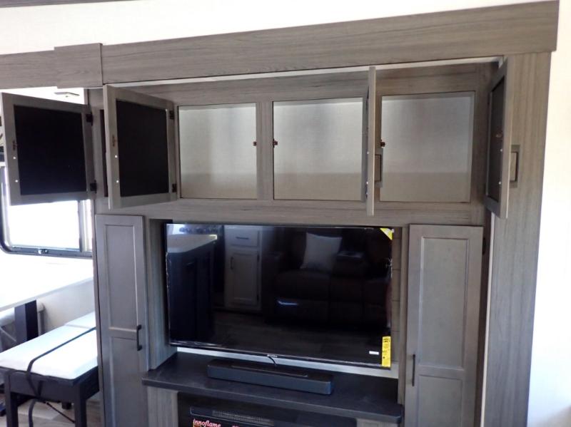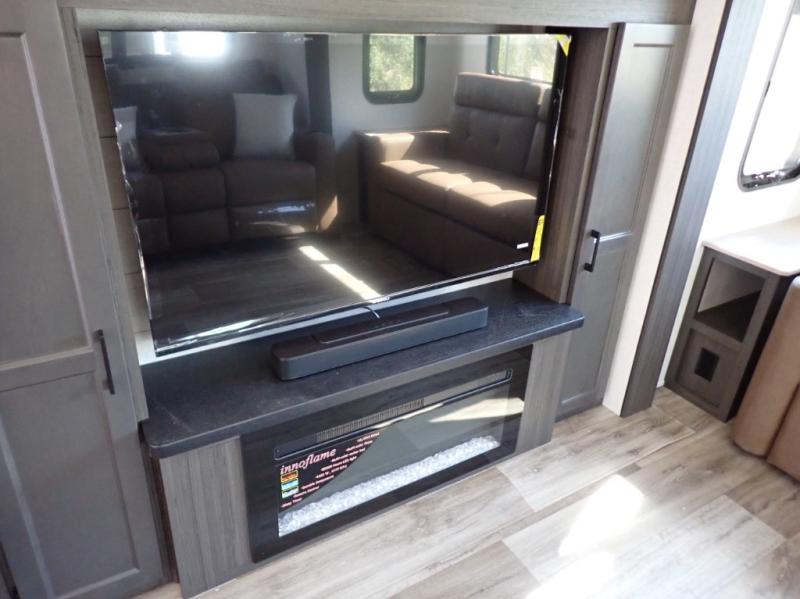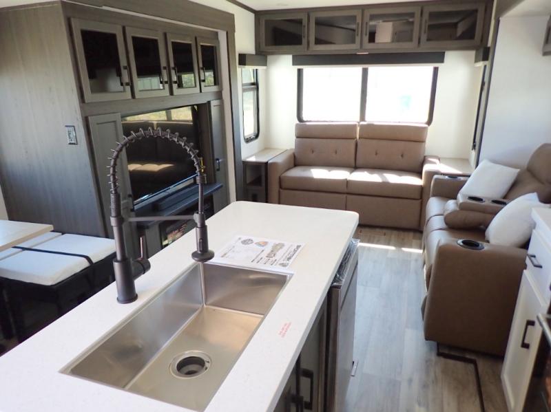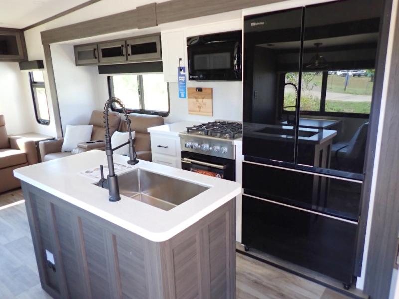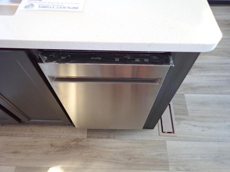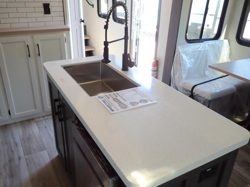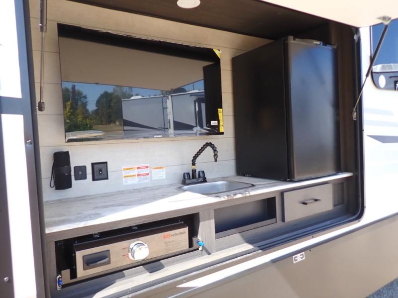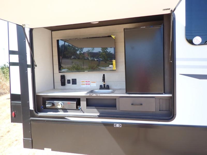 This is a private front bedroom / rear living room model. The spacious kitchen is in the mid-section of the trailer and includes an island counter with a GE dishwasher. You will also love taking the fun outdoors as your family enjoys the integrated outside kitchen which also includes a TV!