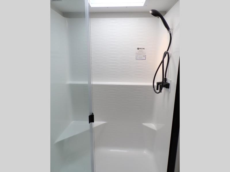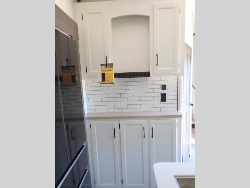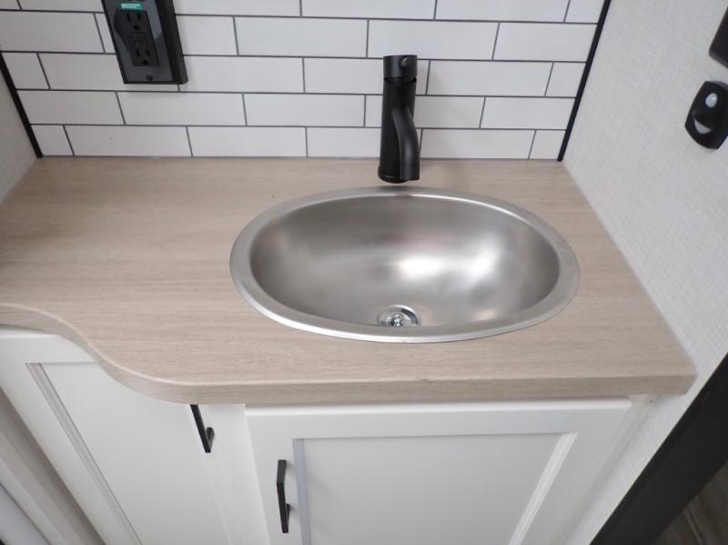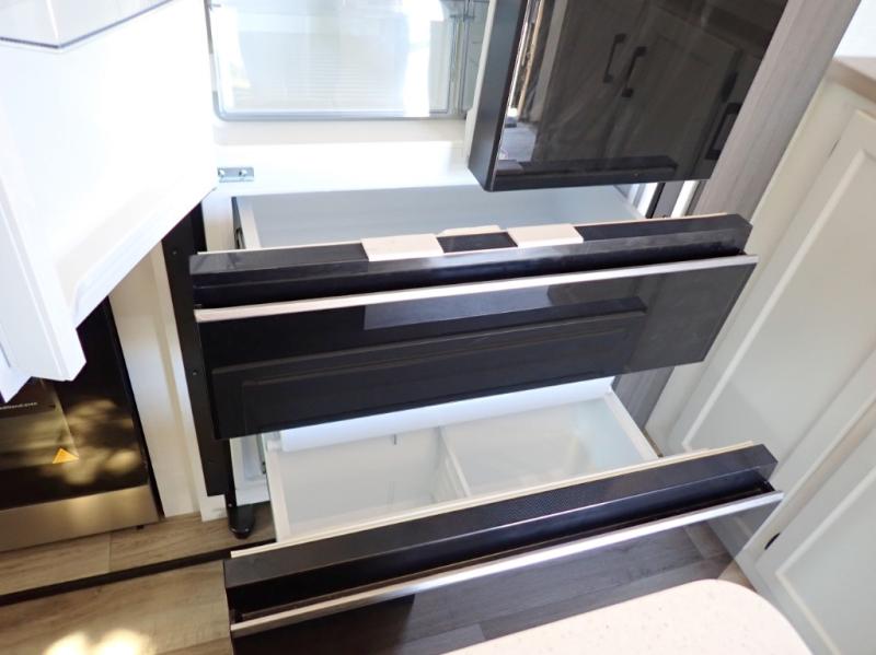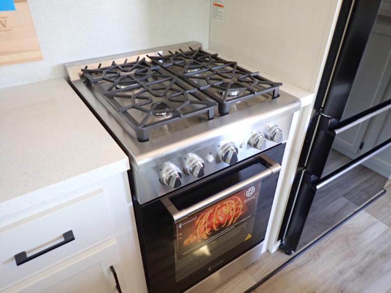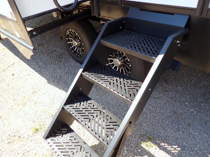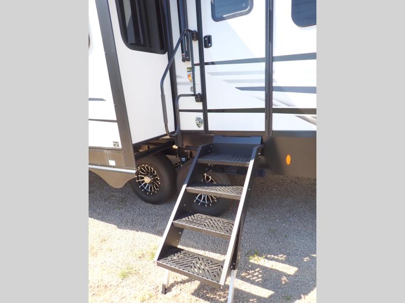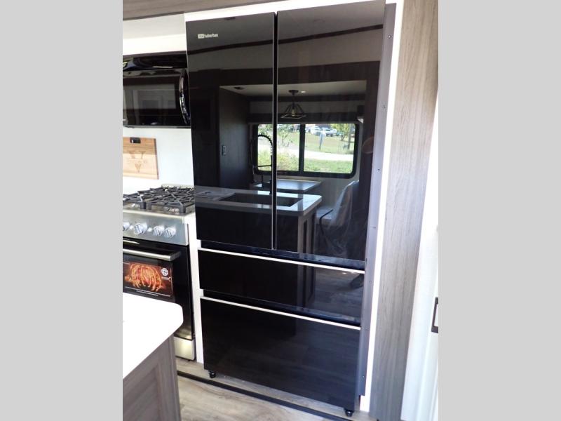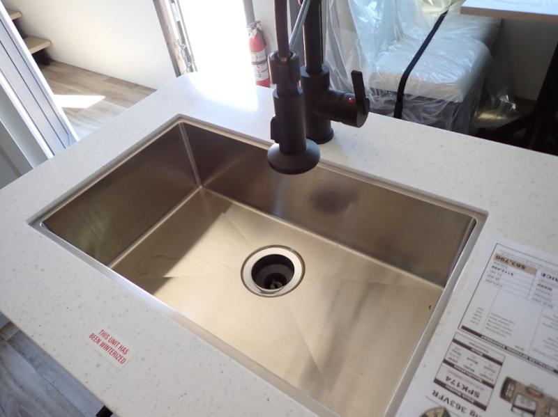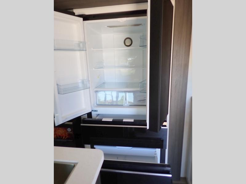 This is a private front bedroom / rear living room model. The spacious kitchen is in the mid-section of the trailer and includes an island counter with a GE dishwasher. You will also love taking the fun outdoors as your family enjoys the integrated outside kitchen which also includes a TV!