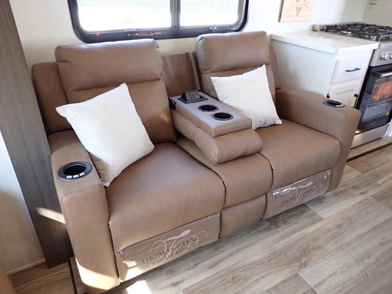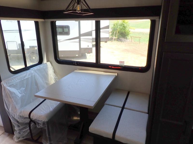 Luxury is found throughout this fifth wheel, so come take a look! The combined living area and kitchen is made spacious by the dual opposing slides, and your crew will enjoy relaxing on the theater seating, rear tri-fold sofa, plus the table with chairs. The chef of your group will love having extra counter space provided by the kitchen island, and the dishwasher is icing on top! Head to the middle bunkhouse which could also be used as an office or den, making it the perfect flex room. There is also washer and dryer prep here for the option to add these appliances. And you're sure to enjoy your own space in the front bedroom. Here, you'll find a front window seat with closets on either side, a dresser, and even more storage space!