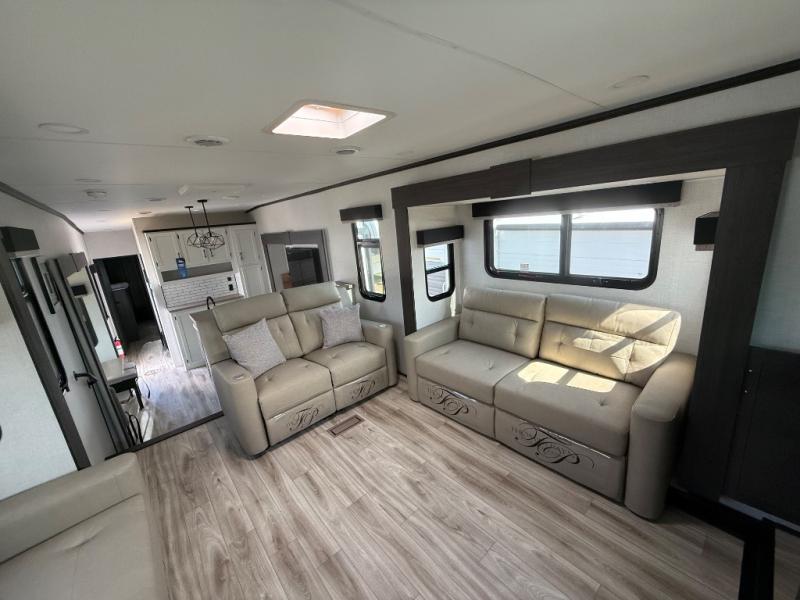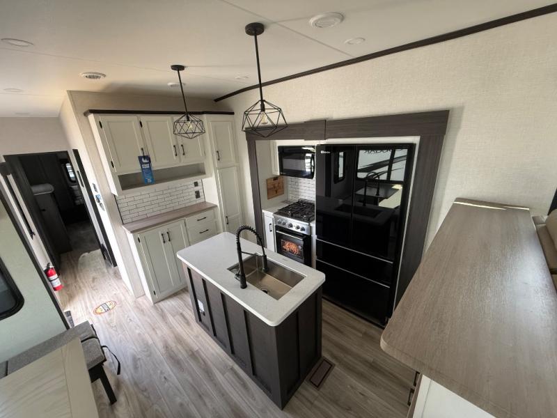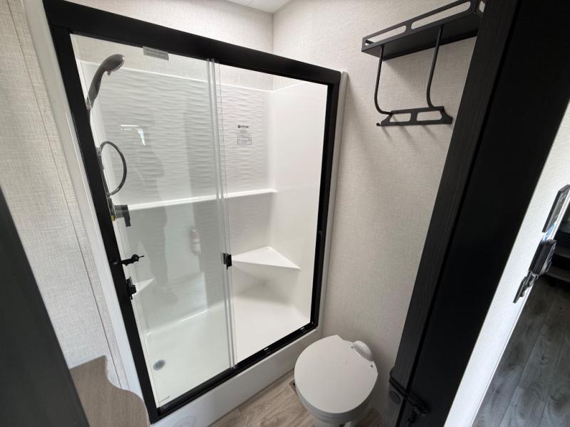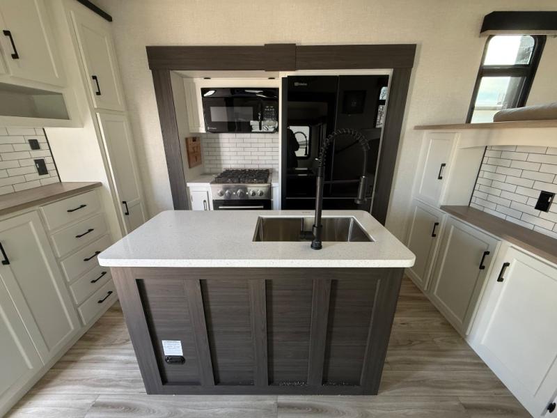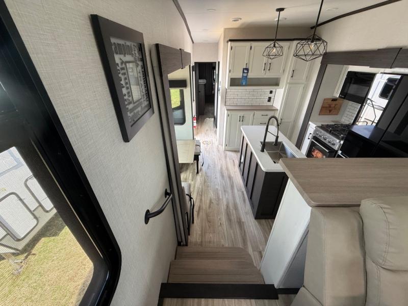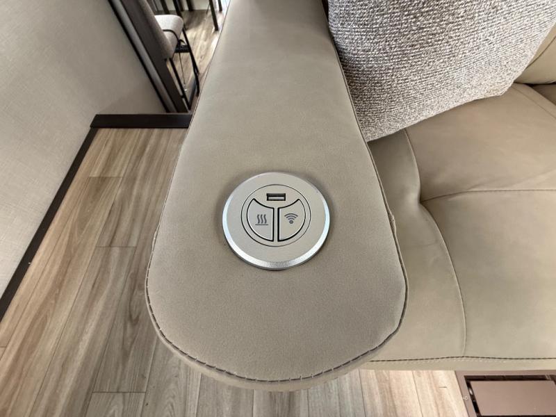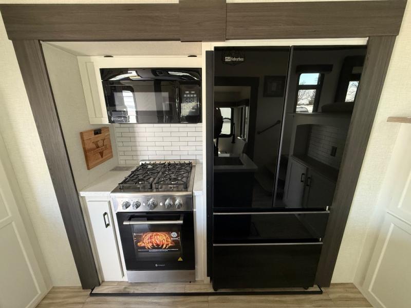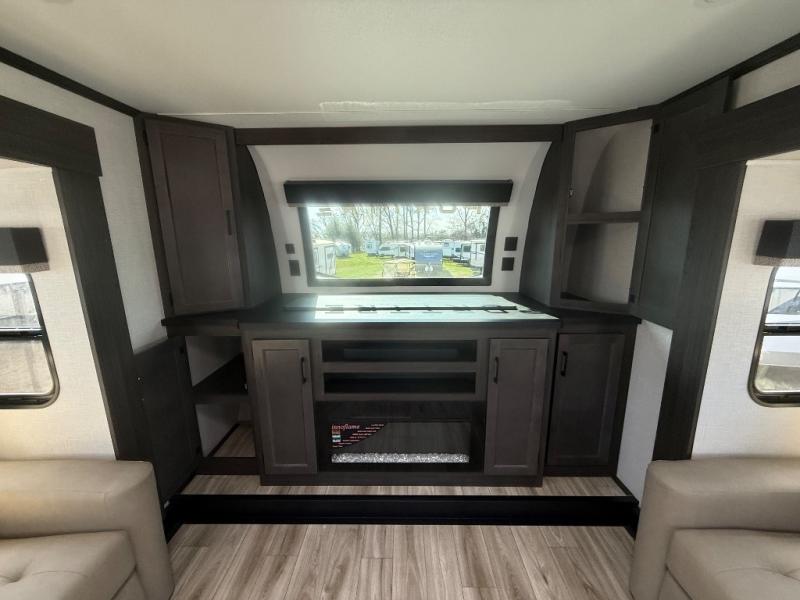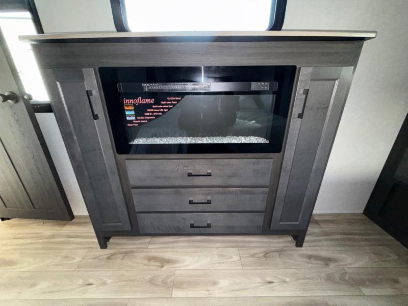 Imagine unwinding in a space that's equal parts cozy retreat and adventure hub. The king bed beckons you to relax, with a bench in the wardrobe area for extra seating. Ample storage in the wardrobe, dresser, and closet means you can bring all your essentials. The full bathroom features a sleek fiberglass shower, perfect for refreshing after a day of exploring. Furthermore, the kitchen is a dream: two hutches for dishes and decor, a pantry for storage, a three-burner cooktop for meals, and an 18 cu fridge. The kitchen island adds extra prep space, and the table with chairs plus two versa benches equals flex space for dining or games. In the living area, theater seating and two tri-fold sofas —perfect for cozy nights in. Along with the sofa, the fireplace offers warm and fuzzy vibes, and the 50” TV means entertainment galore.