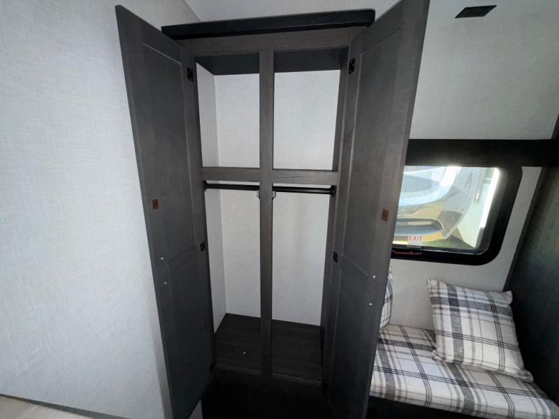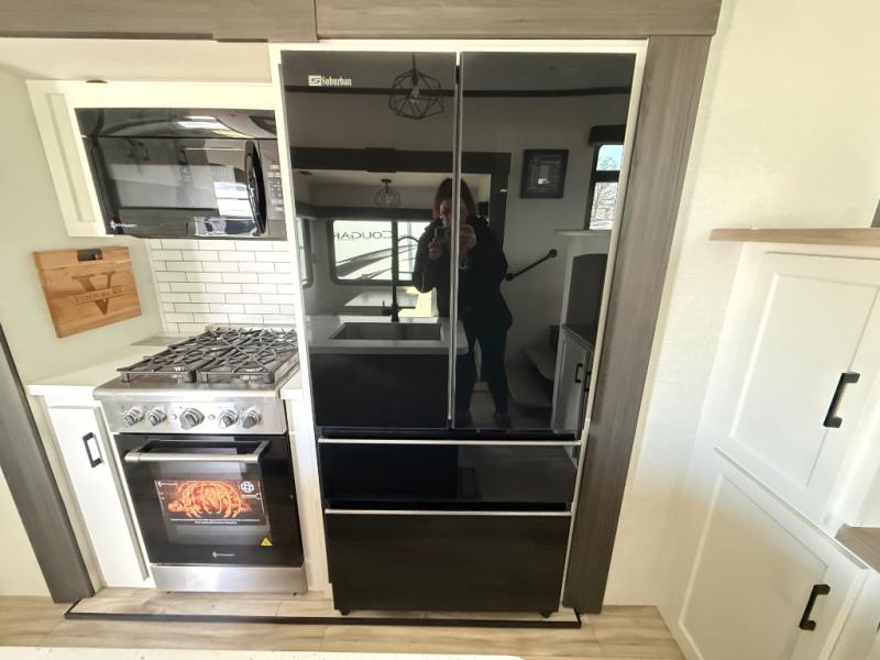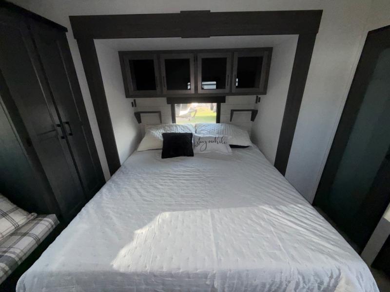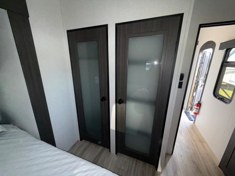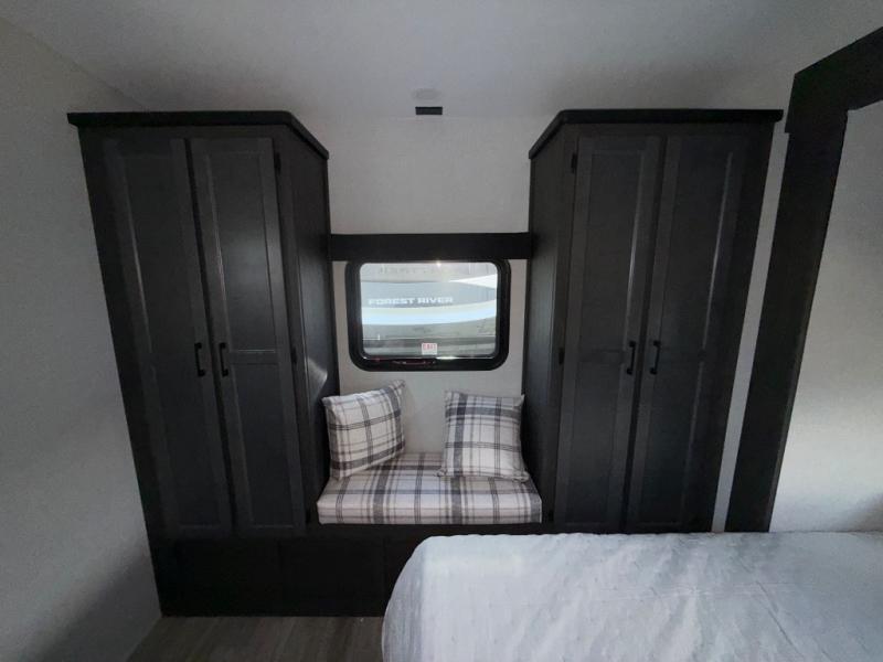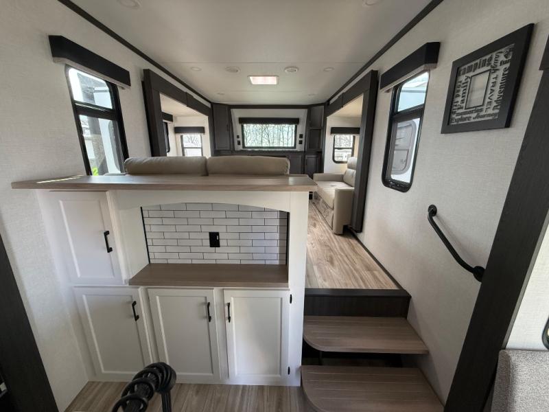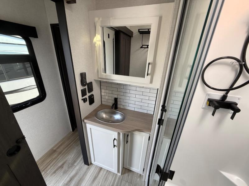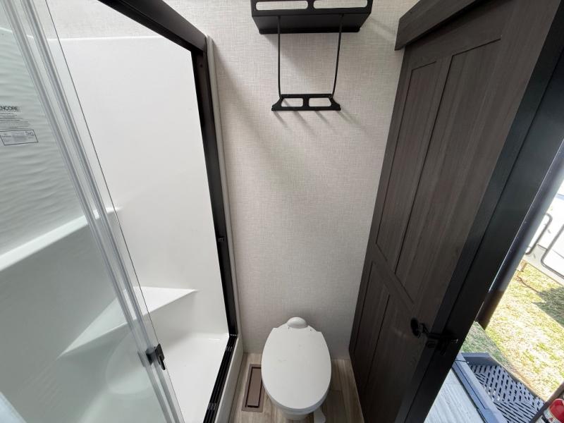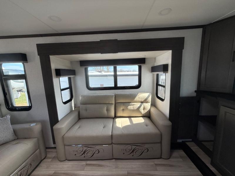 Imagine unwinding in a space that's equal parts cozy retreat and adventure hub. The king bed beckons you to relax, with a bench in the wardrobe area for extra seating. Ample storage in the wardrobe, dresser, and closet means you can bring all your essentials. The full bathroom features a sleek fiberglass shower, perfect for refreshing after a day of exploring. Furthermore, the kitchen is a dream: two hutches for dishes and decor, a pantry for storage, a three-burner cooktop for meals, and an 18 cu fridge. The kitchen island adds extra prep space, and the table with chairs plus two versa benches equals flex space for dining or games. In the living area, theater seating and two tri-fold sofas —perfect for cozy nights in. Along with the sofa, the fireplace offers warm and fuzzy vibes, and the 50” TV means entertainment galore.
