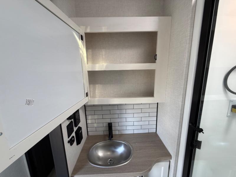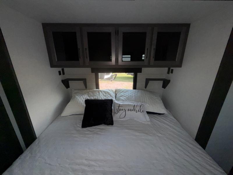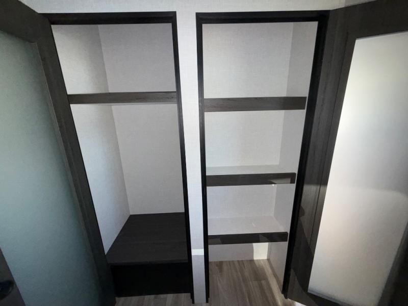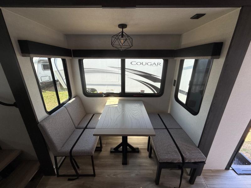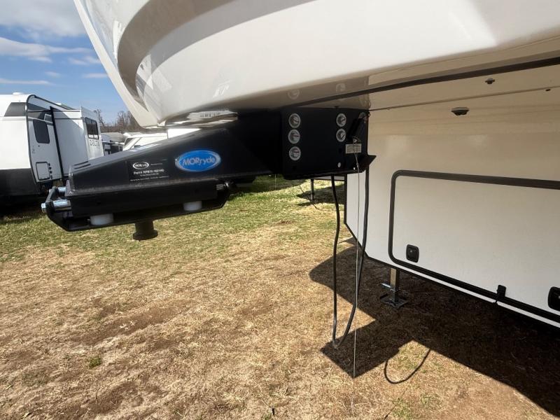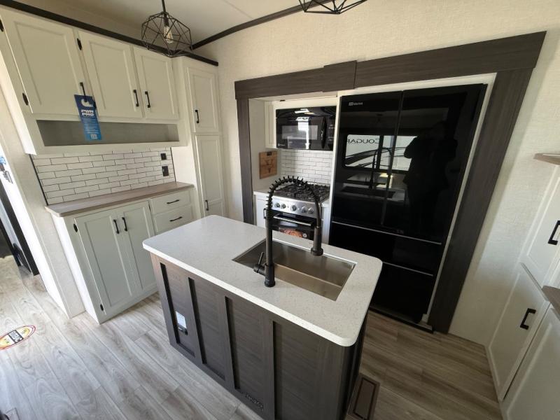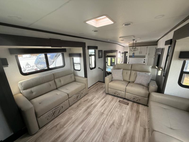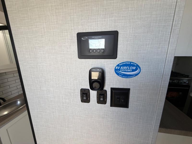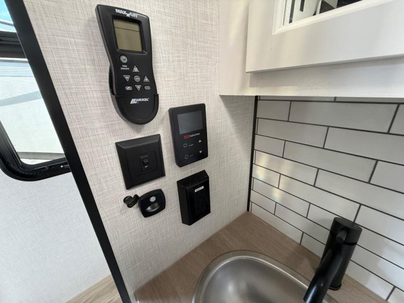 Imagine unwinding in a space that's equal parts cozy retreat and adventure hub. The king bed beckons you to relax, with a bench in the wardrobe area for extra seating. Ample storage in the wardrobe, dresser, and closet means you can bring all your essentials. The full bathroom features a sleek fiberglass shower, perfect for refreshing after a day of exploring. Furthermore, the kitchen is a dream: two hutches for dishes and decor, a pantry for storage, a three-burner cooktop for meals, and an 18 cu fridge. The kitchen island adds extra prep space, and the table with chairs plus two versa benches equals flex space for dining or games. In the living area, theater seating and two tri-fold sofas —perfect for cozy nights in. Along with the sofa, the fireplace offers warm and fuzzy vibes, and the 50” TV means entertainment galore.