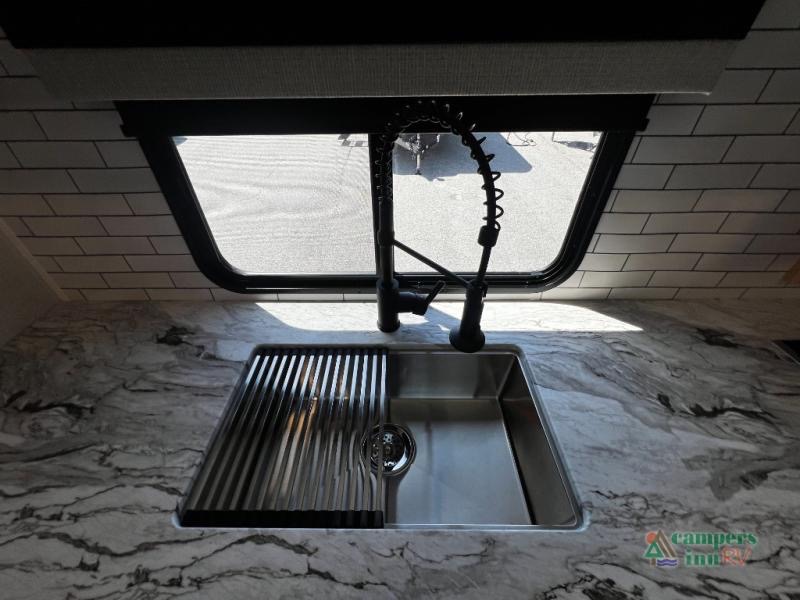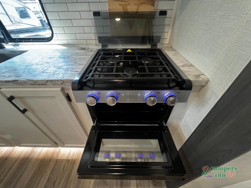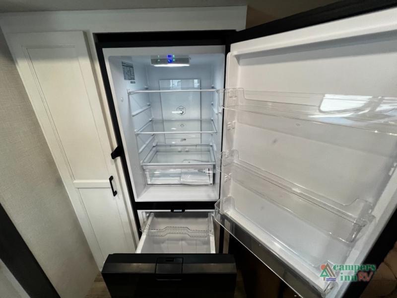Cooking on the road has never been easier. The fully equipped kitchen includes a stainless steel sink with cover and drying racks, three-burner cooktop, overhead cabinetry, 10 cu. ft. refrigerator, and a pantry for all your snacks and essentials. Whether you’re making a quick breakfast or a full dinner, this kitchen has you covered.