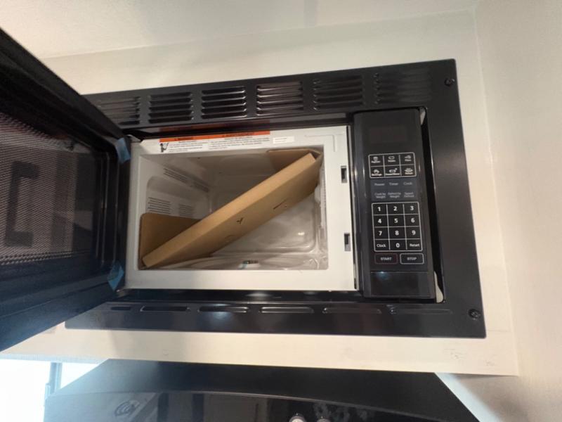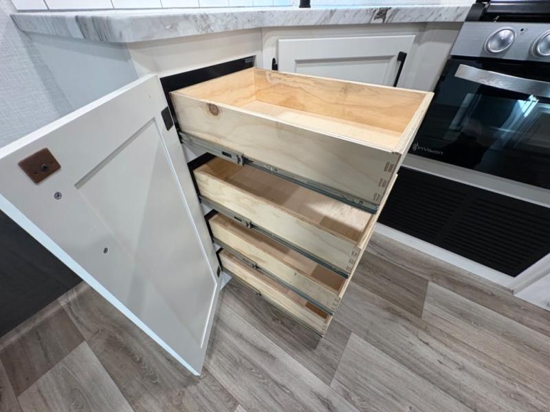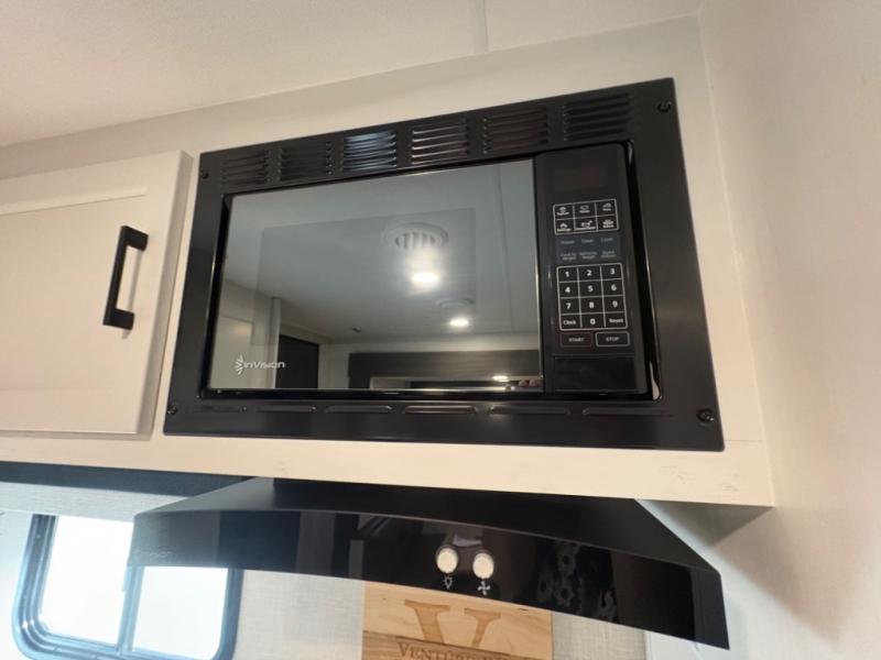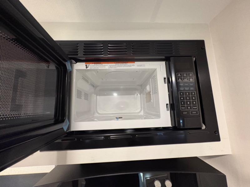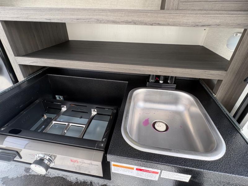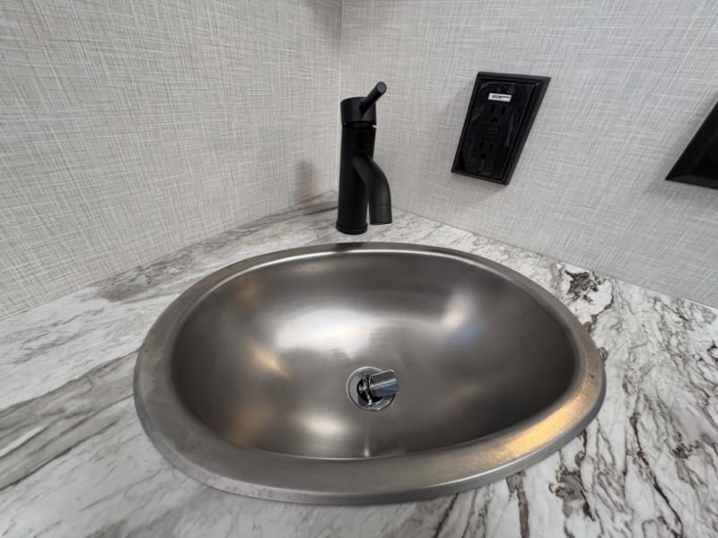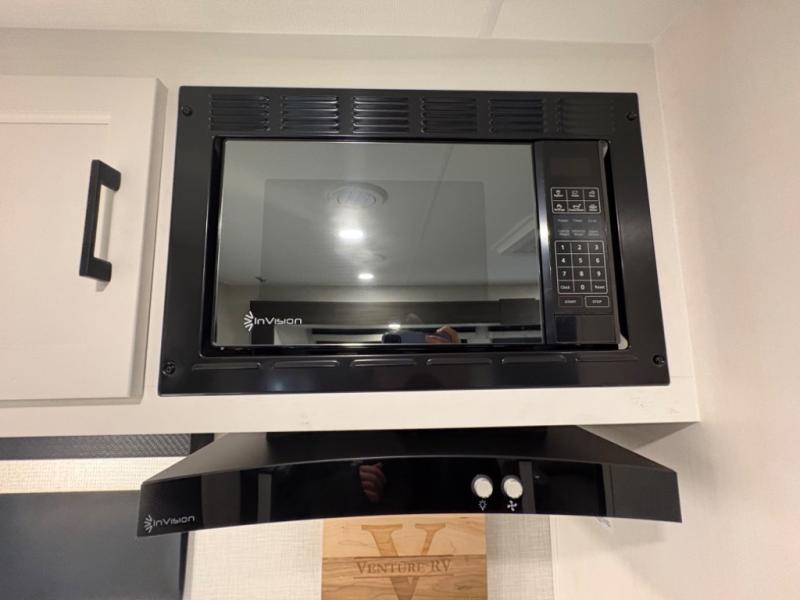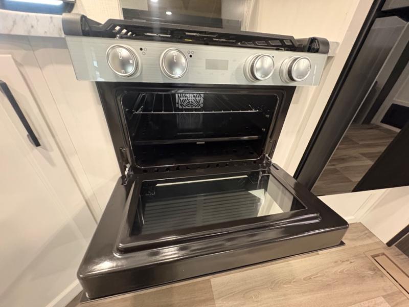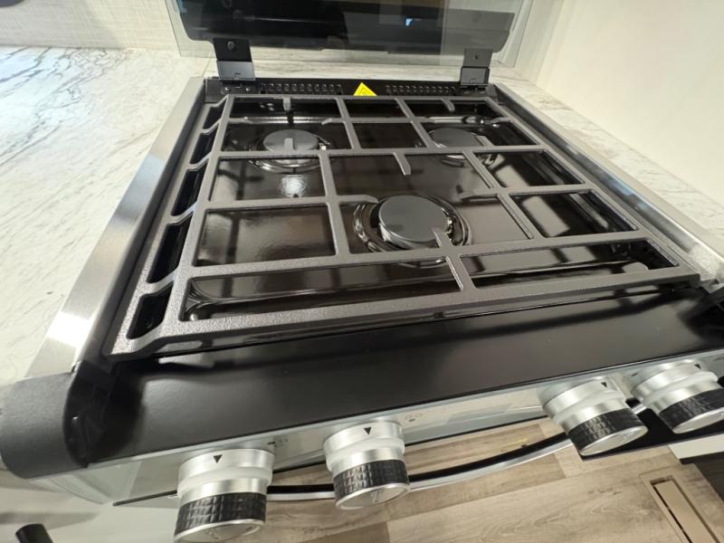 Modern Kitchen – Designed with adventure chefs in mind, the fully equipped kitchen features solid-surface countertops, a residential refrigerator, a stainless-steel sink, a three-burner cooktop, and a microwave. You’ll have everything you need to cook at the campsite or on the go.
