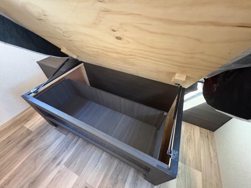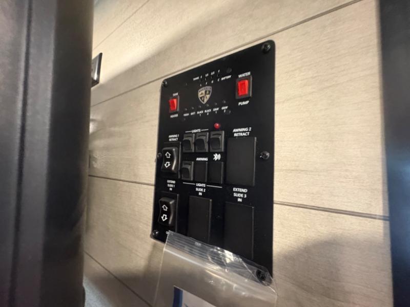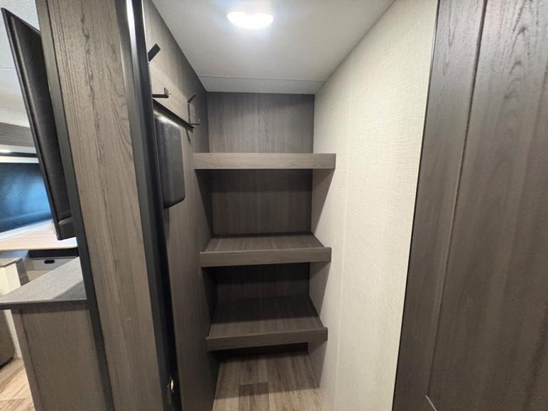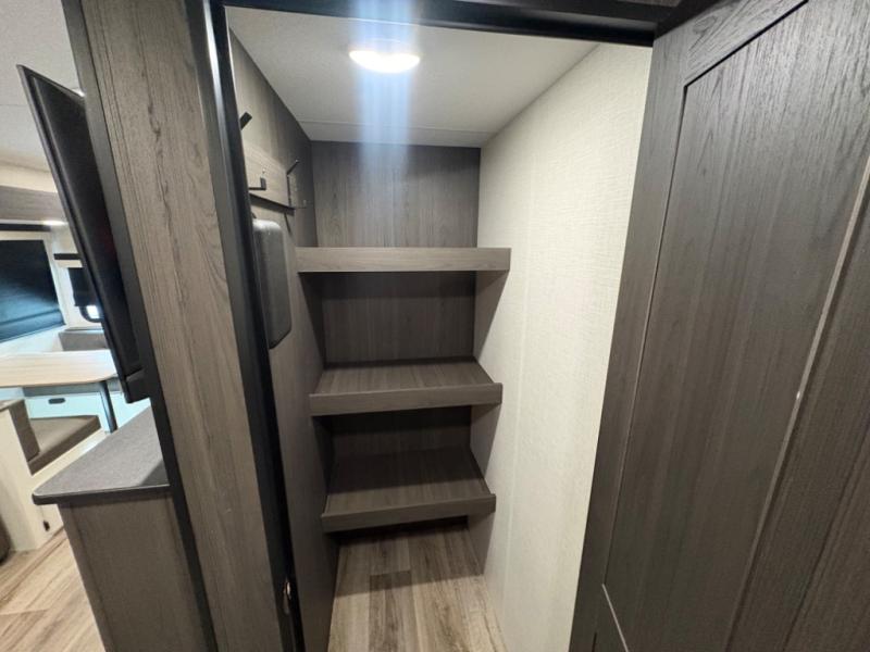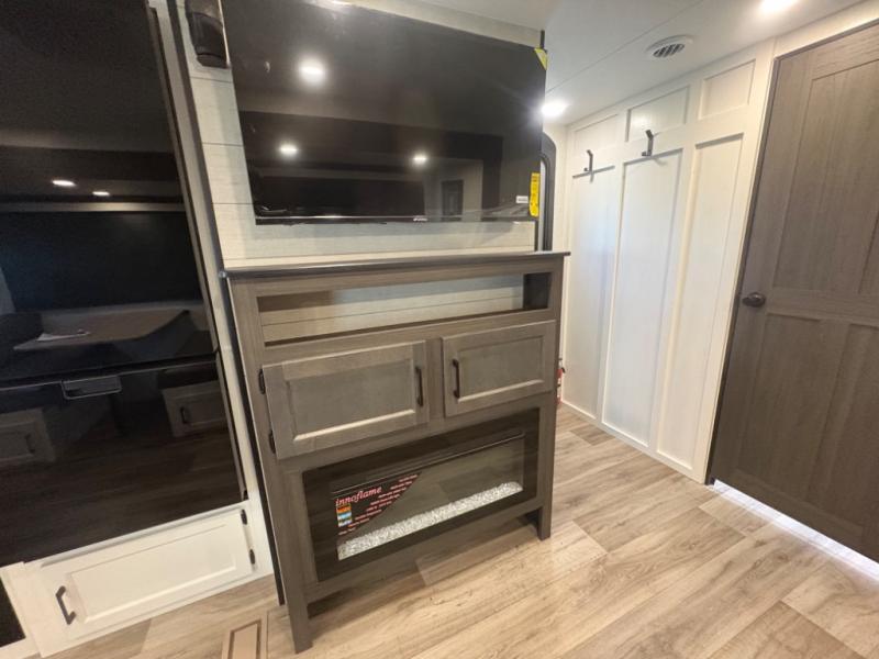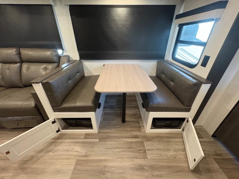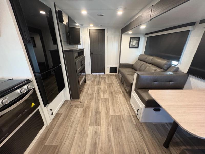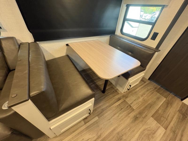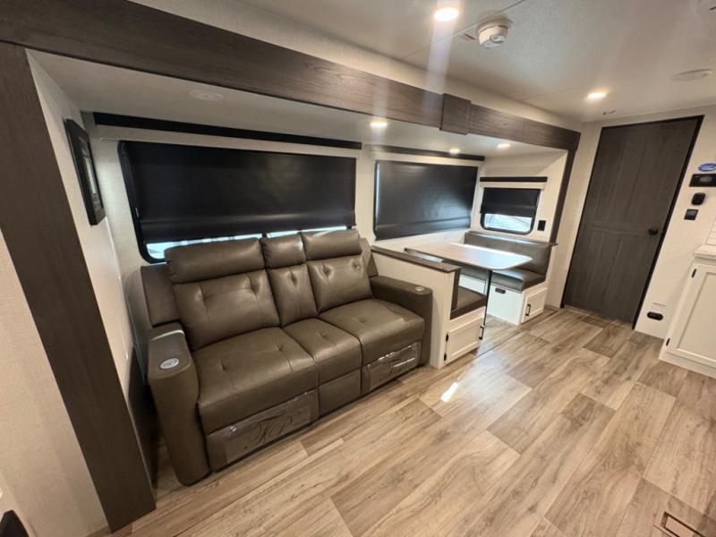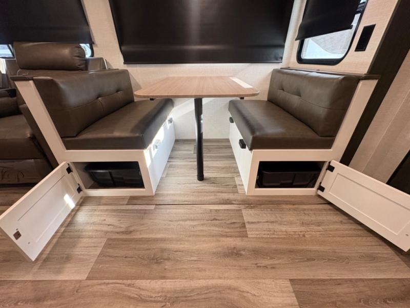 Open Living Area – The main living space includes a roomy slide-out with a dinette and sofa (or theater seating, depending on configuration) that creates a comfortable gathering spot for meals, relaxation, or entertainment.