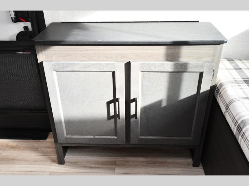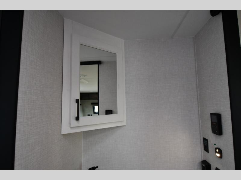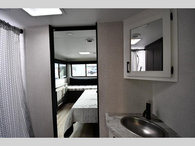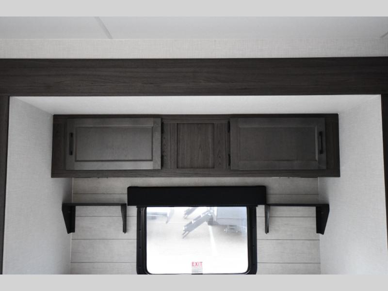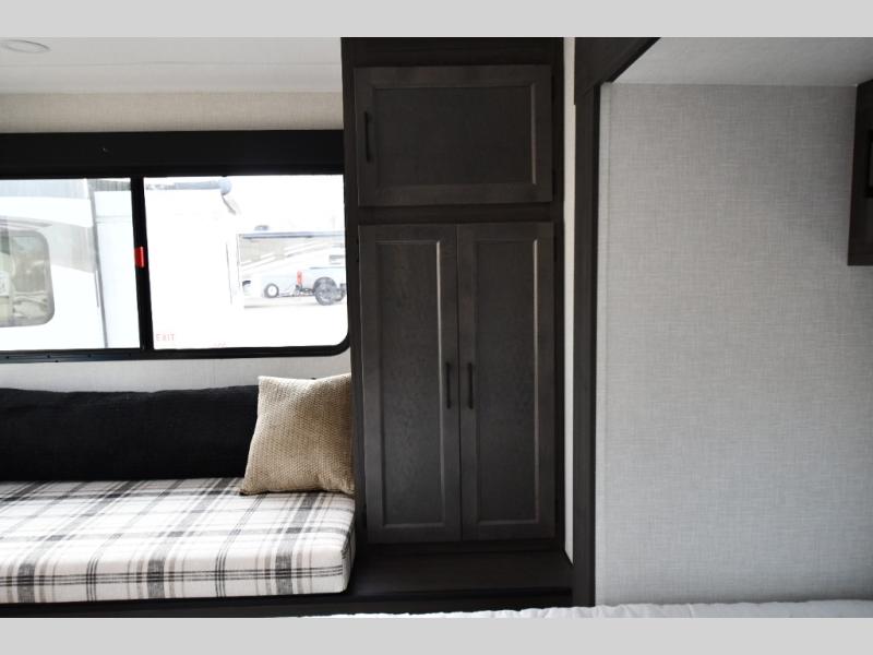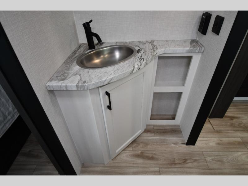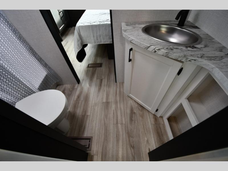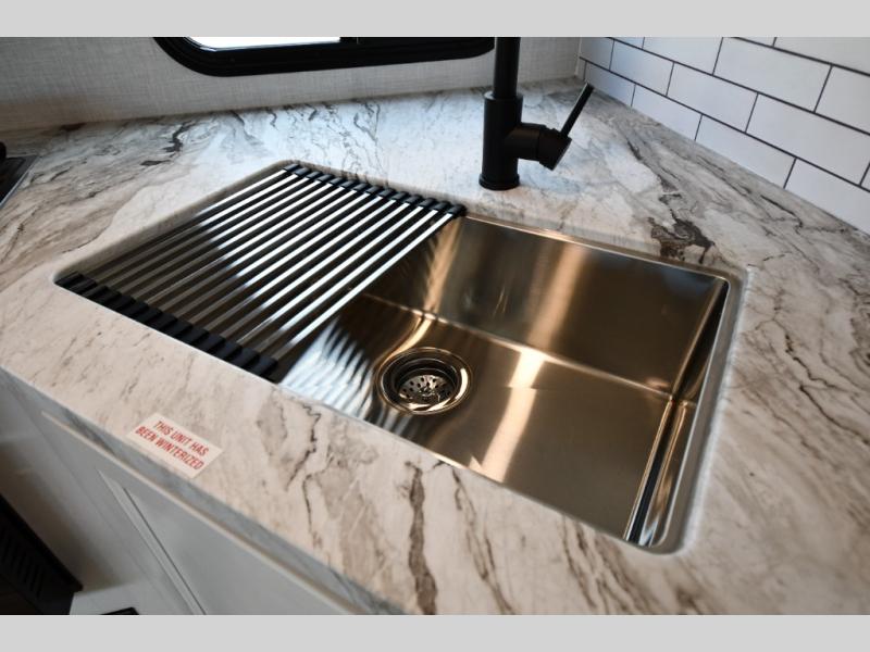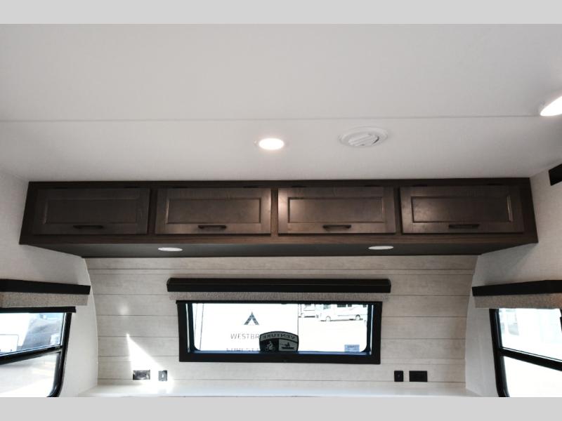 The Stratus also offers convenient technology and comfort upgrades such as Wi-Fi prep, blackout roller shades, upgraded residential furniture, and modern farmhouse-inspired cabinetry, giving the interior a stylish and comfortable feel that stands out from typical travel trailers.