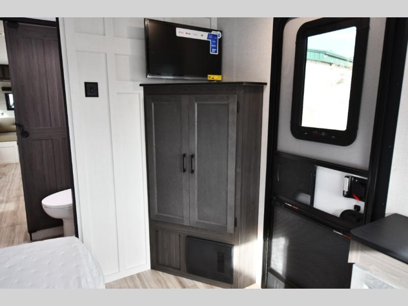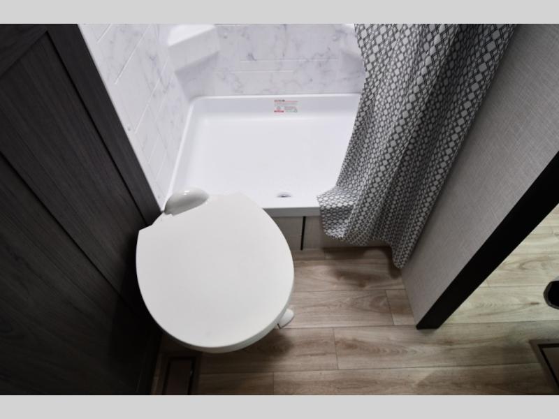Toward the rear, the private bedroom provides a peaceful retreat with a premium 60" x 80" queen memory foam mattress, generous closet space, overhead cabinets, and under-bed storage for longer trips. The convenient walk-through bathroom includes a roomy shower, porcelain foot-flush toilet, and modern fixtures, giving you the comfort and privacy you want while traveling.