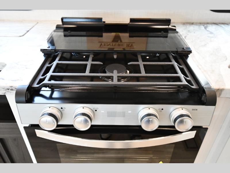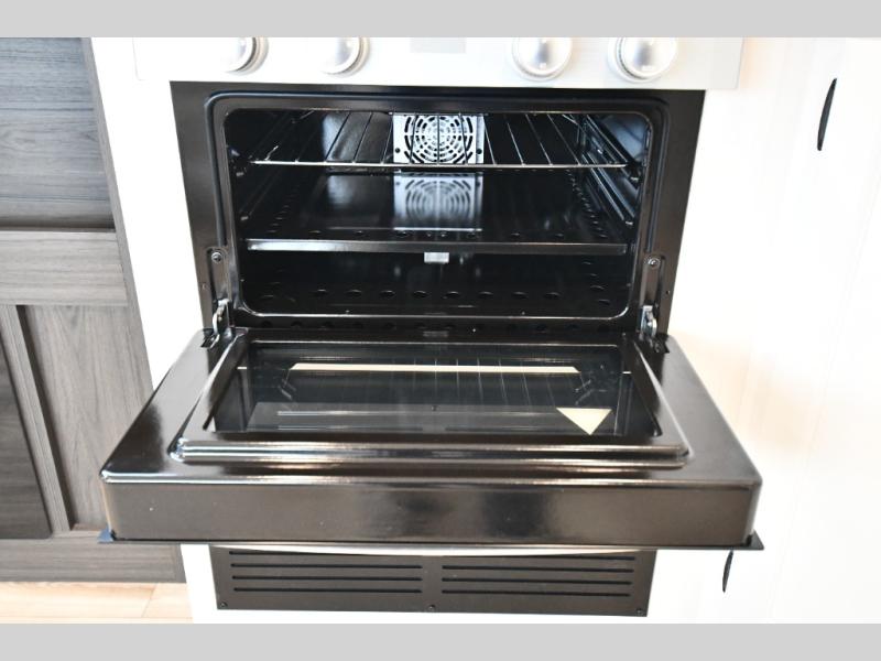 In the heart of the coach, the living area blends comfort and entertainment with modern style. Relax in residential seating while enjoying the large raise-and-lower smart TV and cozy fireplace, creating the perfect atmosphere for movie nights after a day of adventure. The spacious kitchen nearby is designed for real cooking on the road, featuring a three-burner cooktop, oven, large stainless steel sink, and a 10 cu. ft. 12V refrigerator so you can easily prepare meals just like at home.