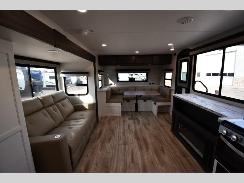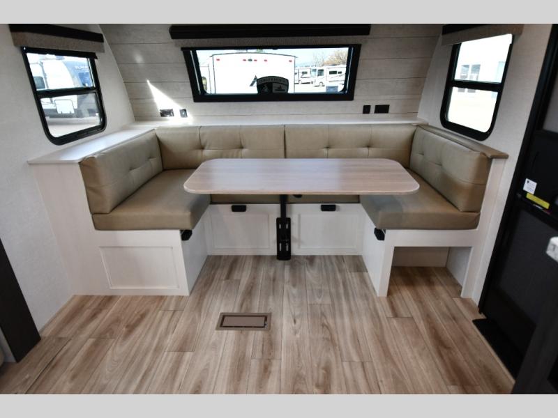 At nearly 34 feet long and sleeping up to four, this travel trailer offers an open, inviting floorplan with dual slide-outs that dramatically expand the living space. The unique front U-shaped dinette is surrounded by large windows, creating a bright and welcoming dining or lounge area perfect for meals, game nights, or relaxing with a view of the campsite.