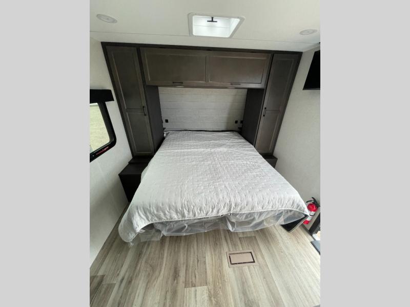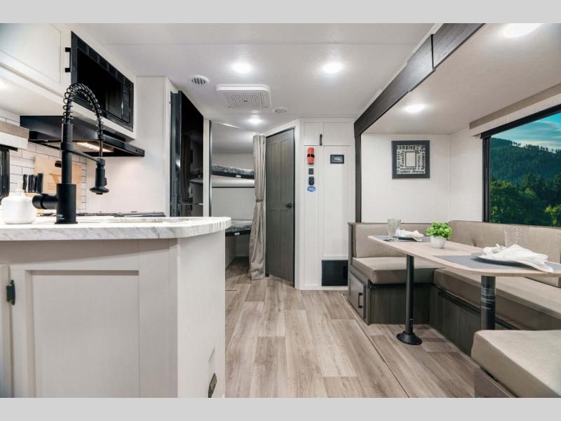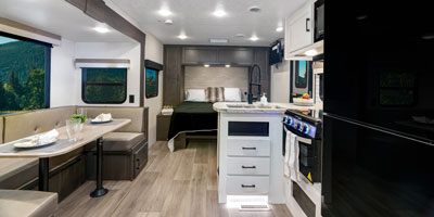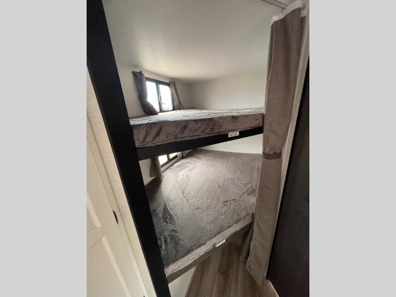 Sleep tight with your family on the road! This travel trailer is special for the whole family since it has plenty of space for sleep. First we have the 60" x 80" queen bed, the 51" x 75" double size bunk bed, and you can also sleep two people on the 88" x 48" U shaped dinette. Cook delicious dinner in the incredible kitchen. The L-shape counter includes stainless steel sink with cover and dish drying racks, three cooktop burner, refrigerator, pantry and an overhead cabinet. However, you can also have an amazing cooking time outside thanks to the outdoor kitchen, ideal to share a meal with your family while enjoying nature and its surroundings. Store your belongings in the dual wardrobes beside the bed and also in the pass thru storage. Finally, take a relaxing bath in the full bathroom furnished with a 30" x 36" shower.