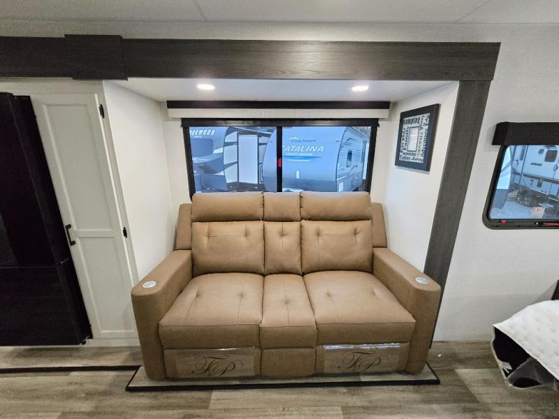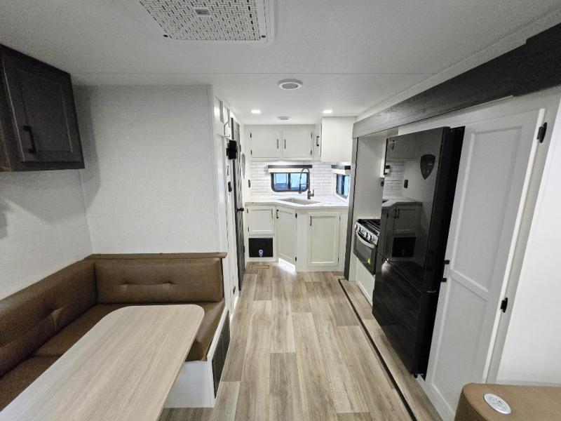 You and your spouse will have a good time at the campground in this travel trailer! The front sleep tight queen bed has shelves and overhead cabinets to keep your items close by but out of the way. Grab some eggs from the 10 cu. ft. refrigerator to fry them up on the three burner cooktop then enjoy them at the 88" x 42" U-shaped dinette which has an entertainment center above it. After a fun, long day at the beach you can freshen up in the rear corner bathroom in the 30" x 36" shower then relax on the theater seating with USB ports and cupholders!