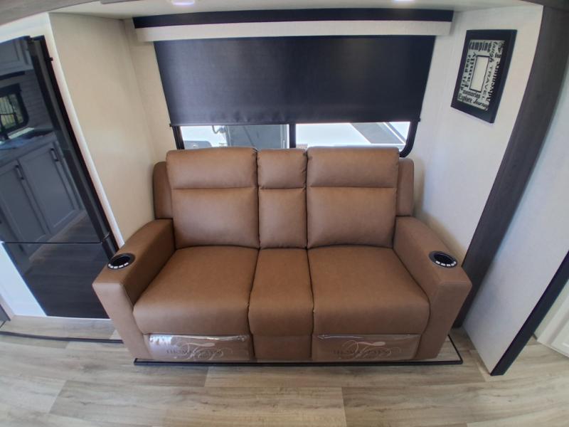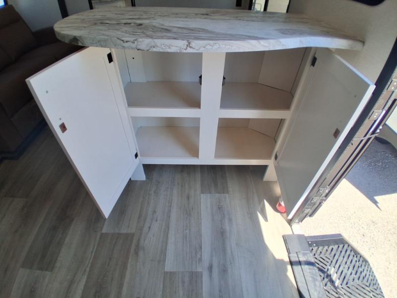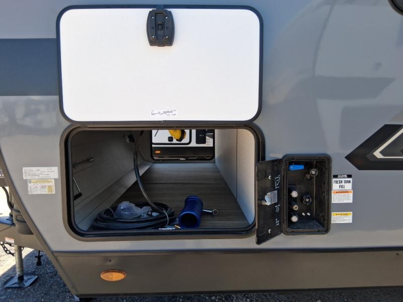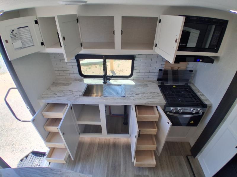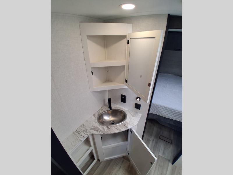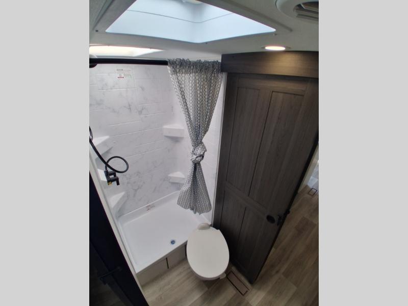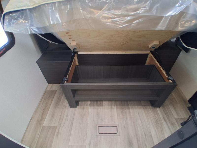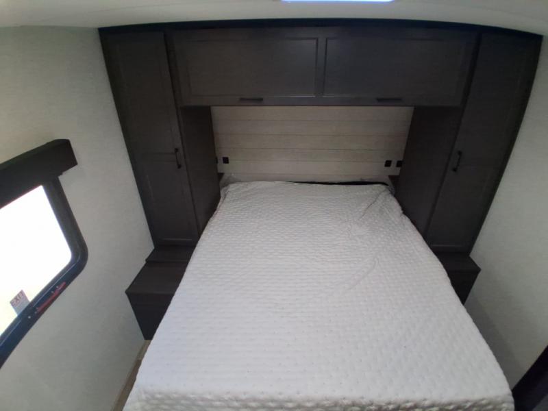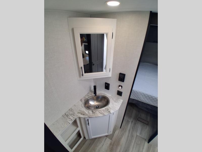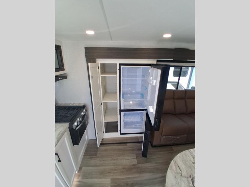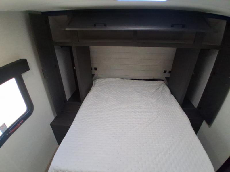 Sleep tight on the road! This travel trailer is special for four. First we have the 60" x 80" queen bed, and two people can easily fit on the sit n' slide dinette. Cook delicious dinner in the incredible kitchen. The counter includes a stainless steel sink with cover and dish drying racks, three cooktop burner, and an overhead cabinet. There is also a 10 cu. fridge and pantry for food storage. You can also have a relaxing time on the theater seating with USB port on each side. Store your belongings in the dual wardrobe beside the bed and also on the pass thru storage. Finally, take a relaxing bath in the walk thru bathroom furnished with a 30" x 36" shower.