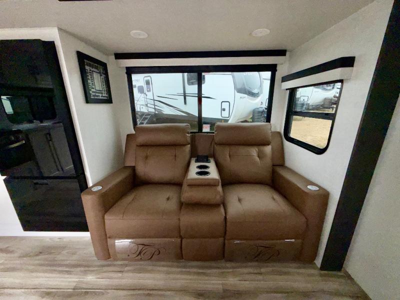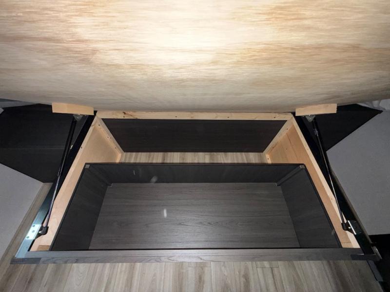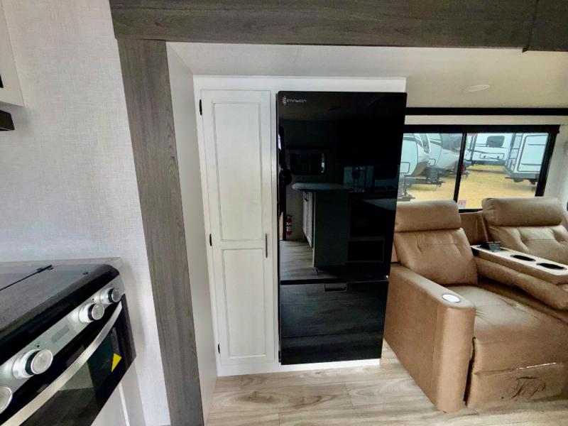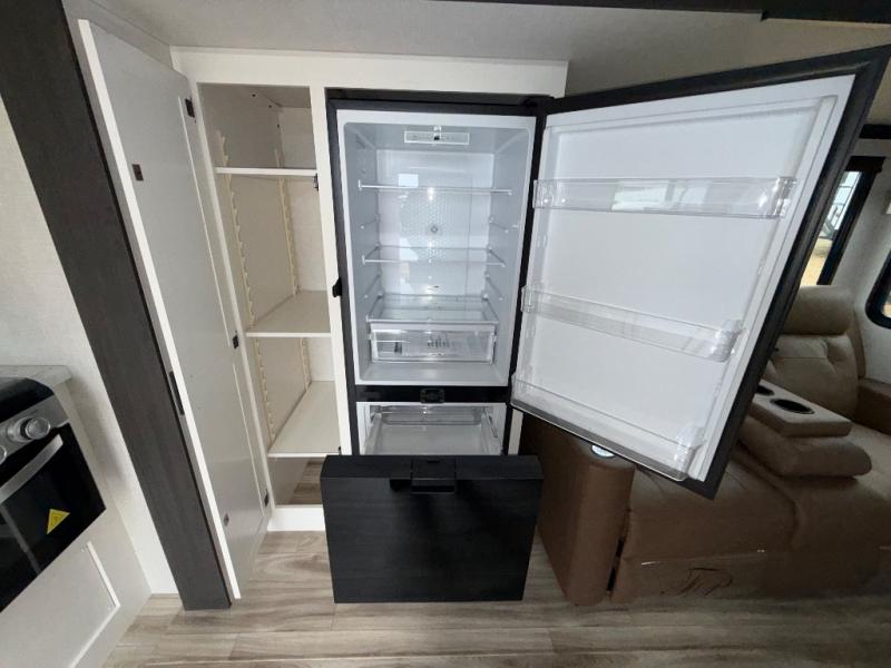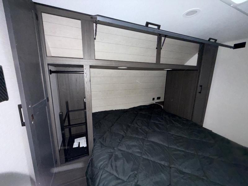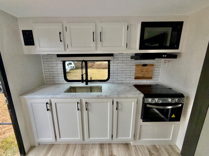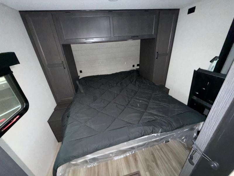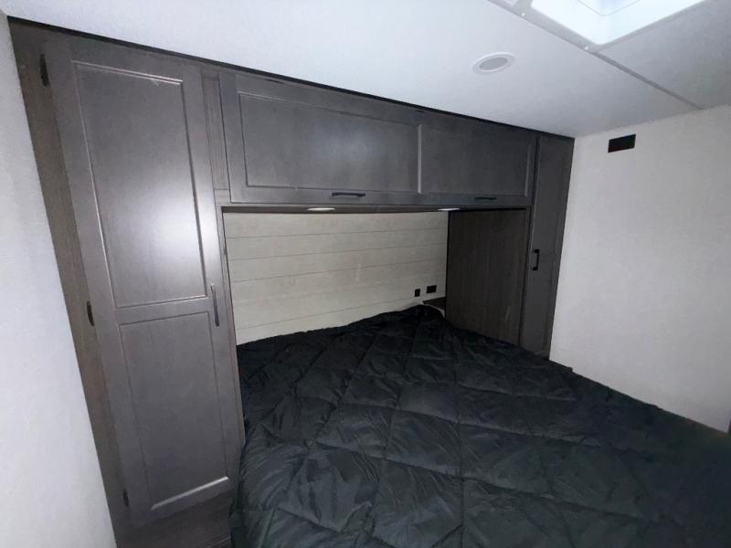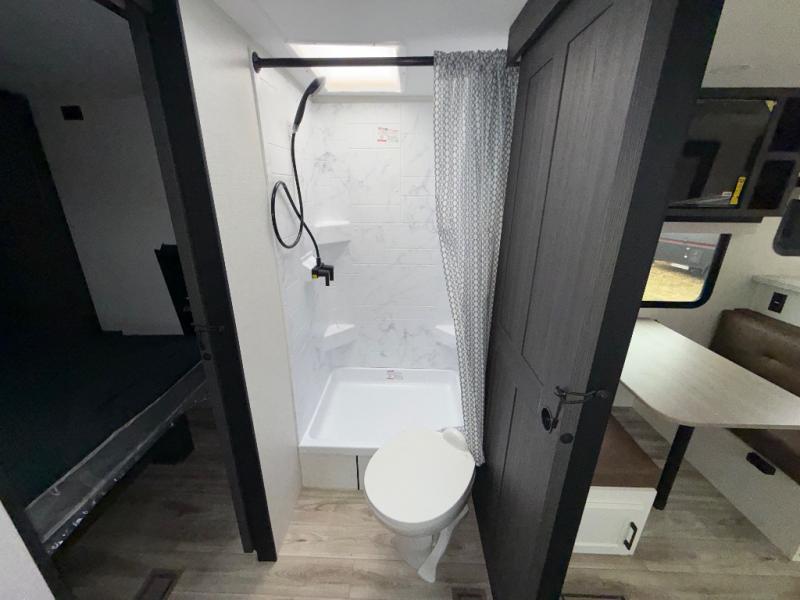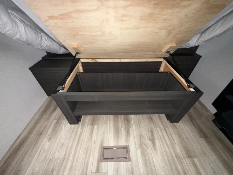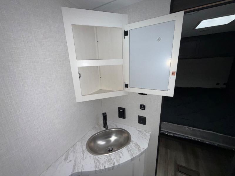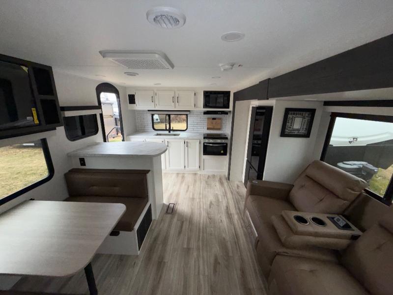 Sleep tight on the road! This travel trailer is special for four. First we have the 60" x 80" queen bed, and two people can easily fit on the sit n' slide dinette. Cook delicious dinner in the incredible kitchen. The counter includes a stainless steel sink with cover and dish drying racks, three cooktop burner, and an overhead cabinet. There is also a 10 cu. fridge and pantry for food storage. You can also have a relaxing time on the theater seating with USB port on each side. Store your belongings in the dual wardrobe beside the bed and also on the pass thru storage. Finally, take a relaxing bath in the walk thru bathroom furnished with a 30" x 36" shower.