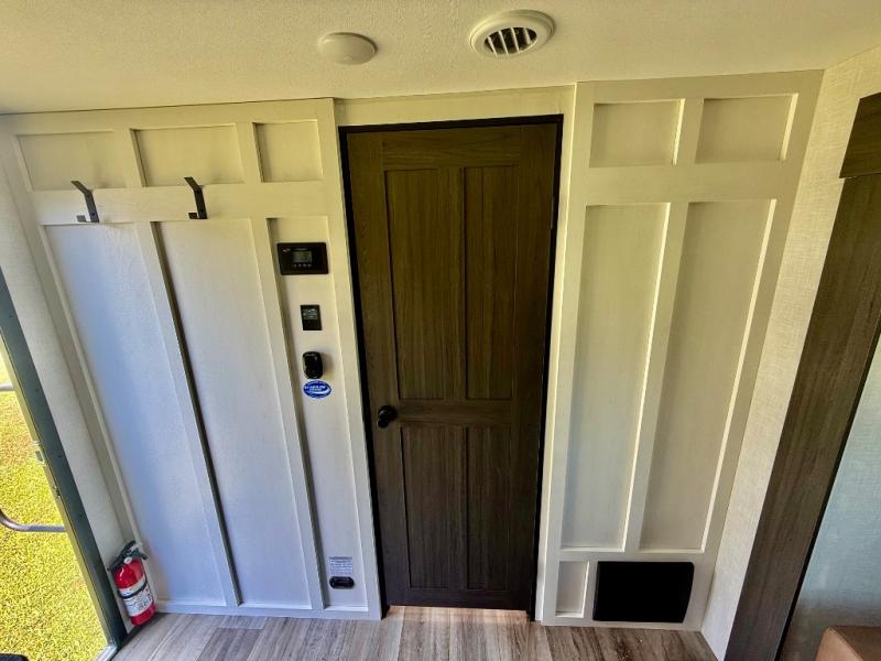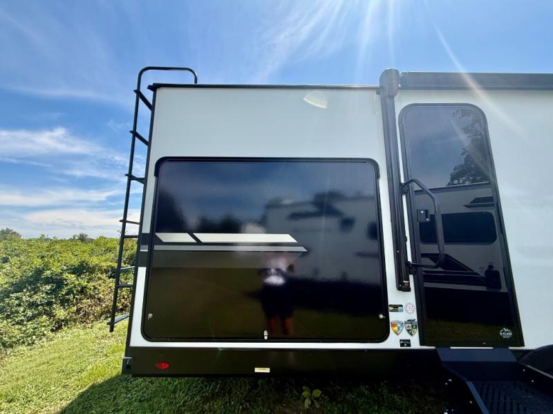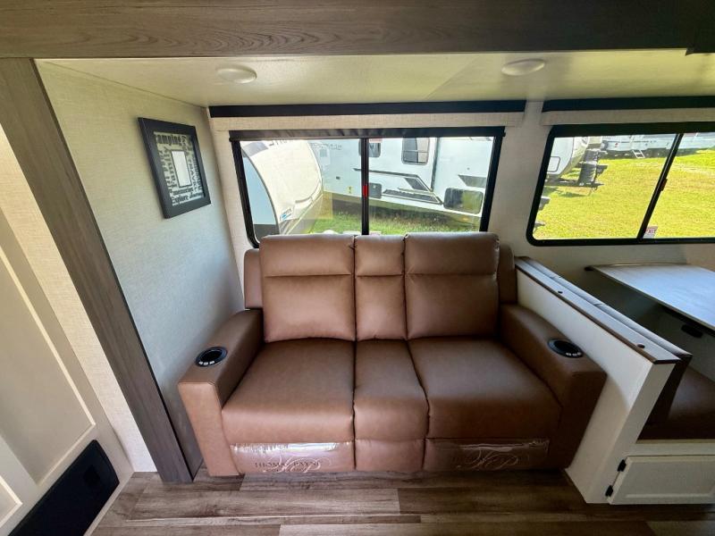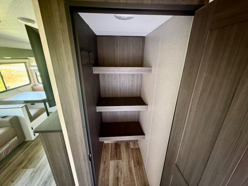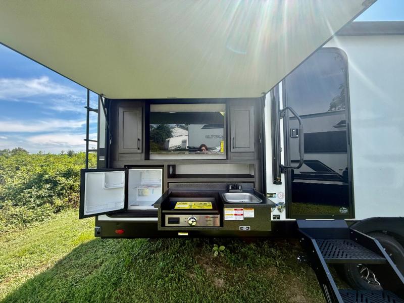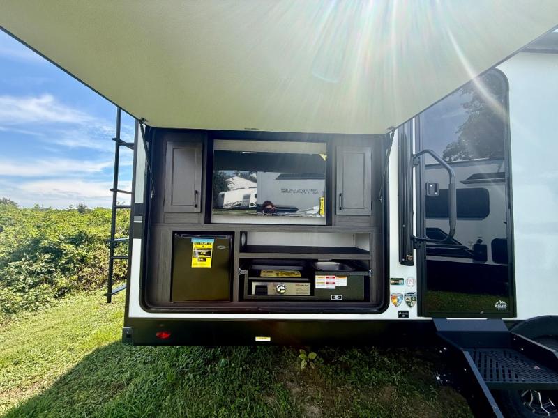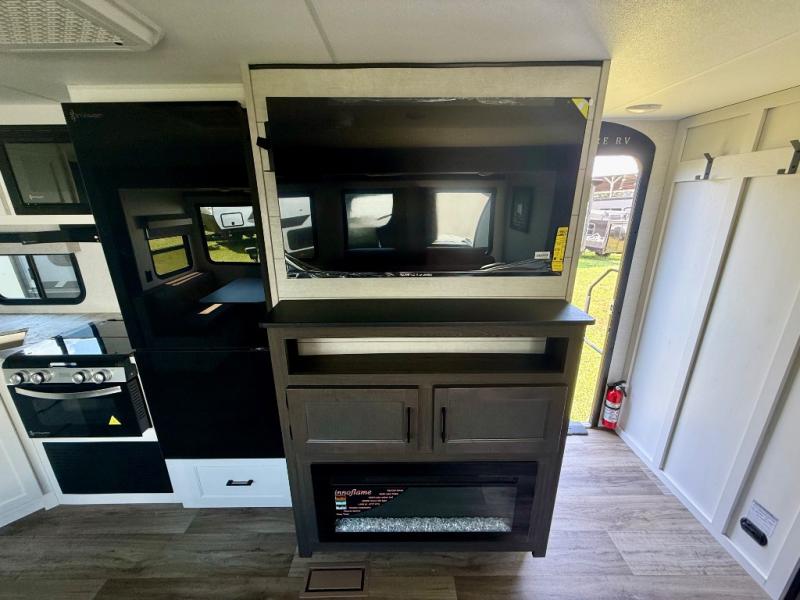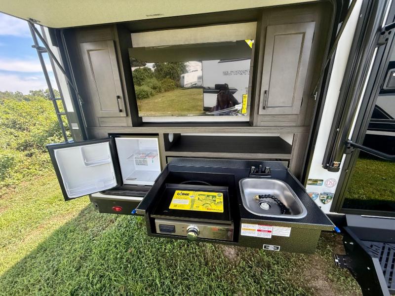 You're going to feel right at home in this Stratus single slide unit! There is not only a fully equipped kitchen with a three burner cooktop, but also an outside campfire café with a griddle, refrigerator, sink, and even an exterior 40" TV for your entertainment. As you enter the unit, you will notice to the right a walk-in pantry with coat hooks, and to the left is the full rear bathroom with a 30" x 36" shower, a three door linen closet, and a cabinet prepped to add an optional washer and dryer. If mother nature rains on your parade then relax inside on either the 70" sofa or the sit n' slide table dinette across from the entertainment center.