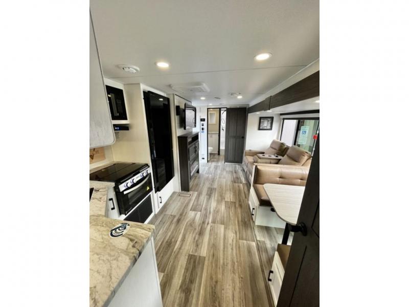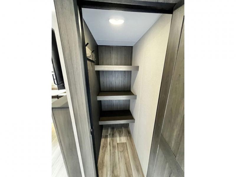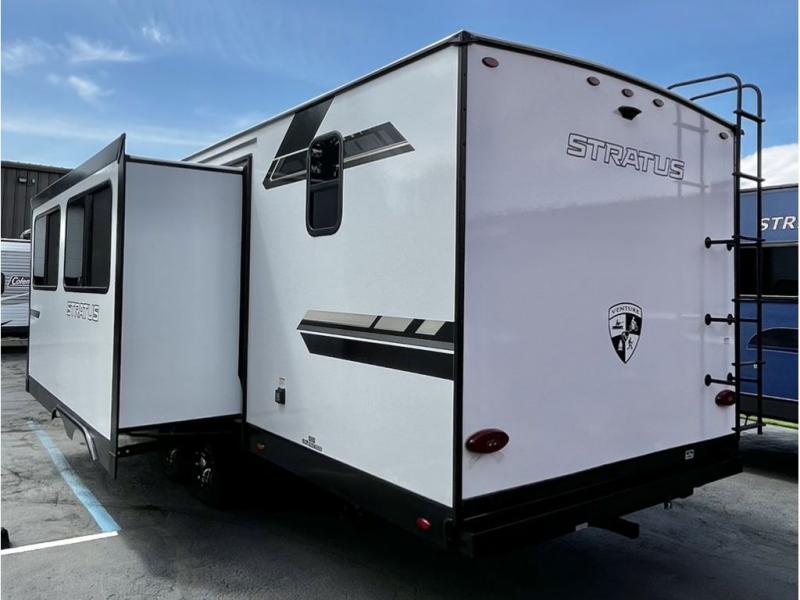 You're going to feel right at home in this Stratus single slide unit! There is not only a fully equipped kitchen with a three burner cooktop, but also an outside campfire café with a griddle, refrigerator, sink, and even an exterior 40" TV for your entertainment. As you enter the unit, you will notice to the right a walk-in pantry with coat hooks, and to the left is the full rear bathroom with a 30" x 36" shower, a three door linen closet, and a cabinet prepped to add an optional washer and dryer. If mother nature rains on your parade then relax inside on either the 70" sofa or the sit n' slide table dinette across from the entertainment center.