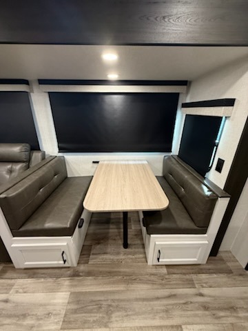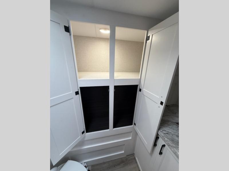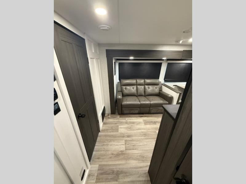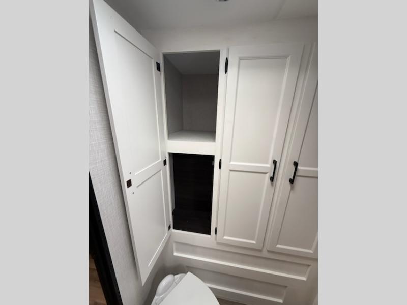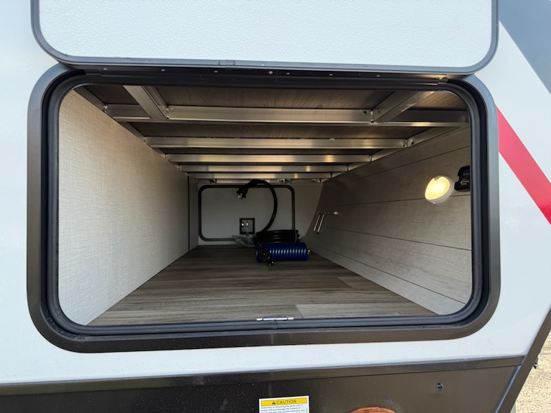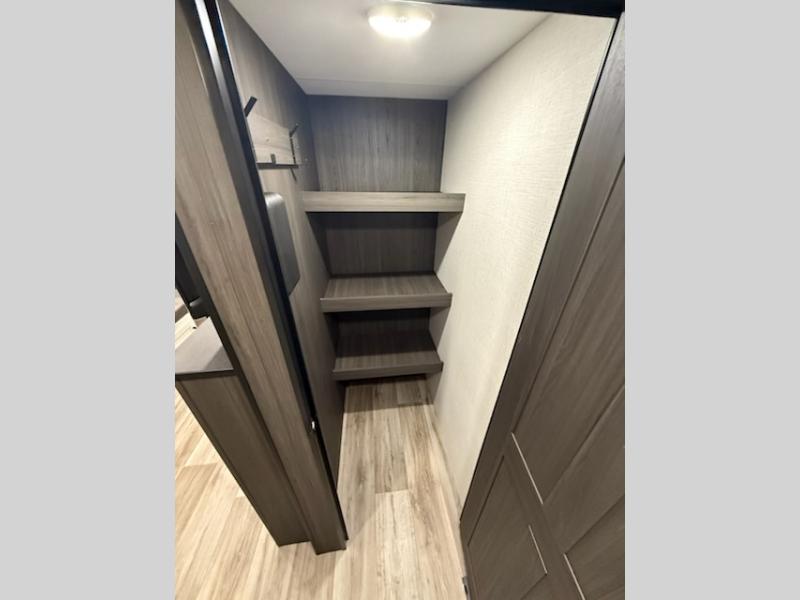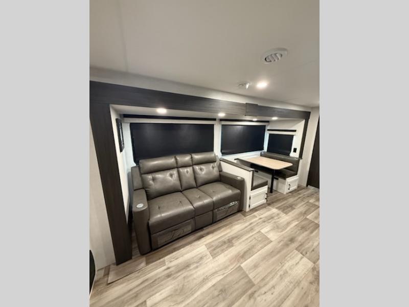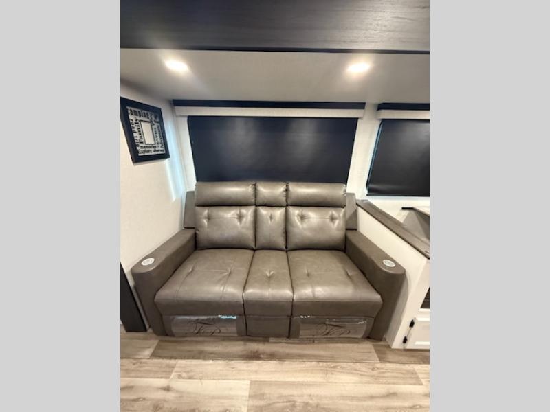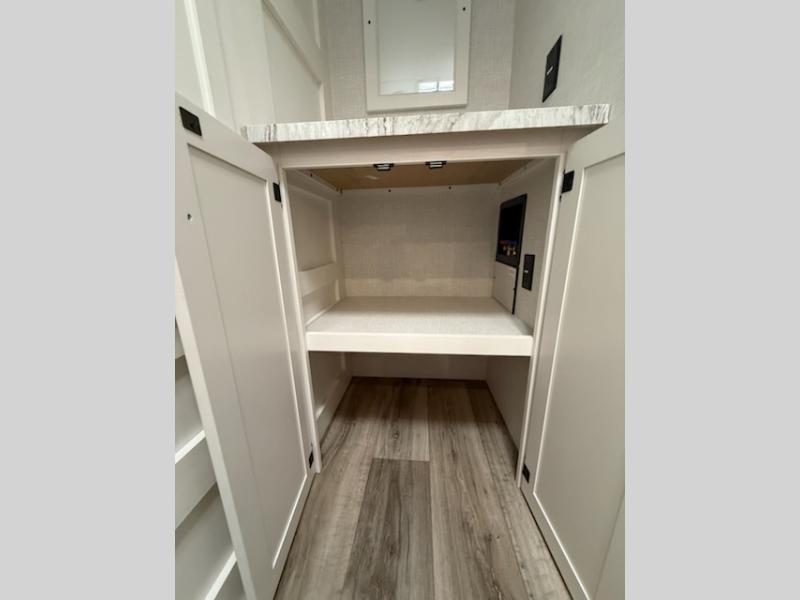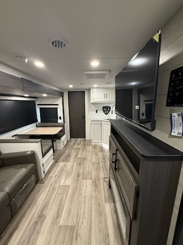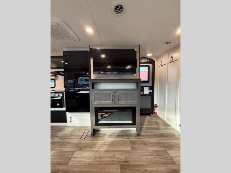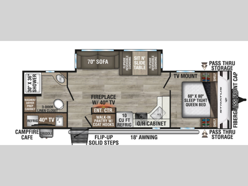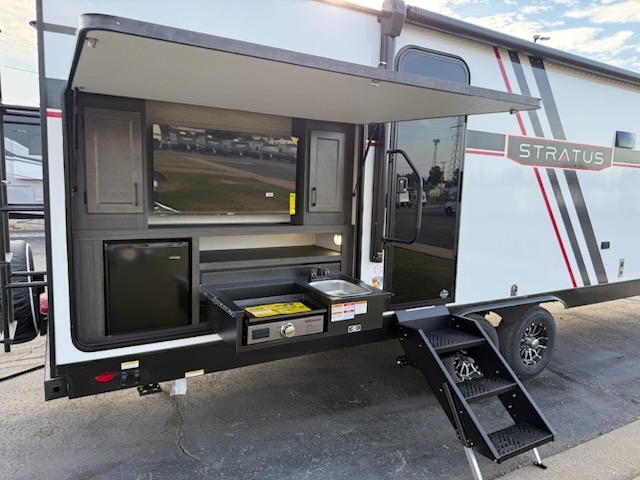 You're going to feel right at home in this Stratus single slide unit! There is not only a fully equipped kitchen with a three burner cooktop, but also an outside campfire café with a griddle, refrigerator, sink, and even an exterior 40" TV for your entertainment. As you enter the unit, you will notice to the right a walk-in pantry with coat hooks, and to the left is the full rear bathroom with a 30" x 36" shower, a three door linen closet, and a cabinet prepped to add an optional washer and dryer. If mother nature rains on your parade then relax inside on either the 70" sofa or the sit n' slide table dinette across from the entertainment center.