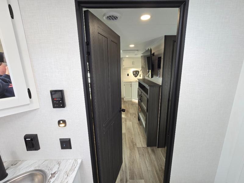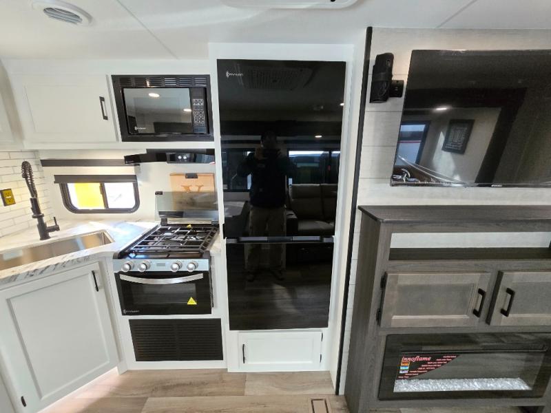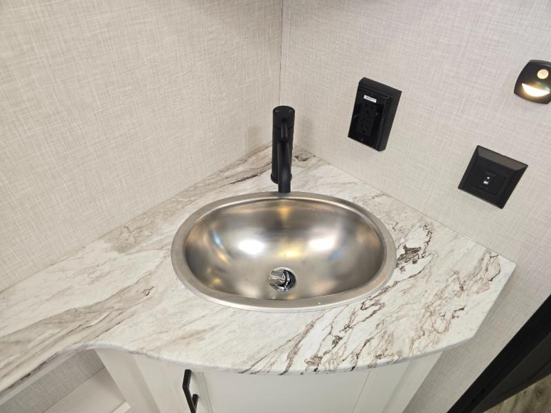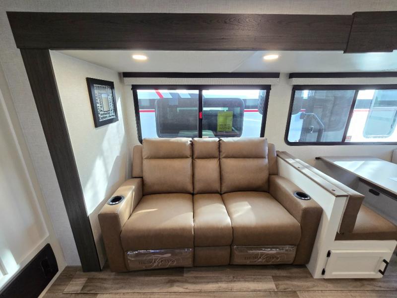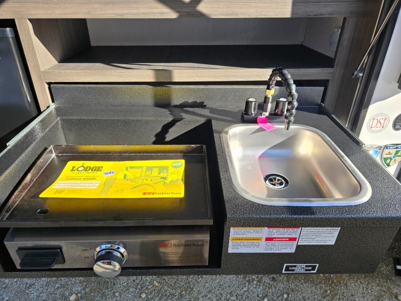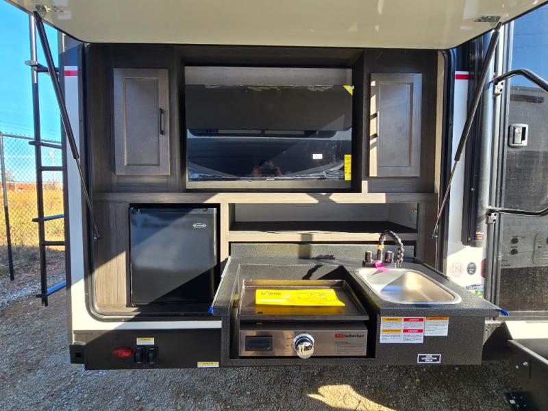 You're going to feel right at home in this Stratus single slide unit! There is not only a fully equipped kitchen with a three burner cooktop, but also an outside campfire café with a griddle, refrigerator, sink, and even an exterior 40" TV for your entertainment. As you enter the unit, you will notice to the right a walk-in pantry with coat hooks, and to the left is the full rear bathroom with a 30" x 36" shower, a three door linen closet, and a cabinet prepped to add an optional washer and dryer. If mother nature rains on your parade then relax inside on either the 70" sofa or the sit n' slide table dinette across from the entertainment center.