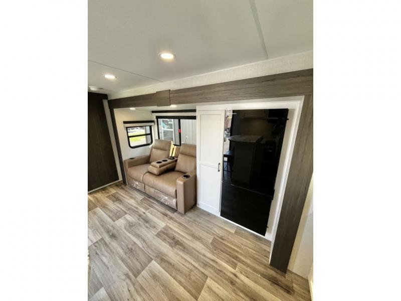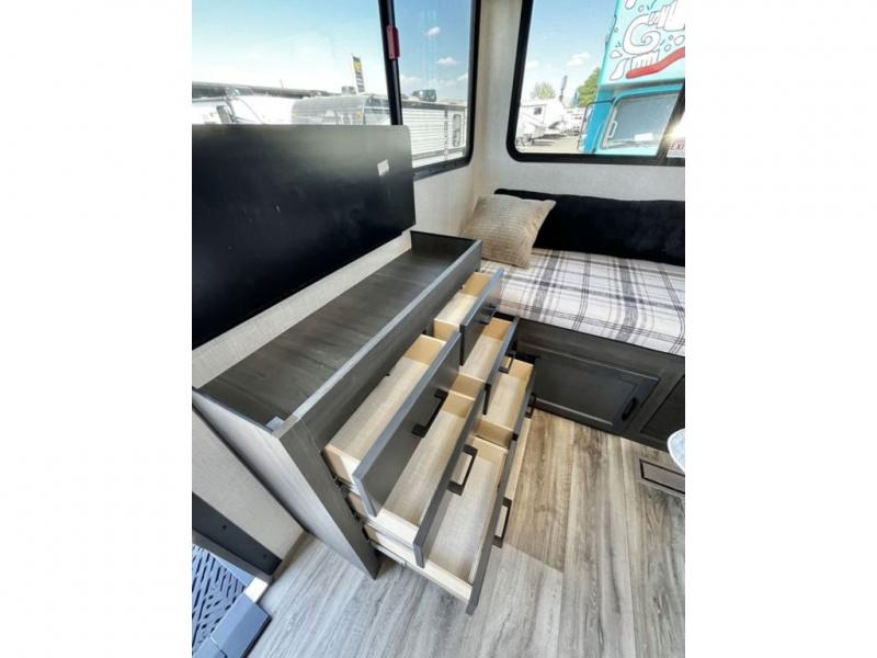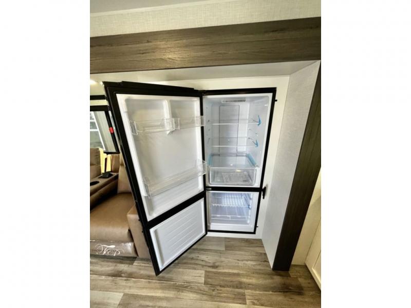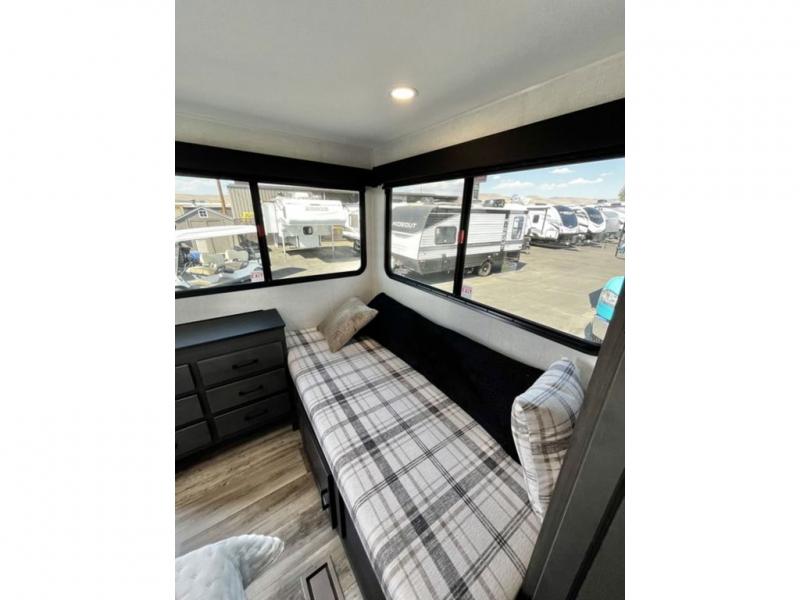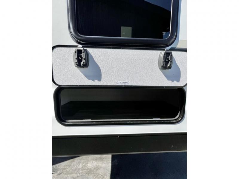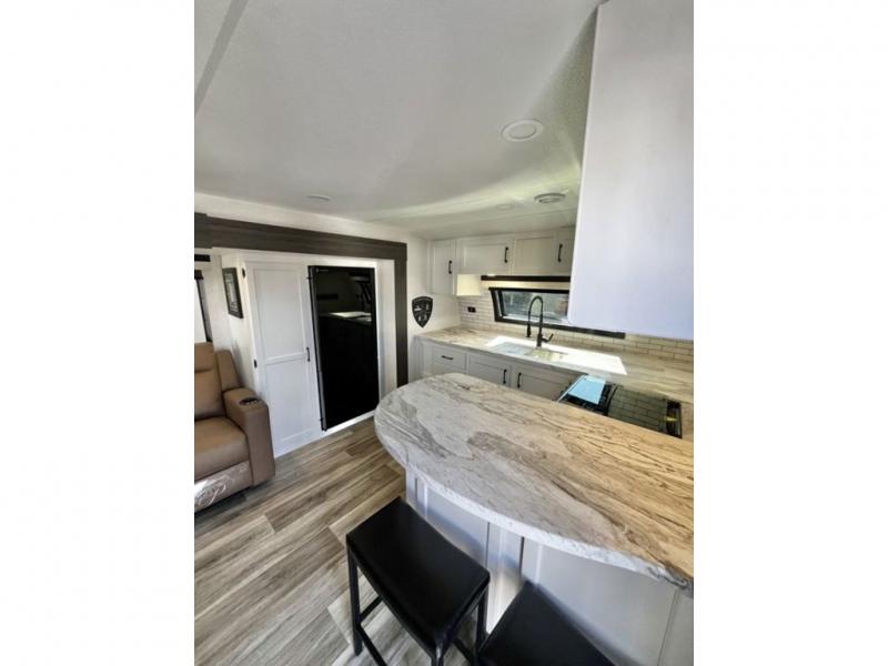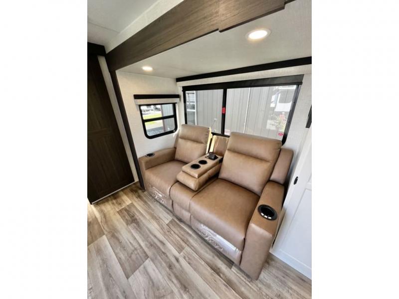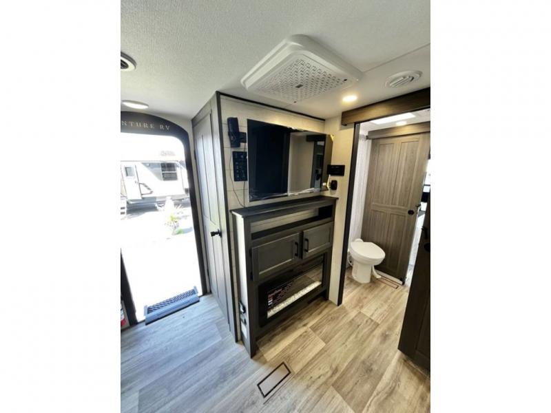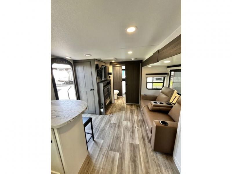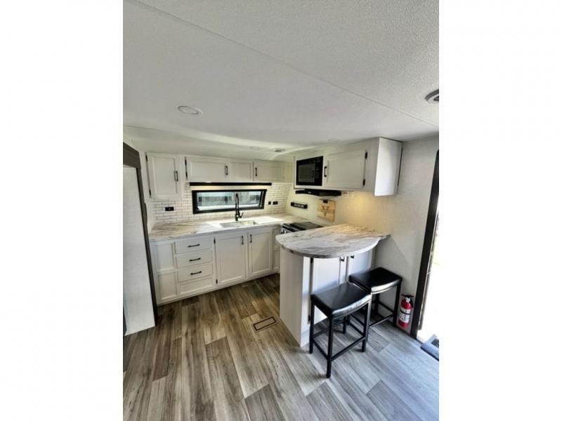 This travel trailer is special for two. Sleep tight in the bedroom on the 60" x 80" queen bed also, store your belongings inside the dresser, and closet, this last one has a bench with sit for added comfort plus, delight yourself with the astonishing panoramic view window. Cook delicious dinner in the incredible spacious front kitchen. It includes stainless steel sink with cover and dish drying racks, three cooktop burner, refrigerator, pantry, bar with stools and an over head cabinet. In addition, experience a fun moment in the living room thanks to the 40" TV, theater sitting with USB ports on each side of it and fireplace for full coziness. Finally, take a relaxing bath in the walk thru bathroom furnished with a 30" x 36" shower.