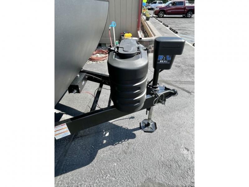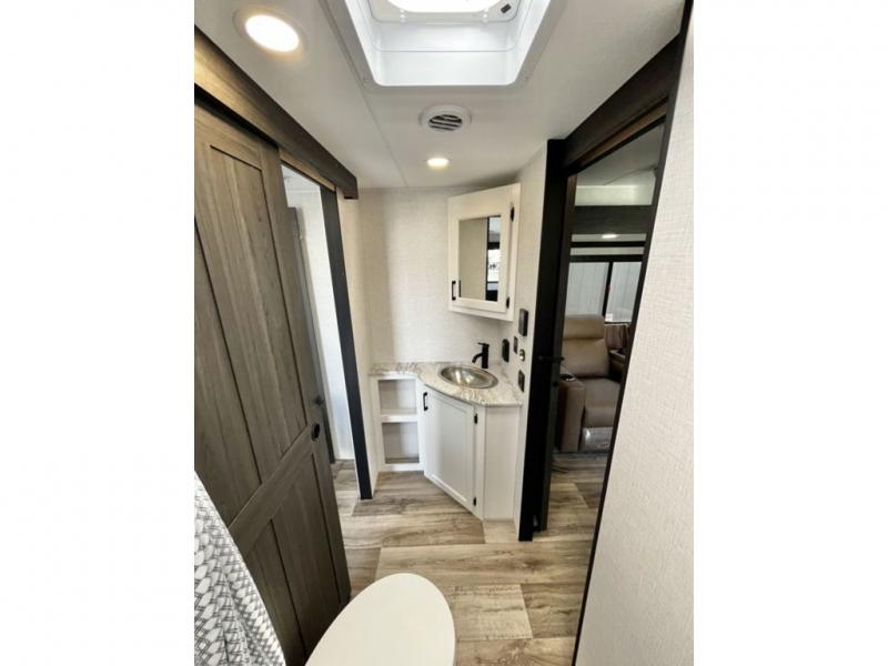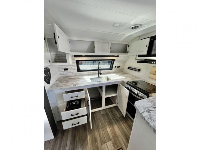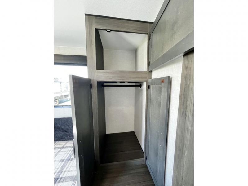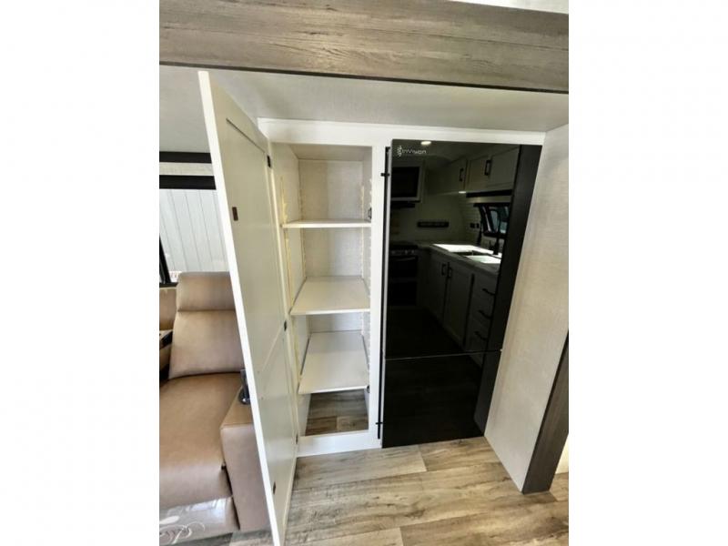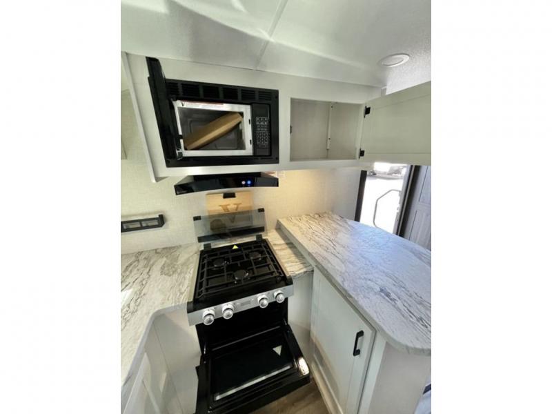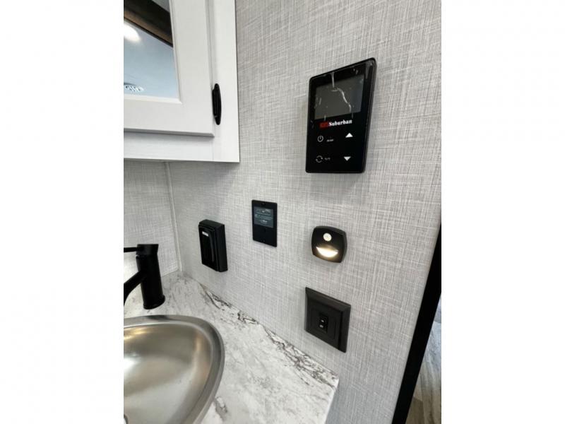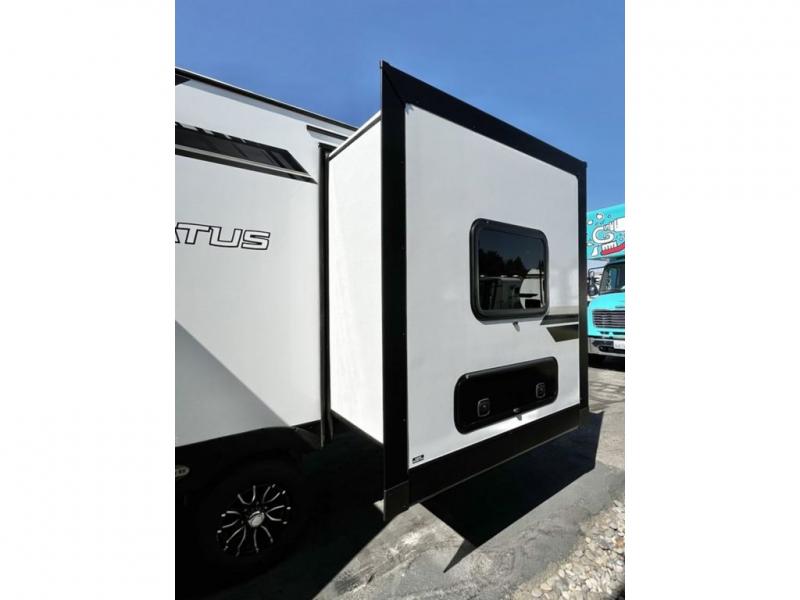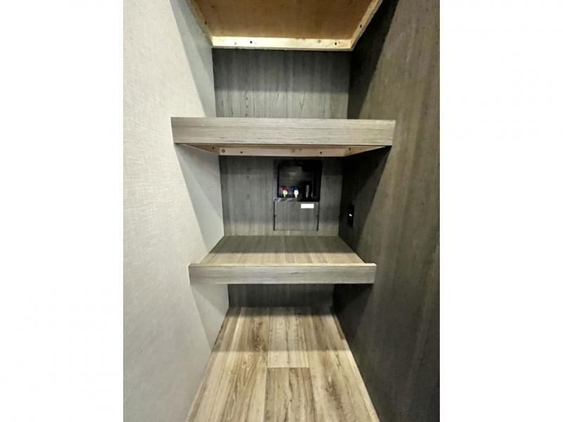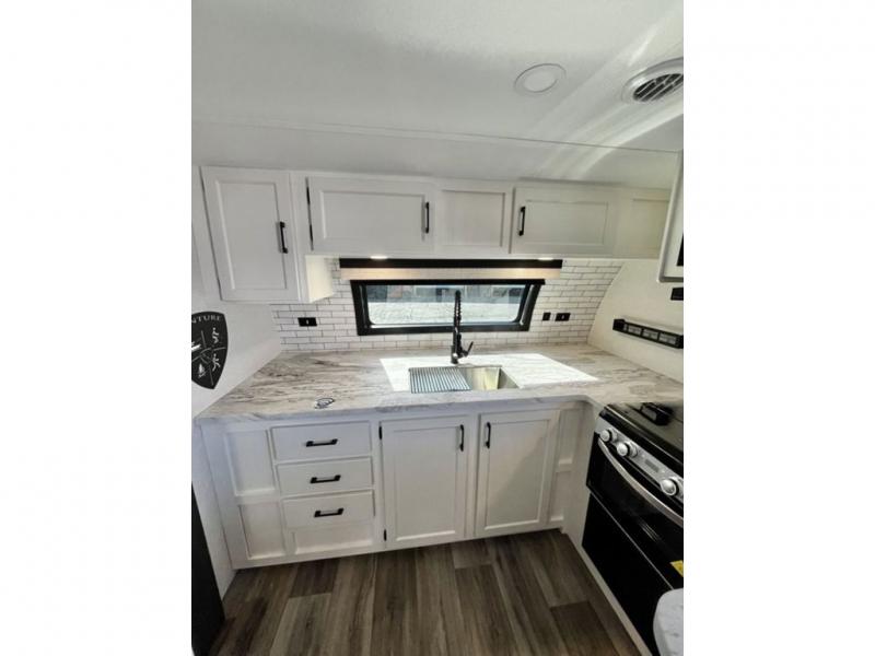 This travel trailer is special for two. Sleep tight in the bedroom on the 60" x 80" queen bed also, store your belongings inside the dresser, and closet, this last one has a bench with sit for added comfort plus, delight yourself with the astonishing panoramic view window. Cook delicious dinner in the incredible spacious front kitchen. It includes stainless steel sink with cover and dish drying racks, three cooktop burner, refrigerator, pantry, bar with stools and an over head cabinet. In addition, experience a fun moment in the living room thanks to the 40" TV, theater sitting with USB ports on each side of it and fireplace for full coziness. Finally, take a relaxing bath in the walk thru bathroom furnished with a 30" x 36" shower.