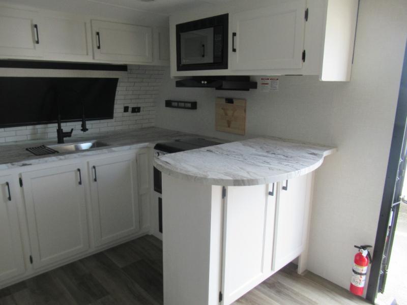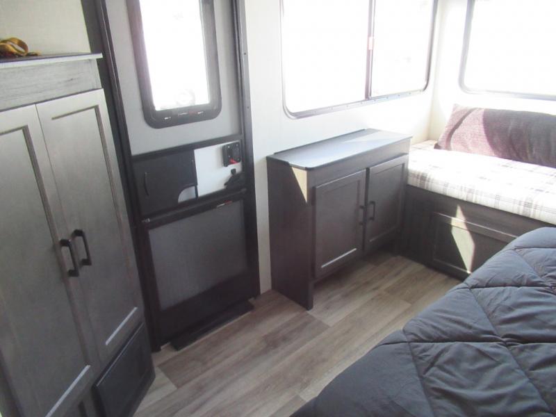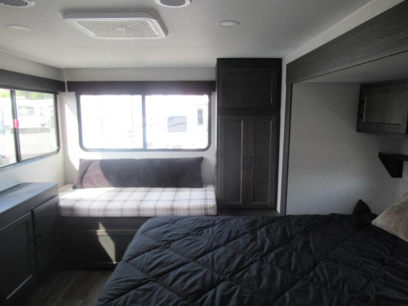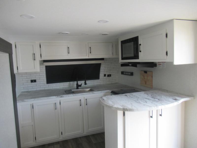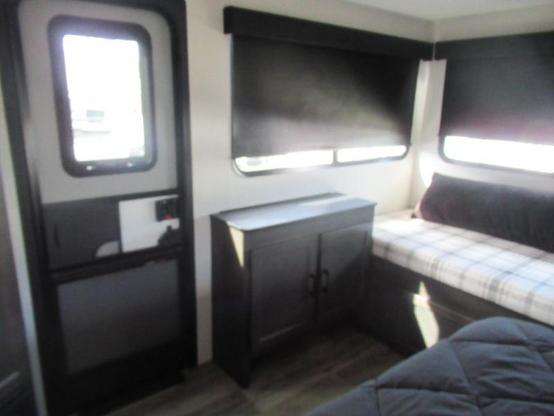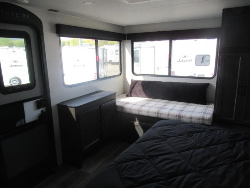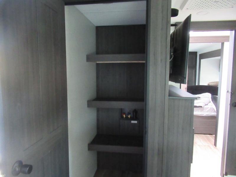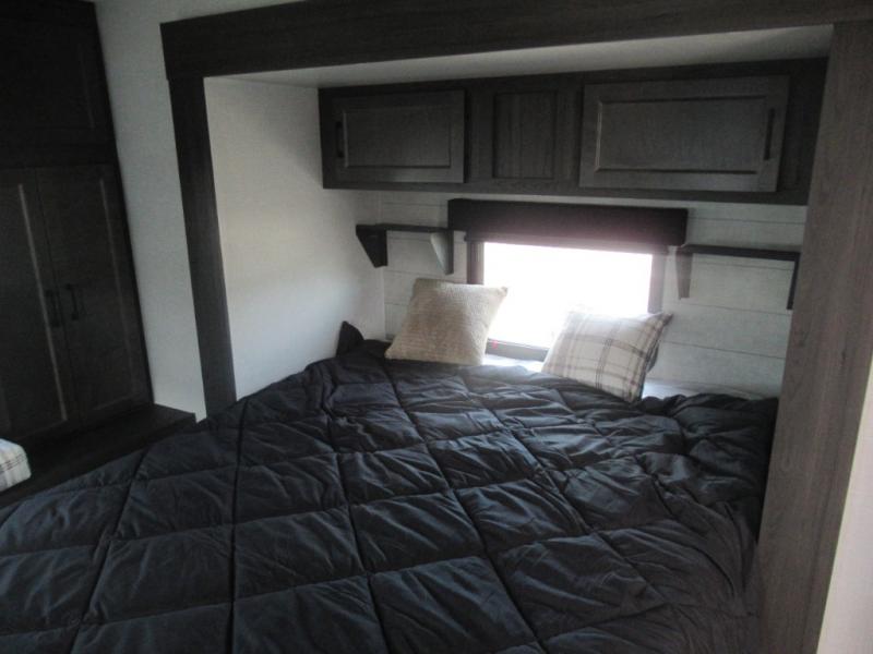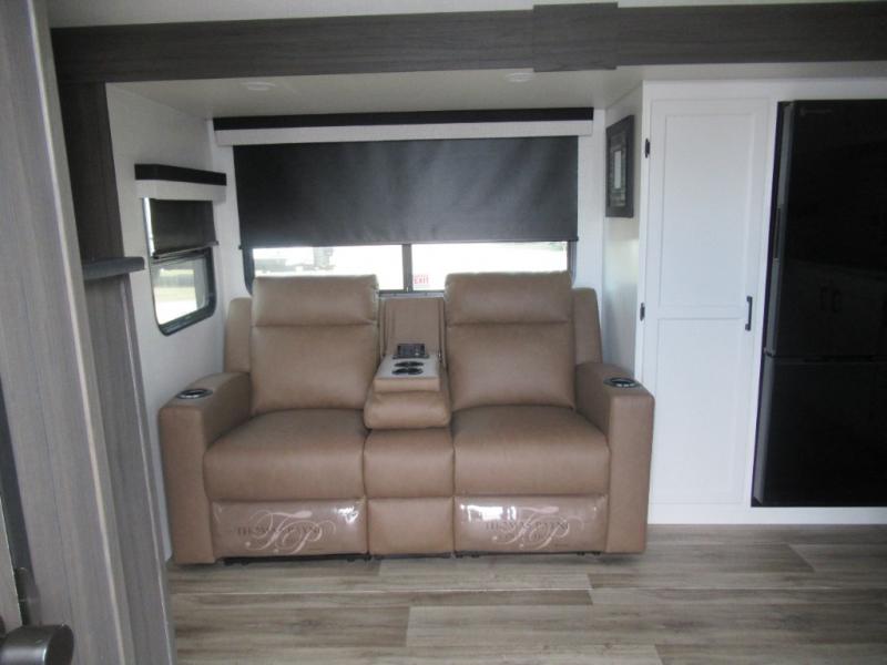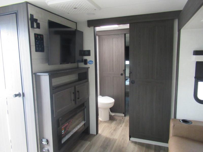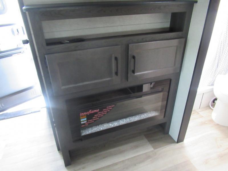 This travel trailer is special for two. Sleep tight in the bedroom on the 60" x 80" queen bed also, store your belongings inside the dresser, and closet, this last one has a bench with sit for added comfort plus, delight yourself with the astonishing panoramic view window. Cook delicious dinner in the incredible spacious front kitchen. It includes stainless steel sink with cover and dish drying racks, three cooktop burner, refrigerator, pantry, bar with stools and an over head cabinet. In addition, experience a fun moment in the living room thanks to the 40" TV, theater sitting with USB ports on each side of it and fireplace for full coziness. Finally, take a relaxing bath in the walk thru bathroom furnished with a 30" x 36" shower.