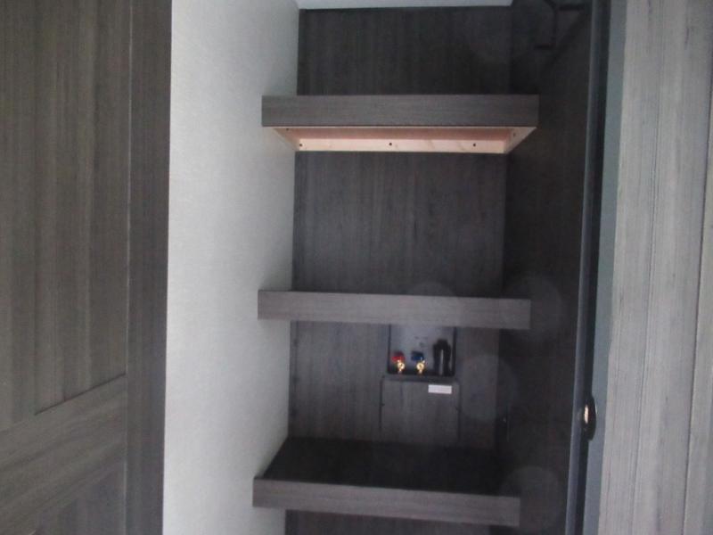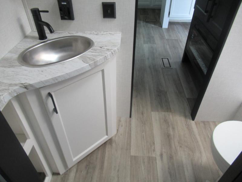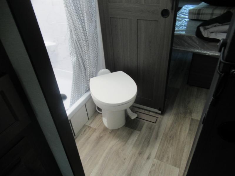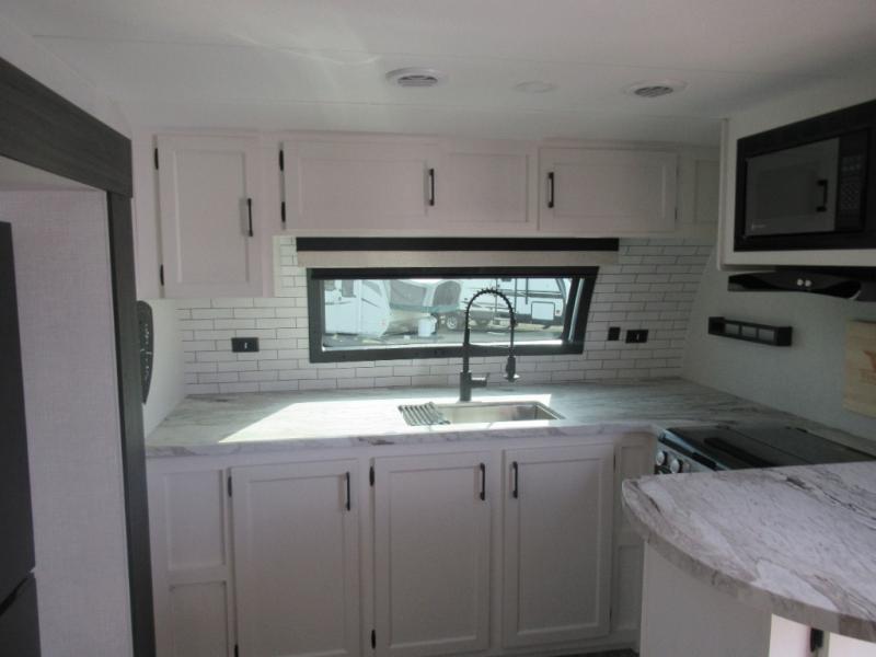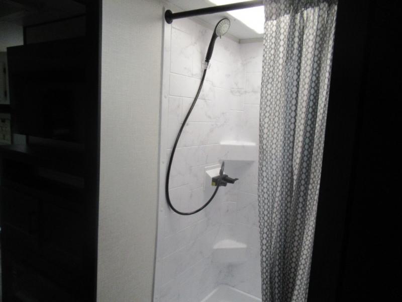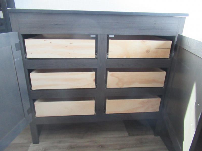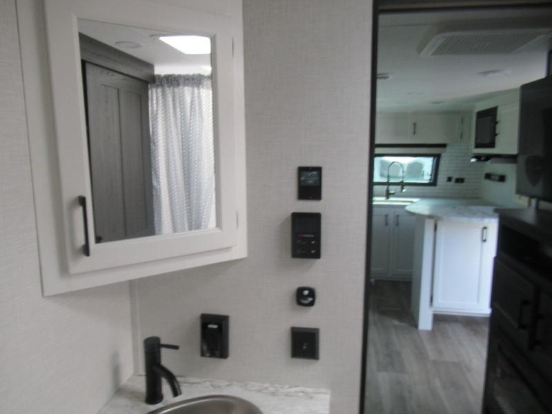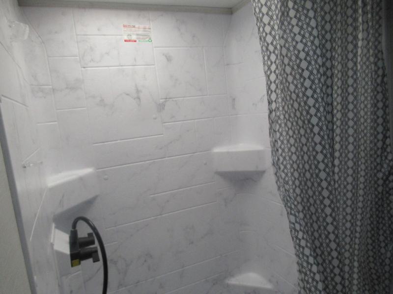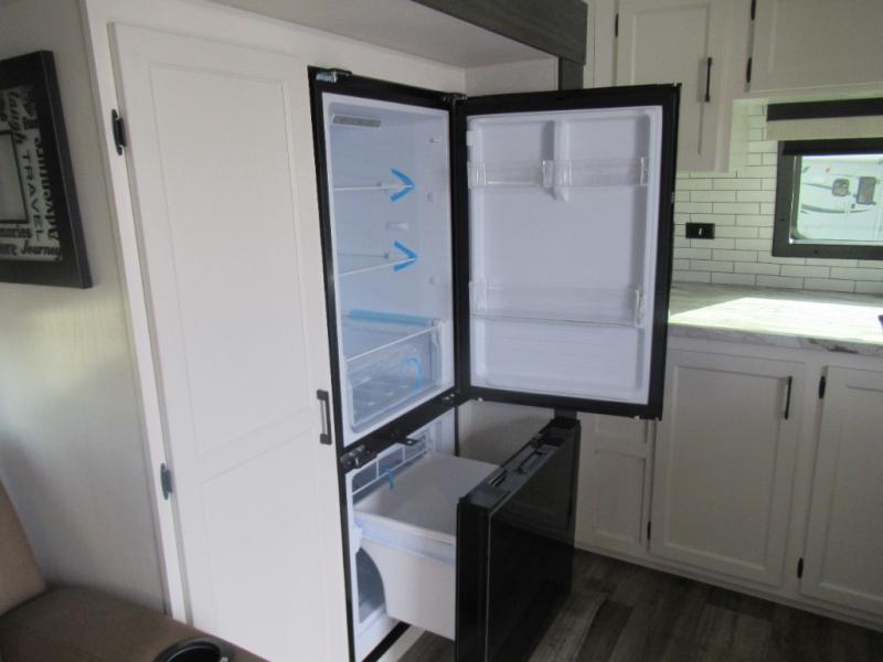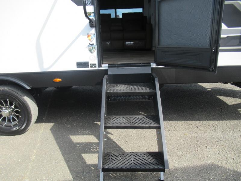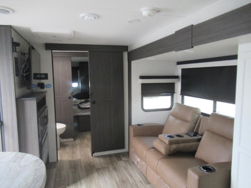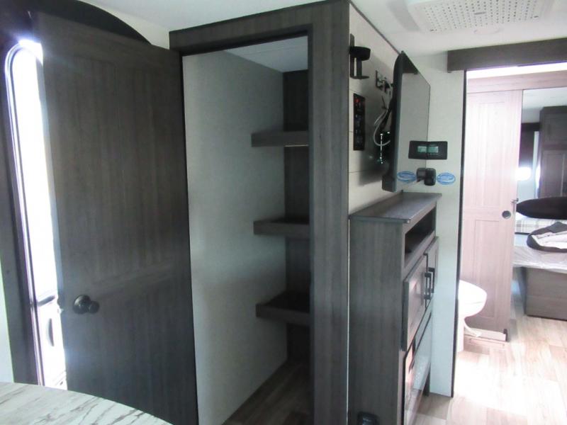 This travel trailer is special for two. Sleep tight in the bedroom on the 60" x 80" queen bed also, store your belongings inside the dresser, and closet, this last one has a bench with sit for added comfort plus, delight yourself with the astonishing panoramic view window. Cook delicious dinner in the incredible spacious front kitchen. It includes stainless steel sink with cover and dish drying racks, three cooktop burner, refrigerator, pantry, bar with stools and an over head cabinet. In addition, experience a fun moment in the living room thanks to the 40" TV, theater sitting with USB ports on each side of it and fireplace for full coziness. Finally, take a relaxing bath in the walk thru bathroom furnished with a 30" x 36" shower.