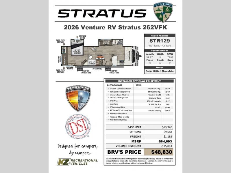 Venture RV Stratus Ultra-Lite 262VFK Highlights: