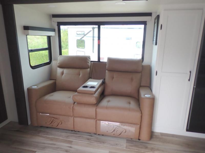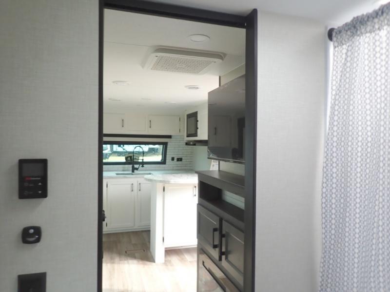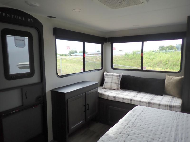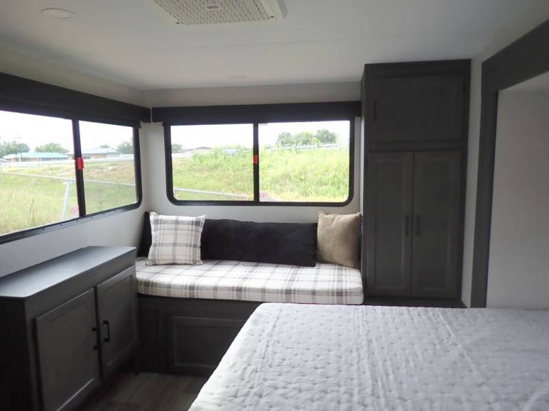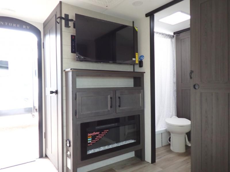 This travel trailer is special for two. Sleep tight in the bedroom on the 60" x 80" queen bed also, store your belongings inside the dresser, and closet, this last one has a bench with sit for added comfort plus, delight yourself with the astonishing panoramic view window. Cook delicious dinner in the incredible spacious front kitchen. It includes stainless steel sink with cover and dish drying racks, three cooktop burner, refrigerator, pantry, bar with stools and an over head cabinet. In addition, experience a fun moment in the living room thanks to the 40" TV, theater sitting with USB ports on each side of it and fireplace for full coziness. Finally, take a relaxing bath in the walk thru bathroom furnished with a 30" x 36" shower.