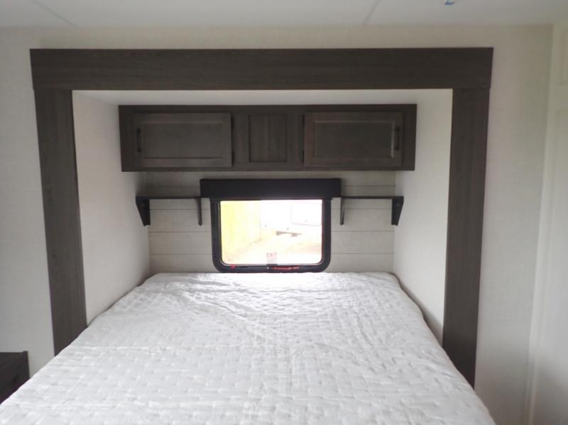 The living room comes with theater seating, an entertainment center, fireplace, and 40" TV. A couple of other standout features for the Stratus 262VFK is that it has two entry doors and a nice bench seat in the bedroom. This unit has the Polar White high gloss exterior fiberglass option.