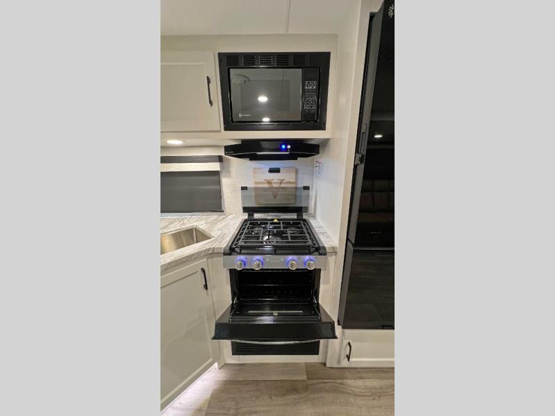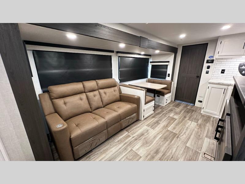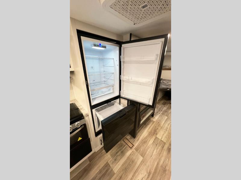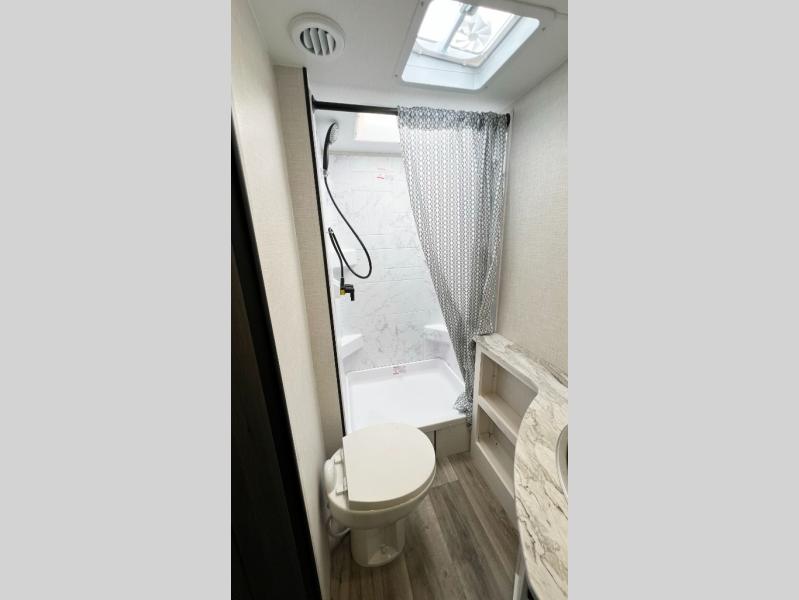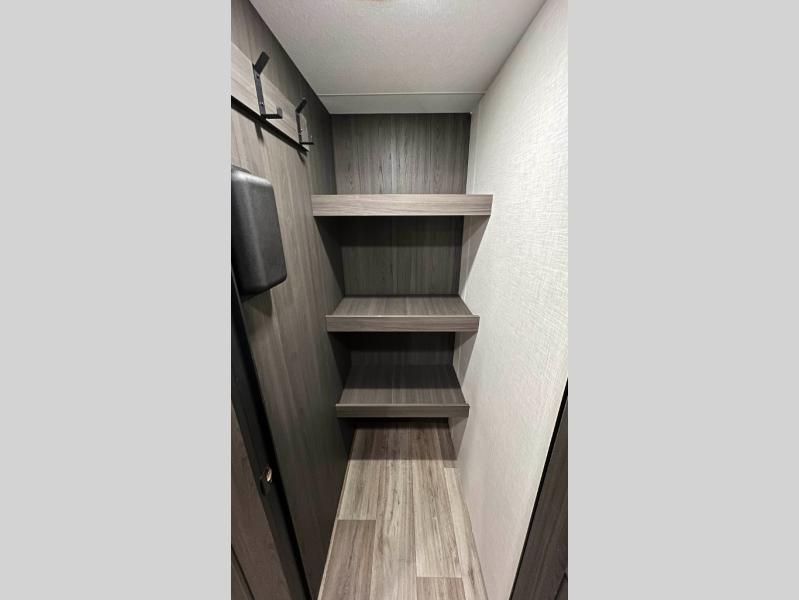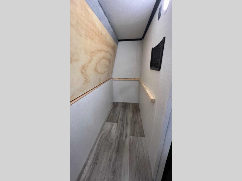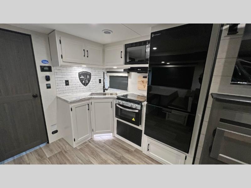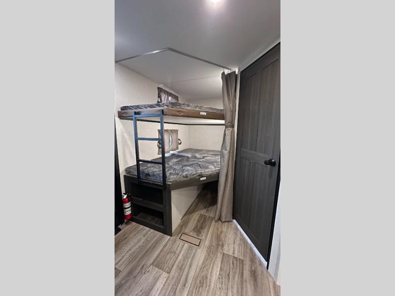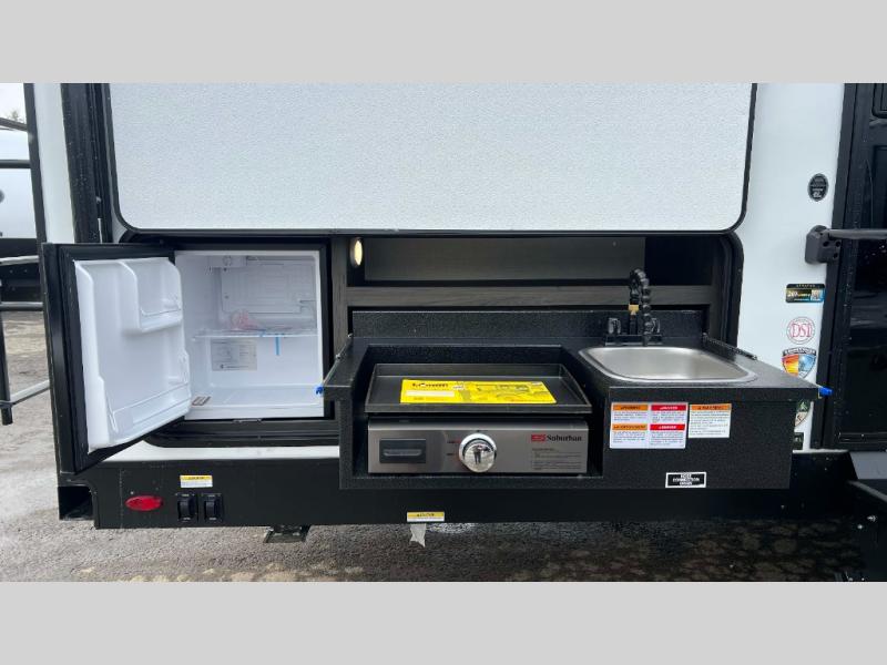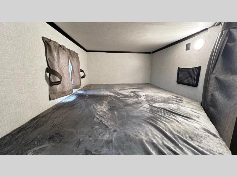 The whole family will have a fun time camping in this travel trailer! You will appreciate having your own space with the front private bedroom that has a sleep tight queen bed to lay your head on at night, and wardrobes on either side to hang your clothes. The kids can sleep on the set of 51" x 75" double bed bunks and can even invite a friend or two to tag along and sleep on either the 70" sofa or the sit n' slide table once they are converted. Everyone can freshen up in the rear corner bathroom featuring a 30" x 36" shower. Behind the entertainment center is a walk-in pantry with coat hooks so you can store your jacket and groceries. The chef will enjoy cooking at the outside campfire café on the griddle, plus there is a refrigerator, and a sink for cleaning up!