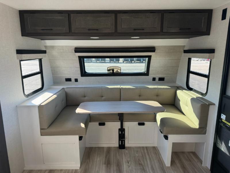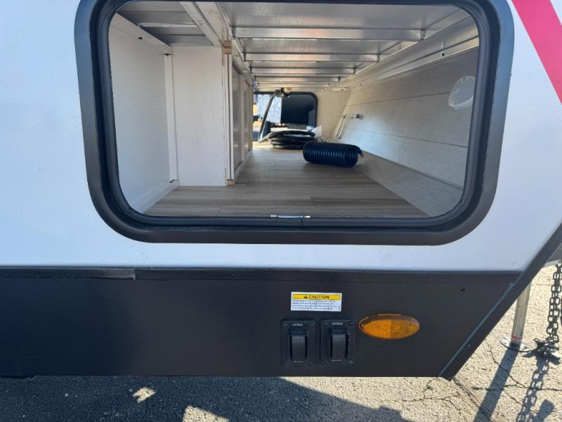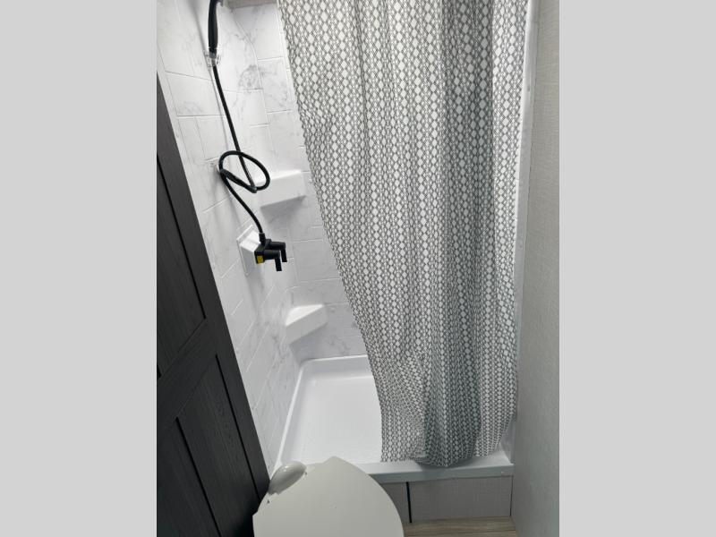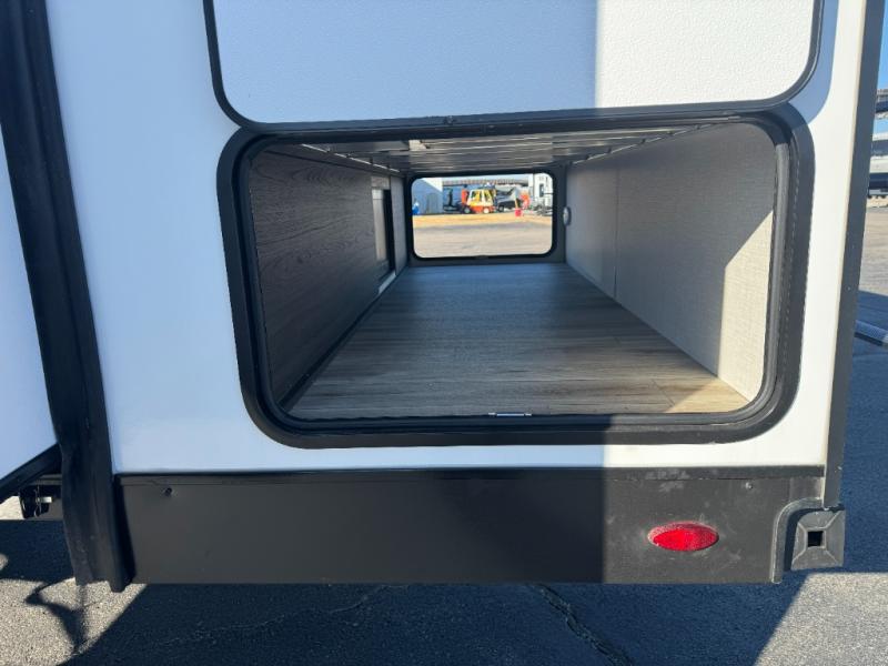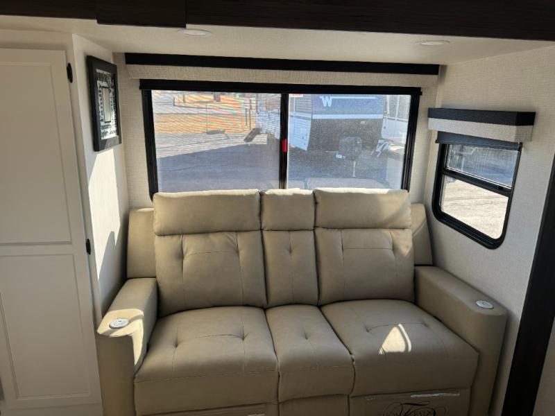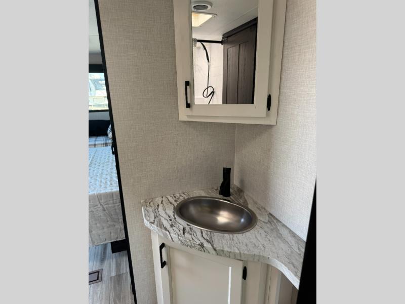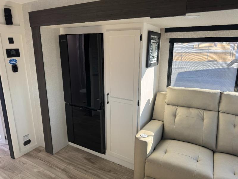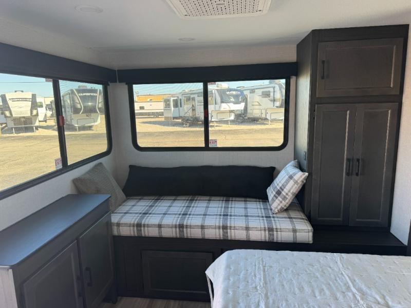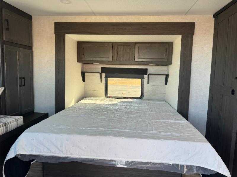 Step inside through one of the two entry doors and you’re welcomed into a thoughtfully designed living and dining area that blends comfort and functionality. At the front, a spacious 42" x 80" U-dinette with a swivel table offers plenty of room to enjoy meals, gather with friends, or play board games. In the slide-out, theater seating with built-in USB ports provides a cozy place to relax, it is next to the 10 cu. ft. refrigerator and pantry for easy access to groceries and dry goods. Across, the kitchen is equipped with essentials including a large stainless steel sink, three-burner cooktop, and ample overhead cabinetry for snacks and cookware. Unwind in the evening with the fireplace and 50" raise-and-lower TV, perfect for movie nights after a day of adventure. The walk-through bathroom features a 30" x 36" shower, making it easy to get ready for the day. At the rear, the bedroom offers a 60" x 80" Sleep Tight queen bed in a slide-out for extra walking space, along with a dresser and bench seat for added comfort. A second entry door in the bedroom provides convenient access for early mornings or quick trips outside.