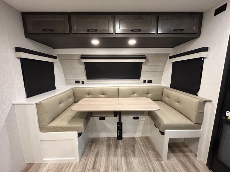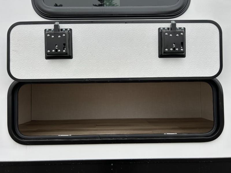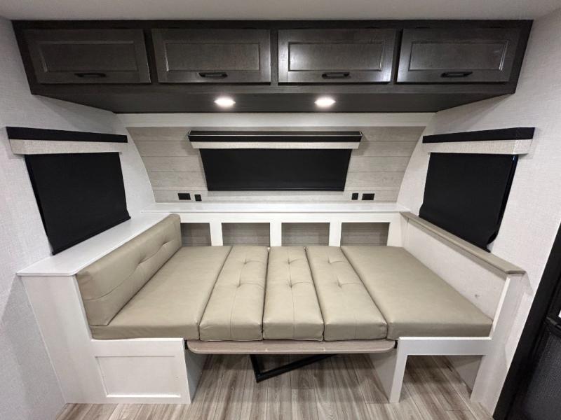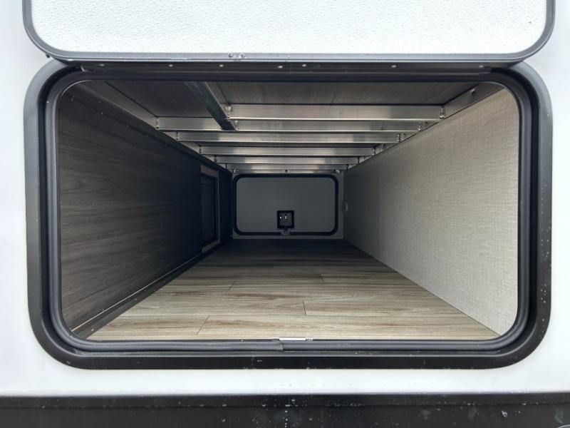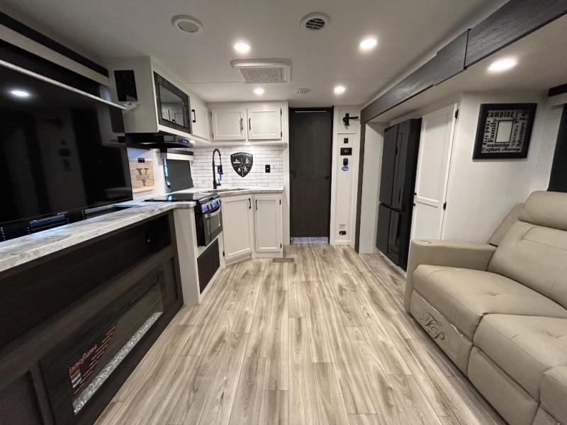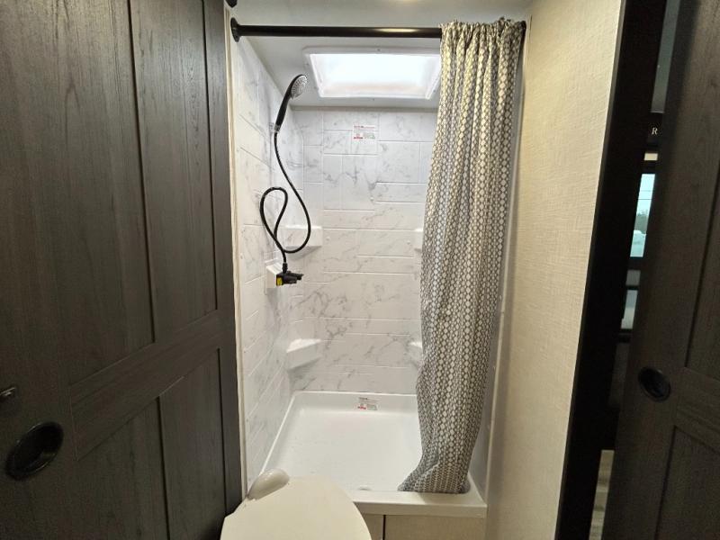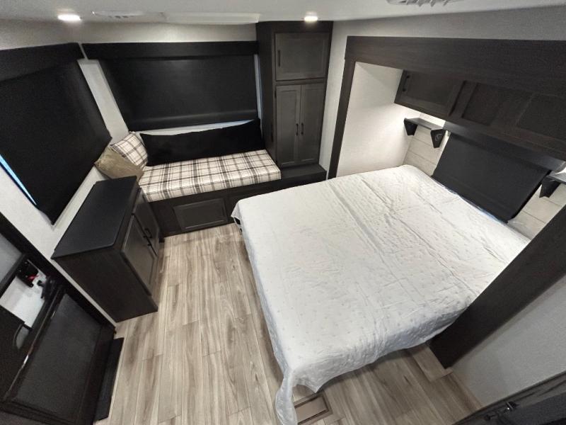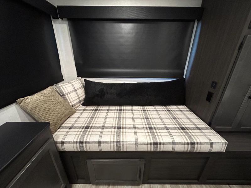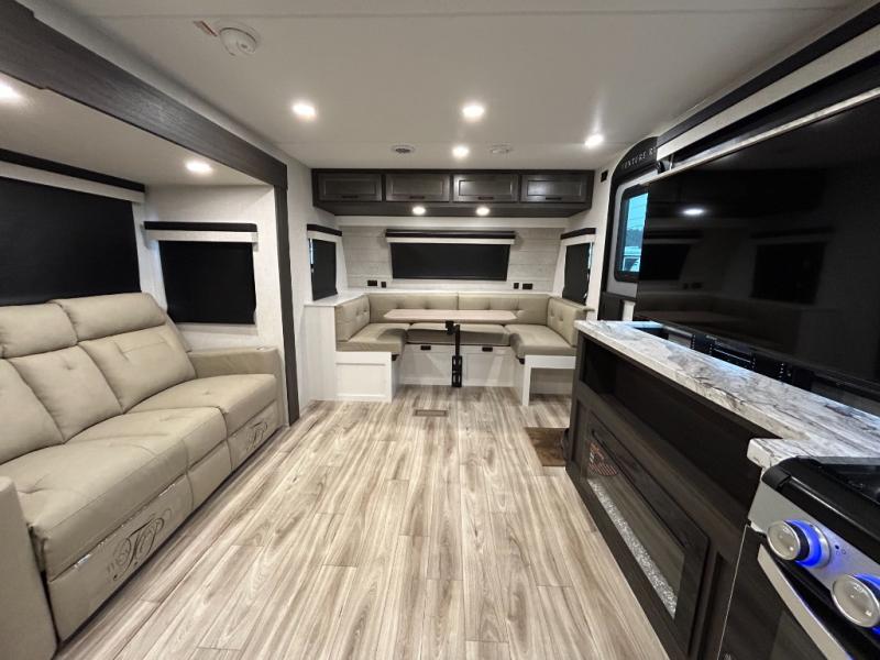Step inside through one of the two entry doors and you’re welcomed into a thoughtfully designed living and dining area that blends comfort and functionality. At the front, a spacious 42" x 80" U-dinette with a swivel table offers plenty of room to enjoy meals, gather with friends, or play board games. In the slide-out, theater seating with built-in USB ports provides a cozy place to relax, it is next to the 10 cu. ft. refrigerator and pantry for easy access to groceries and dry goods. Across, the kitchen is equipped with essentials including a large stainless steel sink, three-burner cooktop, and ample overhead cabinetry for snacks and cookware. Unwind in the evening with the fireplace and 50" raise-and-lower TV, perfect for movie nights after a day of adventure. The walk-through bathroom features a 30" x 36" shower, making it easy to get ready for the day. At the rear, the bedroom offers a 60" x 80" Sleep Tight queen bed in a slide-out for extra walking space, along with a dresser and bench seat for added comfort. A second entry door in the bedroom provides convenient access for early mornings or quick trips outside.
