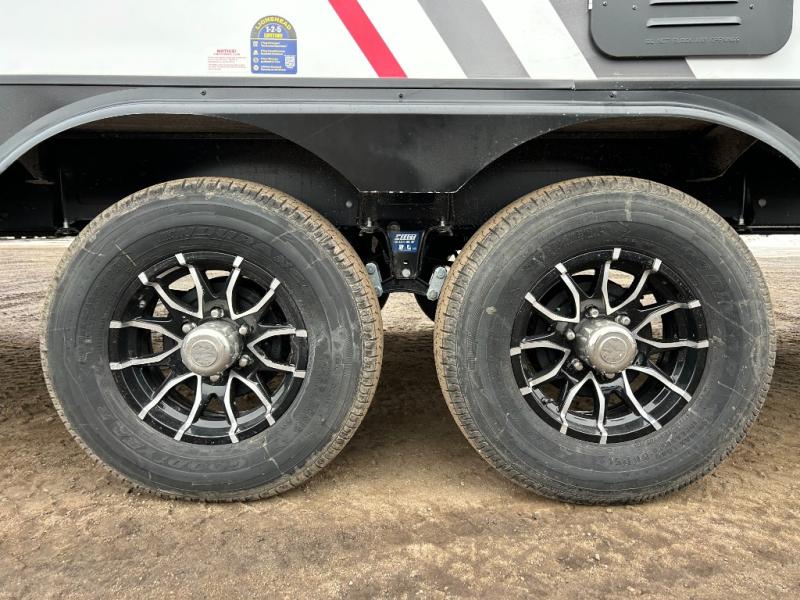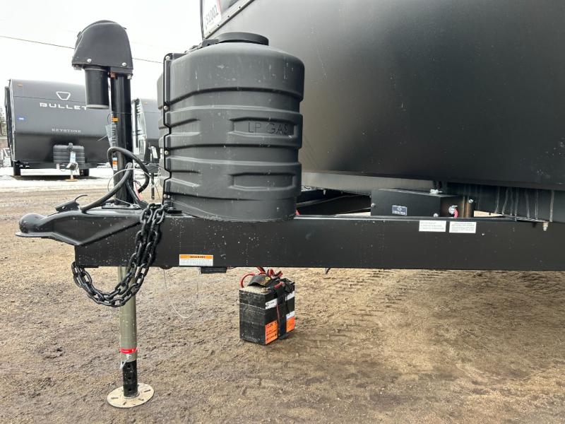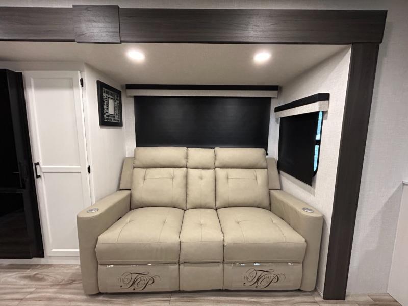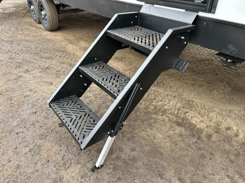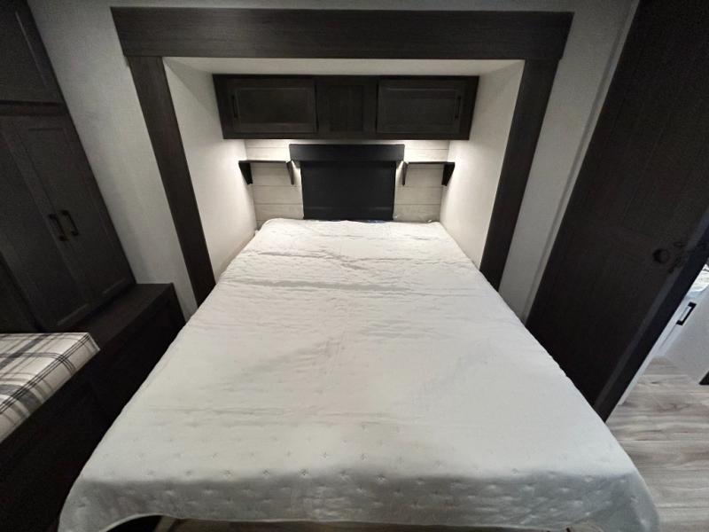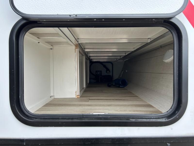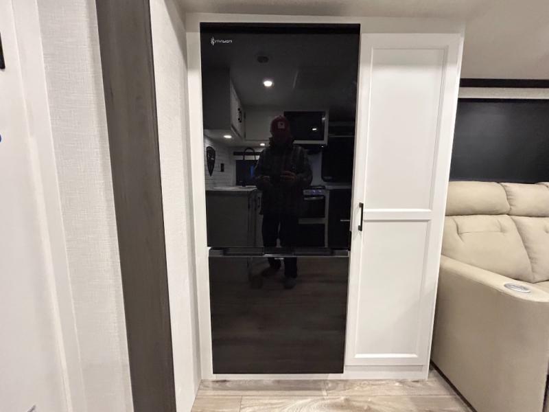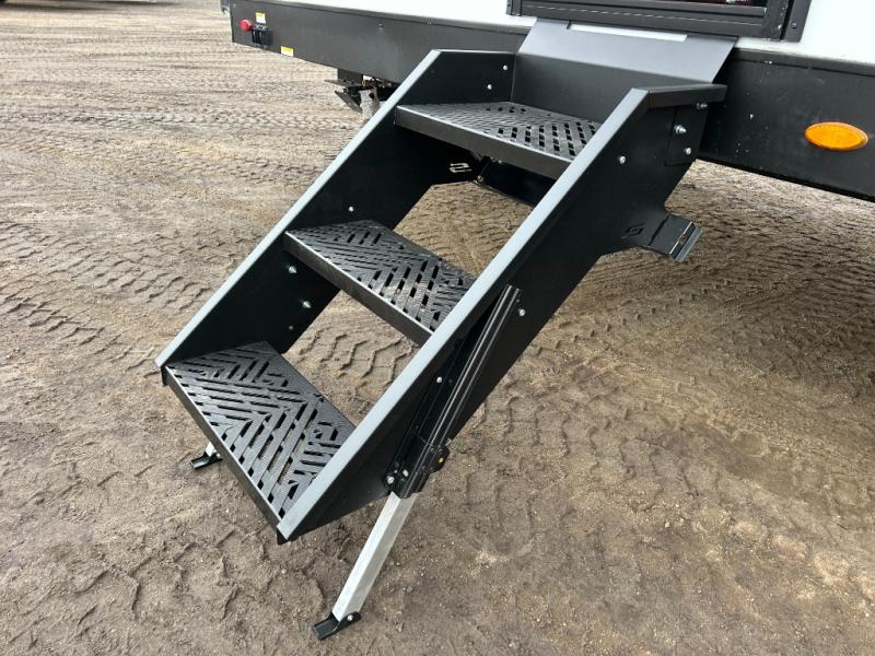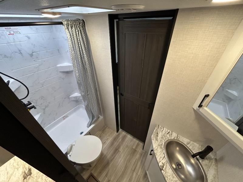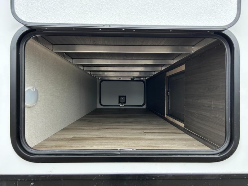 Step inside through one of the two entry doors and you’re welcomed into a thoughtfully designed living and dining area that blends comfort and functionality. At the front, a spacious 42" x 80" U-dinette with a swivel table offers plenty of room to enjoy meals, gather with friends, or play board games. In the slide-out, theater seating with built-in USB ports provides a cozy place to relax, it is next to the 10 cu. ft. refrigerator and pantry for easy access to groceries and dry goods. Across, the kitchen is equipped with essentials including a large stainless steel sink, three-burner cooktop, and ample overhead cabinetry for snacks and cookware. Unwind in the evening with the fireplace and 50" raise-and-lower TV, perfect for movie nights after a day of adventure. The walk-through bathroom features a 30" x 36" shower, making it easy to get ready for the day. At the rear, the bedroom offers a 60" x 80" Sleep Tight queen bed in a slide-out for extra walking space, along with a dresser and bench seat for added comfort. A second entry door in the bedroom provides convenient access for early mornings or quick trips outside.