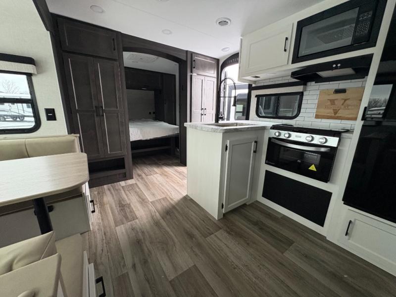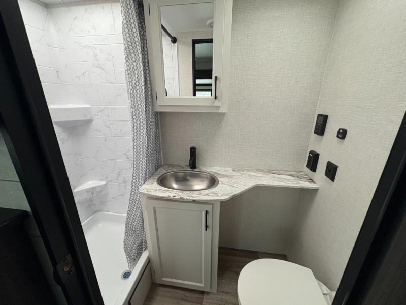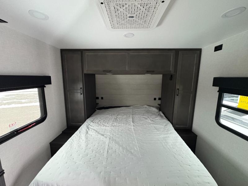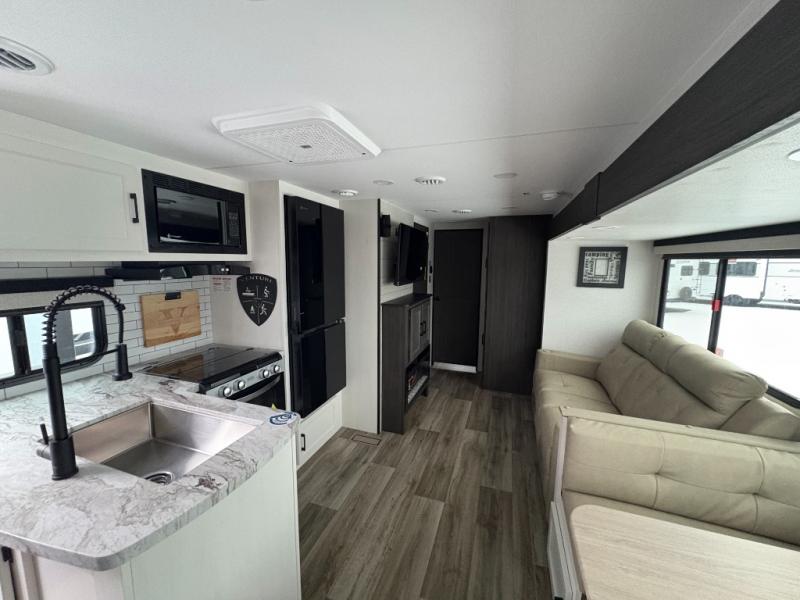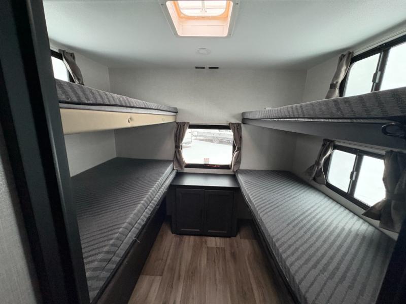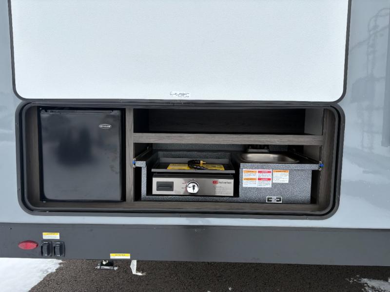 You, your kids and/or friends, and your pets can all have a relaxing camping trip in this travel trailer! The unique rear private bunkhouse has a set of 32" x 70" bunk beds, and a set of 28" x 70" bunks where the top bunk flips up, and its ability to convert into a desk, king bed, storage, or a pet palace. Just outside the bunkhouse is a full bathroom with a 30" x 36" shower to freshen up in each morning. Everyone can gather together at the 70" sofa and 42" booth dinette while watching a movie and enjoying the fireplace at the entertainment center. The front private bedroom has sliding doors to shut when you're ready to sleep on the sleep tight queen bed. Prepare your meals either indoors with the three burner cooktop or at the outside campfire café with the griddle, refrigerator, and sink!